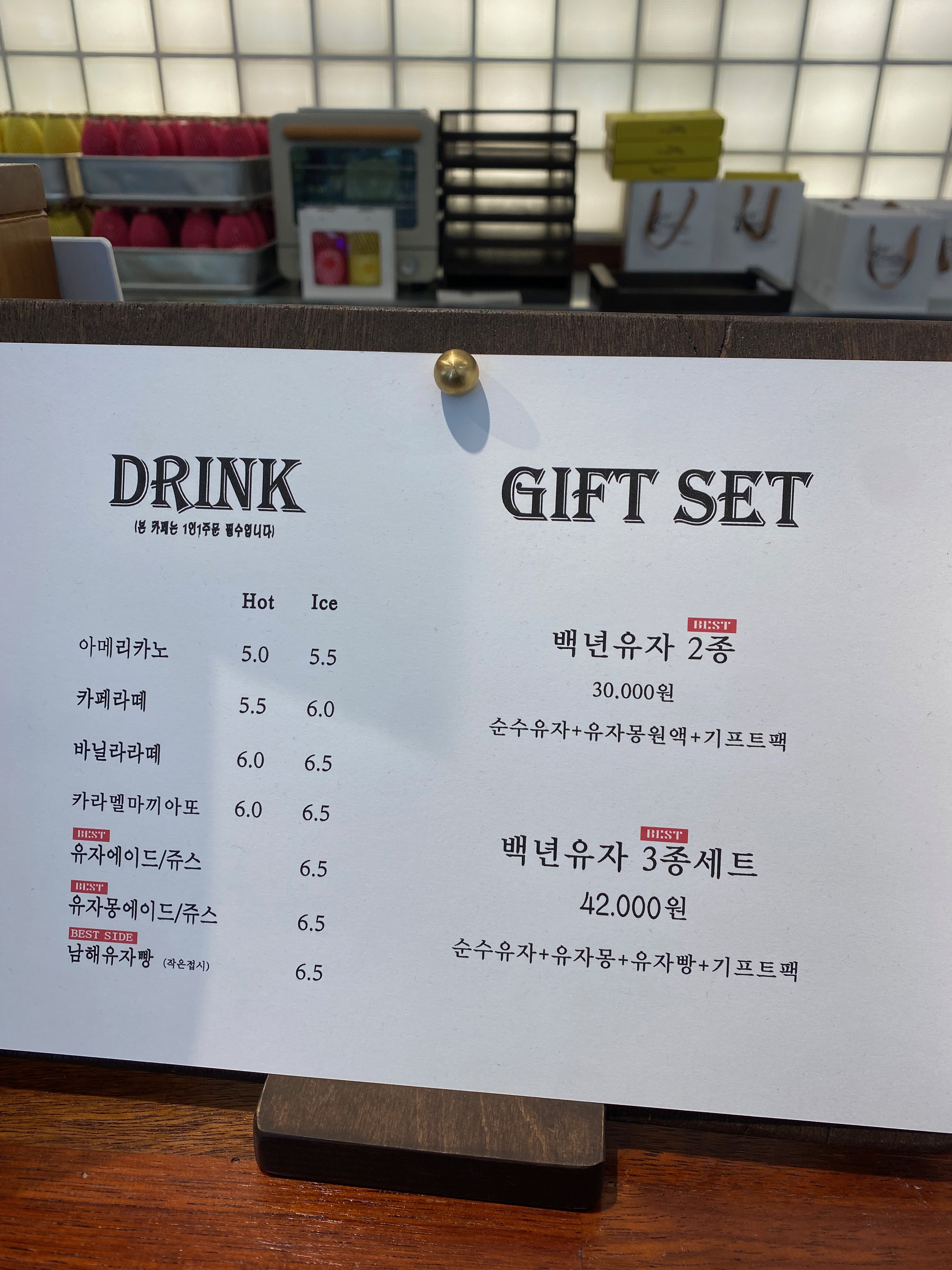 여기는 2호점이라 음료는 얼마든지 단품으로 주문이 가능한데 선물세트는 원액 2종 세트 또는 원액과 유자빵으로 되어 있는 3종 세트 딱 두 가지 밖에 판매를 안 하고 있었습니다. 유자빵이 무척 궁금했는데 직원 왈~ 1호점에는 빵만 따로 구입 가능하다고 귀띔을 해주더군요. 위치를 검색해 보니 집으로 가는 남해 나가는 길목에 있어서 빵은 1호점에서 구입하기로 하고 저희는 그냥 유자쥬스, 유자에이드, 커피 요렇게 음료만 주문을 했습니다.