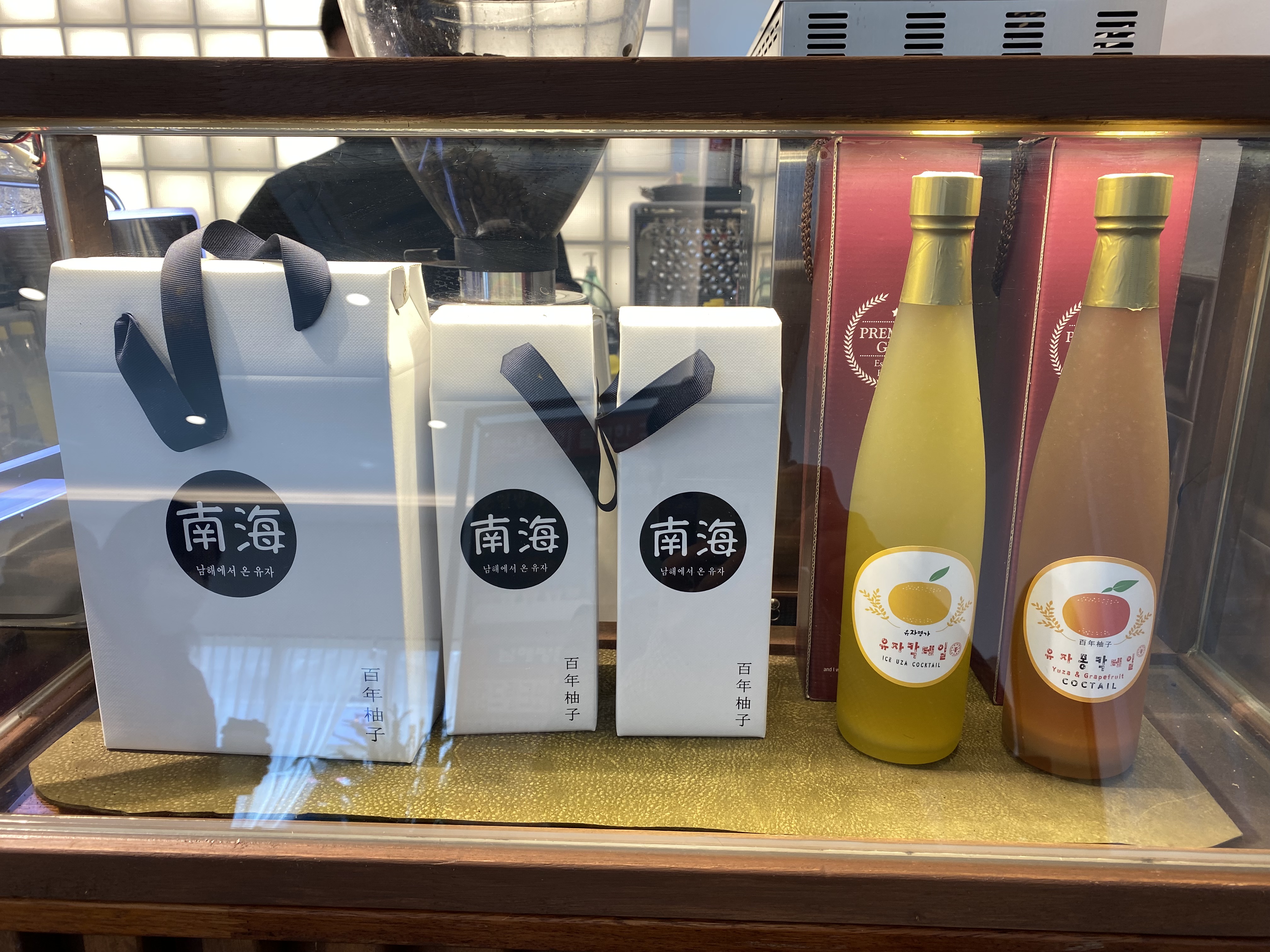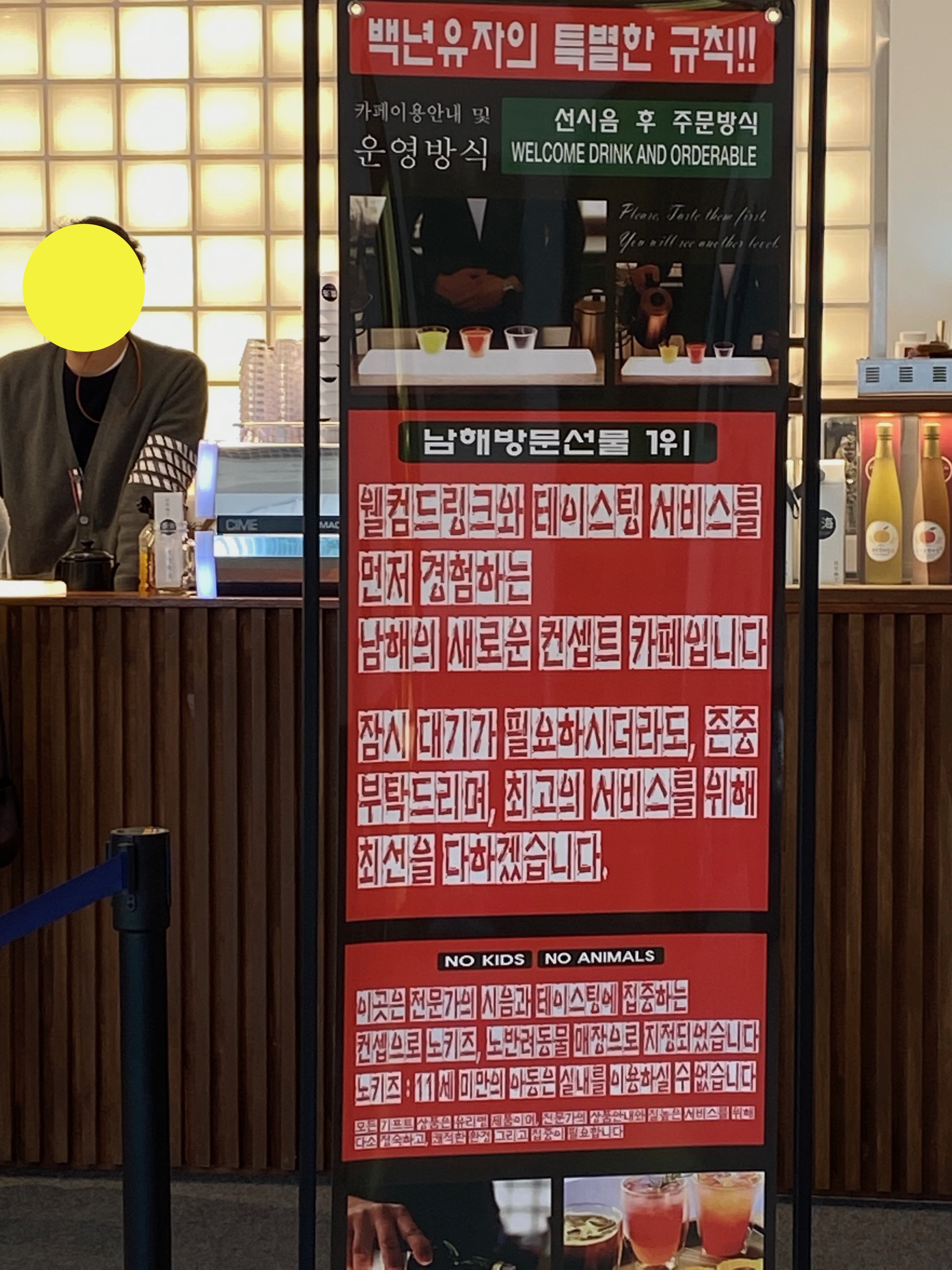 실내를 들어가 보니 아하.... 노키즈존.... 여기서 돌아다니다 아이가 크게 다쳤다나 봐요~ 그래서 저희 아들은 잠시 대기~~ 카운터에 가면 무료로 두 가지 맛 음료를 시식할 수 있습니다. 유자 농축액과 유자몽농축액을 물에 희석시켜 쥬스로 음료 시식을 했는데 저는 유자쥬스파고 와이프님은 유자몽쥬스파로 나눠지네요.