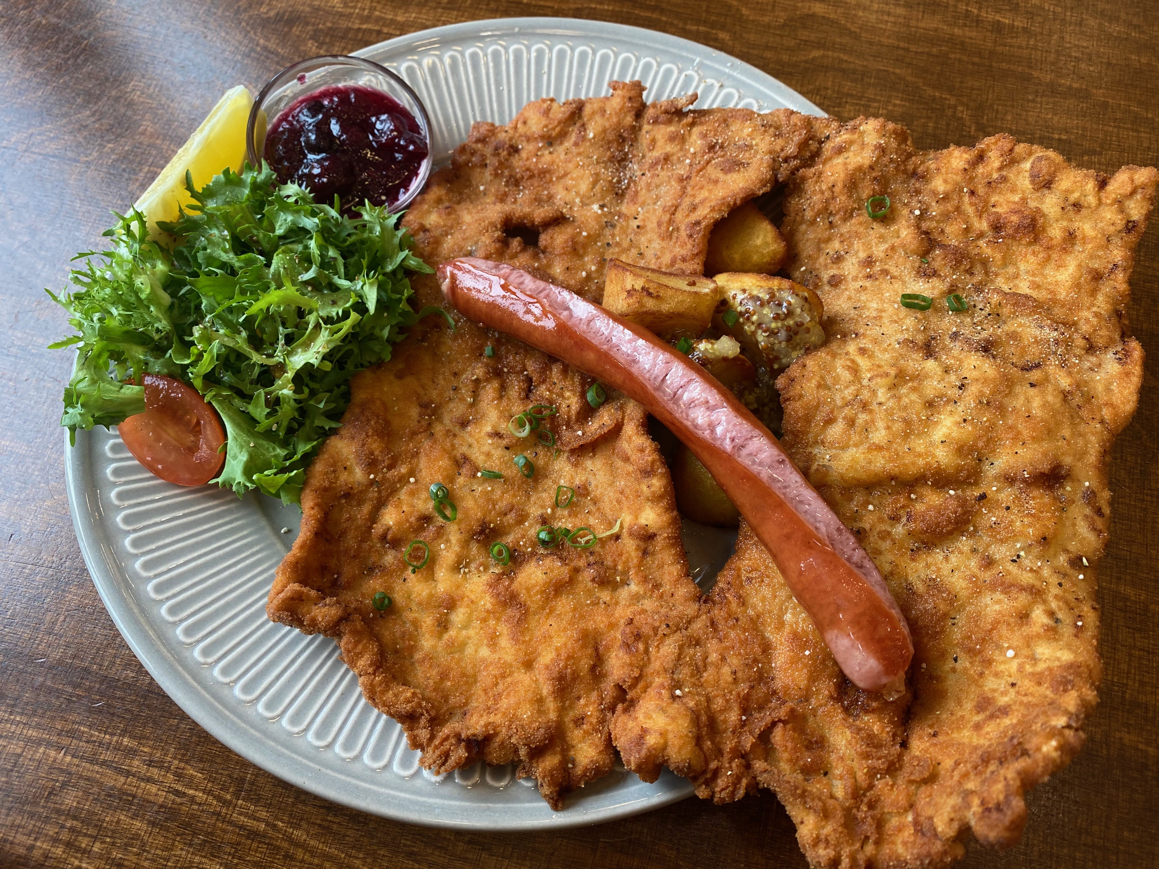 먹음직스러운 대왕 슈바인 슈니첼이 나왔고 그 위에 카바노치 독일식 소시지가 함께 올려져 있습니다. 슈니첼은 옵션이라 선택이 가능한데 슈바인 슈니첼이 돼지고기입니다. 닭고기를 선호하시는 분들은 휘너 슈니첼로 옵션 선택하면 됩니다.