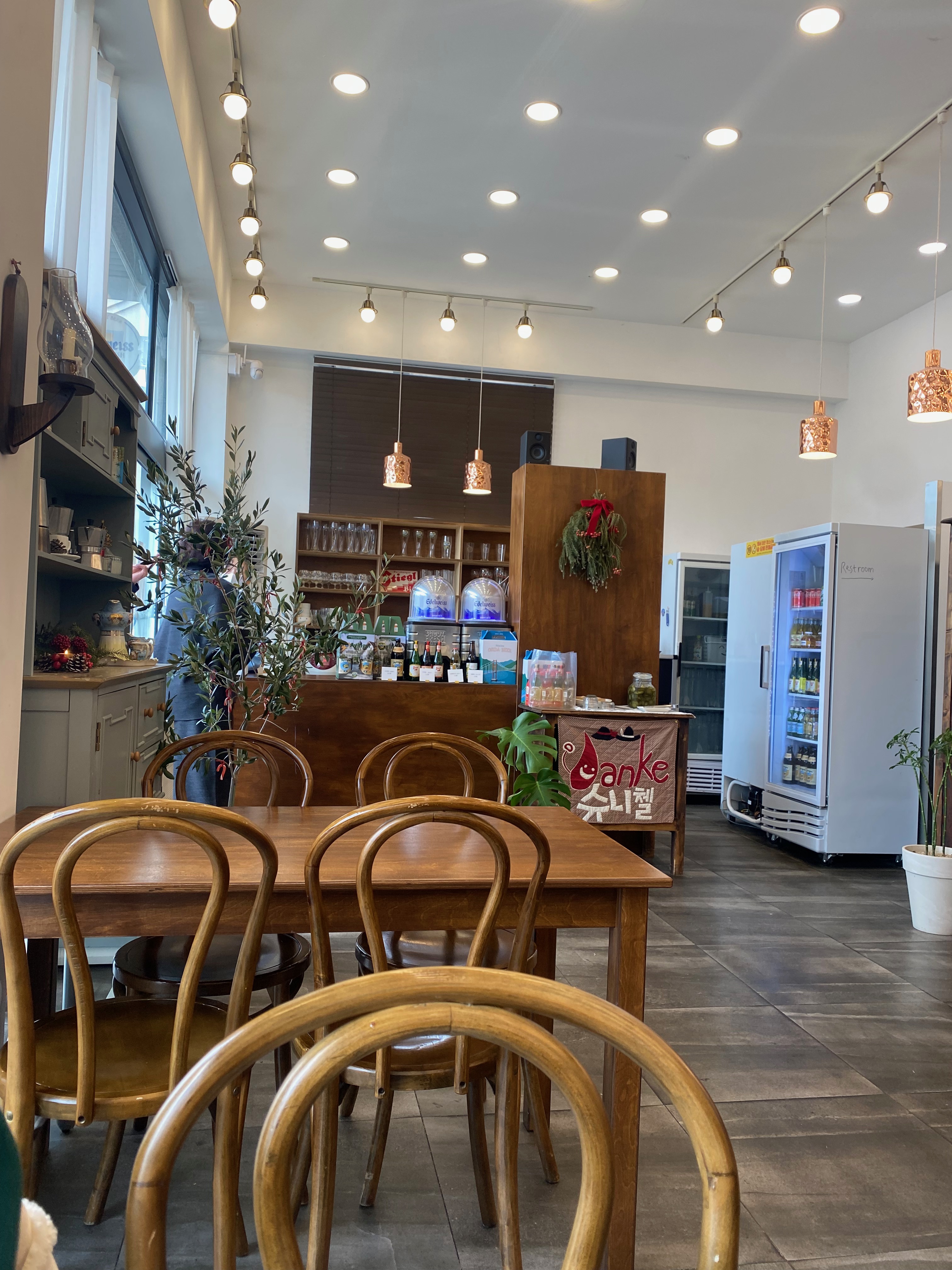 독일마을 뷰가 좋은 쪽은 규모가 큰 식당과 카페들이 자리를 차지하고 있는데 당케슈니첼 식당은 그 맞은편 도로가에 위치해있어서 아쉽게도 탁 트인 뷰를 보는 건 어렵습니다. 규모도 큰 식당에 비해 절반도 안 되는 크기고요. 실내를 들어가 보니 테이블도 조밀 조밀 최대한 많은 인원을 받기 위해 공간 활용을 많이 하려고 애쓴 모습입니다. 2층으로 올라가는 계단도 보이는데 출입 금지로 막아놨습니다. 1층 공간만 식당으로 활용하고 있습니다.