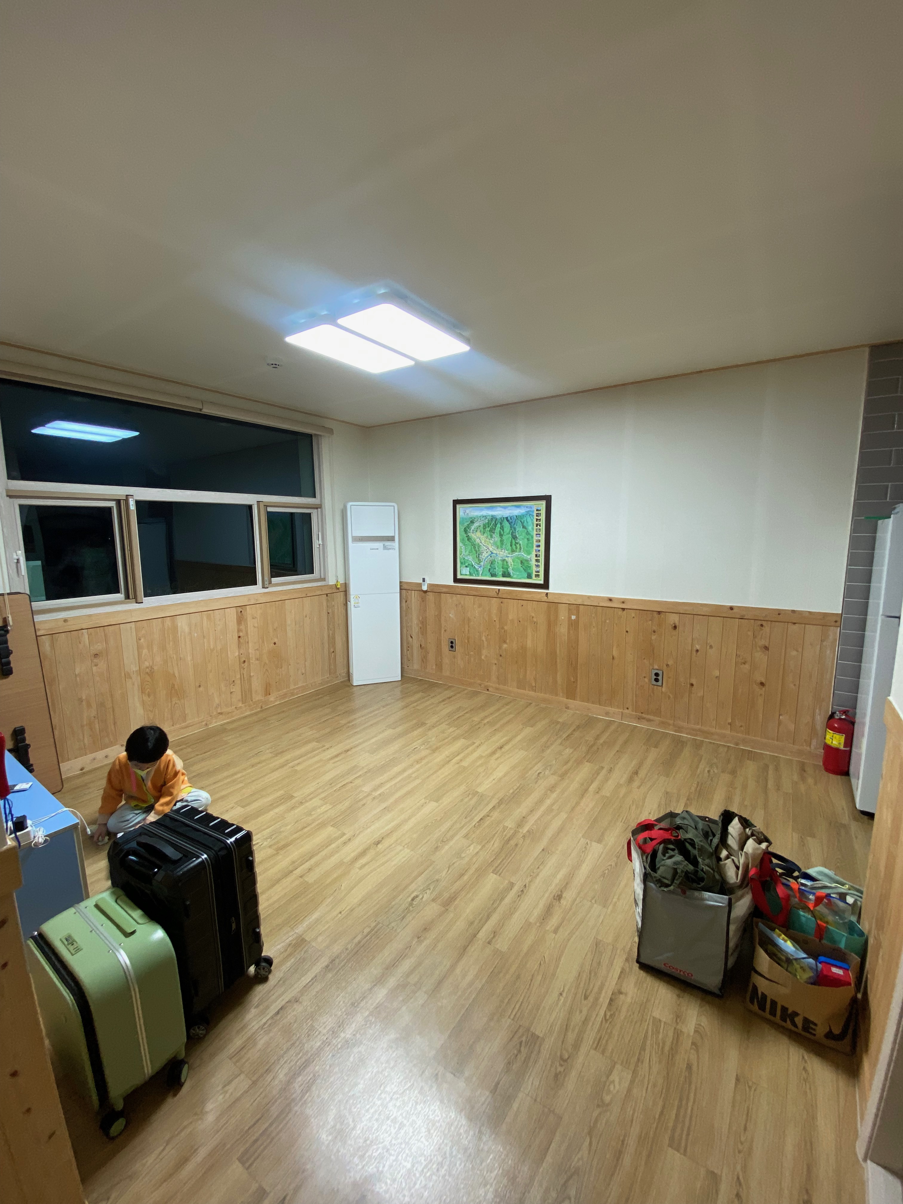 부엌이 작아서 조금 아쉽지만 큼지막한 방 두 개에 넓은 거실 거기다 샤워실 겸용 화장실 두 개가 갖춰져 있어서 최소 두 식구 이상 구례 여행을 계획하고 있는 분들이라면 요 삼도봉 숙소를 강추합니다. 실제 저희는 지인 부부와 함께 총 5명이 이곳 숙소에 머물렀는데 사용함에 있어 불편함이 전혀 없었습니다. 아들과 엄마는 화장실 사용으로 1층 거실에서, 지인 부부는 1층 큰 방에서, 저는 여행지에서 여러 사람 잠 못 자게 할 필요가 있을까 싶어 자진해 넓디넓은 2층 독방을 아주 큰대자로 뻗어 숙면을 취했답니다. 코골이가 남다릅니다ㅠㅠ
