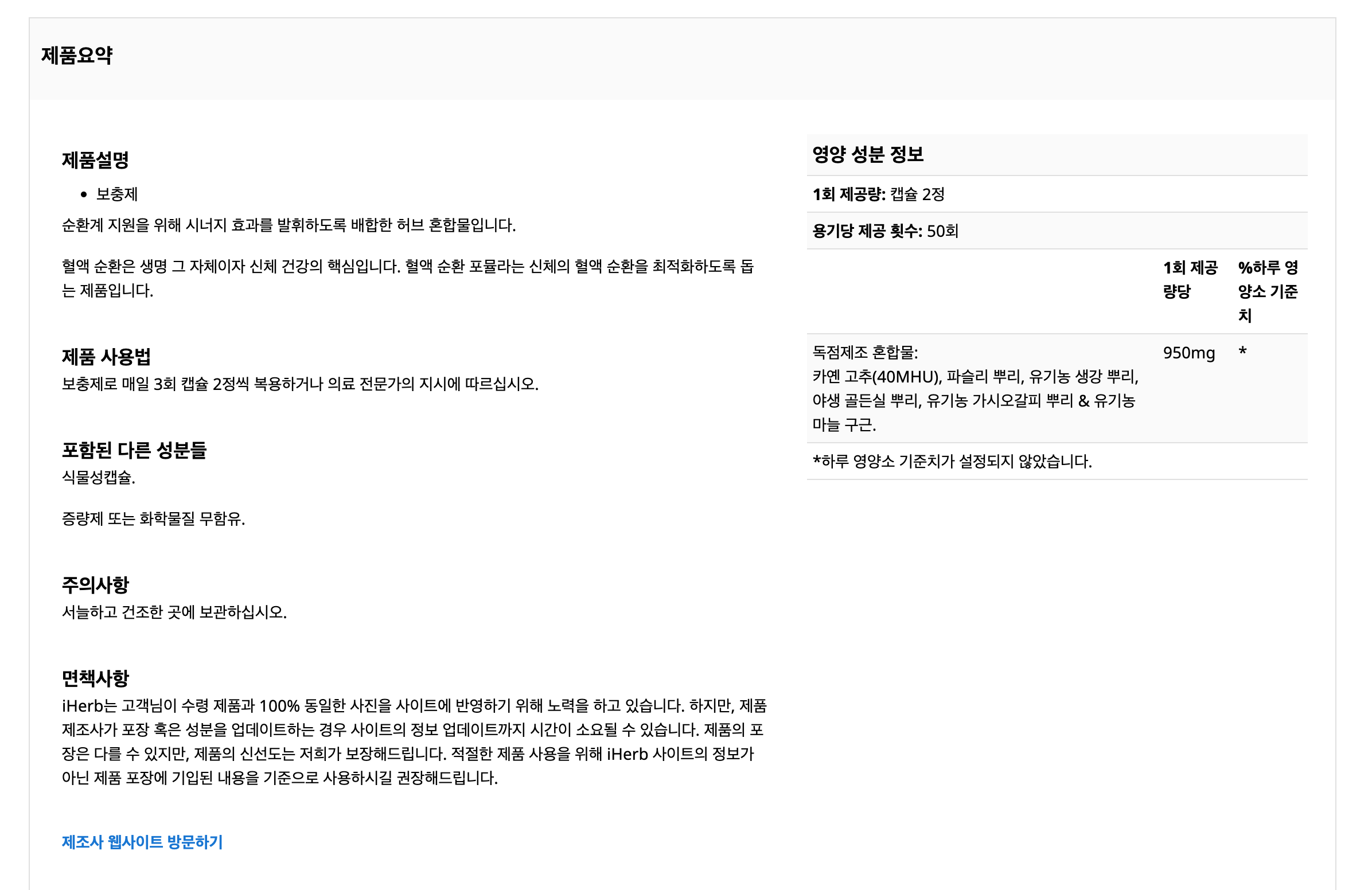 이 영양제에 대한 정보도 위쪽은 아이허브에서 나와있는 정보를 캡처해서 올려놓은 거고 아래쪽은 쿠팡에서 제공되는 정보입니다.