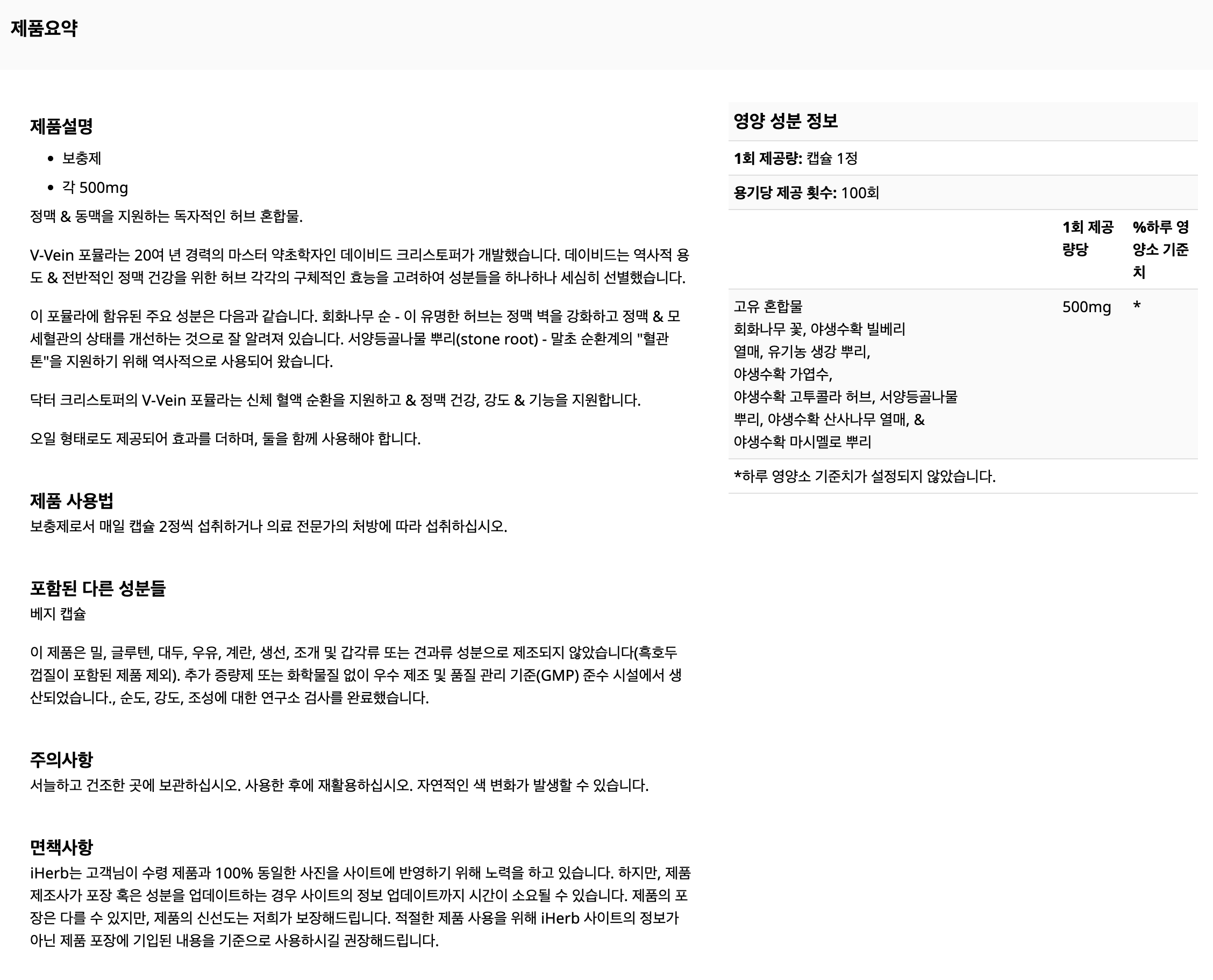 다시 본론으로 들어가서 아이허브 사이트에서 구입한 제품은 ' christoper's 오리지널 포뮬라 V-Vein 영양제와 Blood Circ 포뮬라 영양제'입니다. 사진상에서는 두 가지 제품을 동시 구입한 걸로 보일 수도 있지만 영양제가 개인차가 심한 거 같길래 일단 하나 먹어보고 잘 맞으면 추가 다른 제품도 같이 구입한다는 생각으로 V-Vein 영양제를 먼저 구입해서 한 달간 복용을 해보고 난 후에 효과가 있다고 판단되어 추가로 구입한 Blood Circ 영양제입니다.