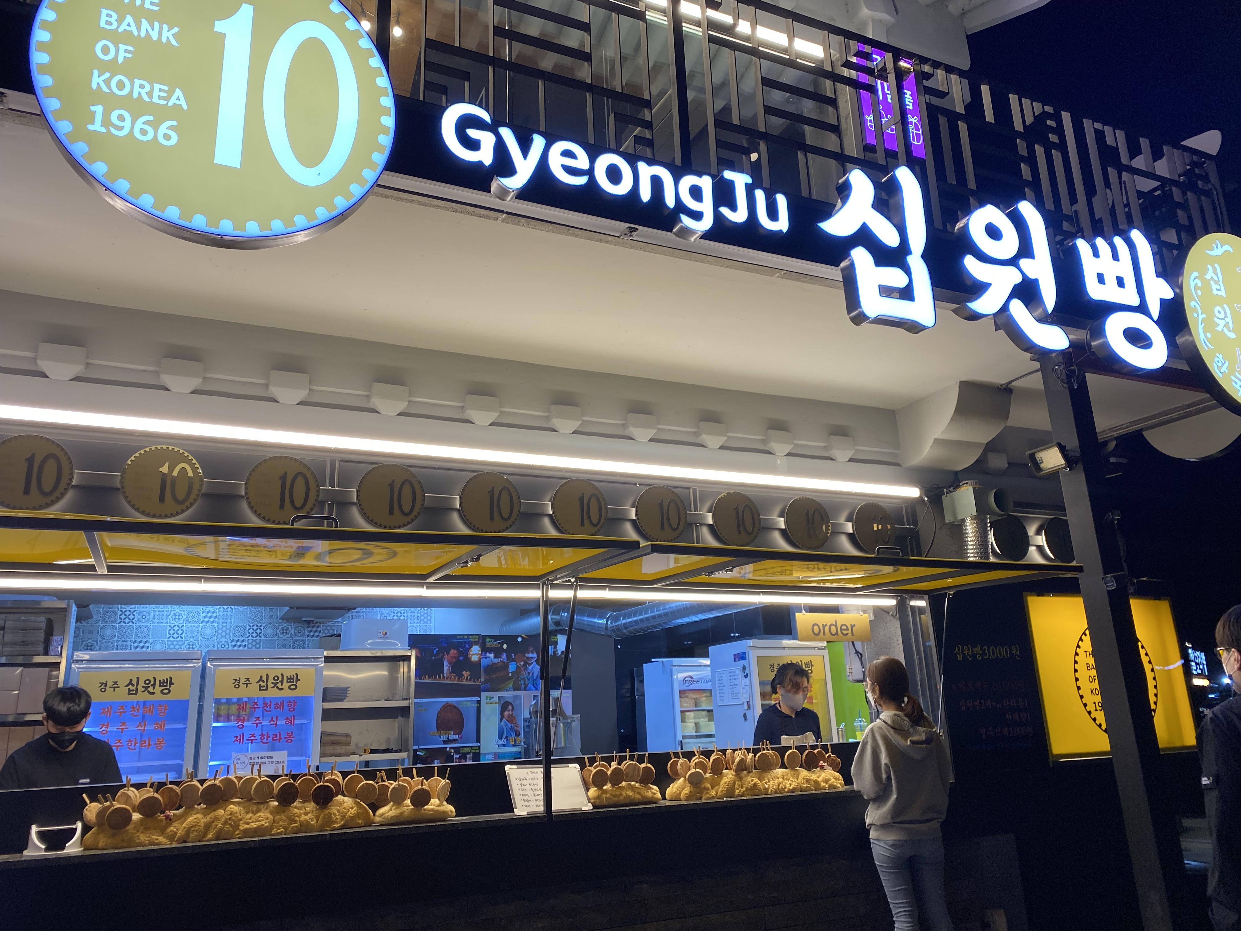 4월 초순이었나? 일요일 오후 시간을 틈내서 경주 벚꽃 나들이를 다녀왔습니다. 보문단지를 갔었는데 아쉽게도 벚꽃은 엔딩..... 몇몇 군데에만 남아있었고 대부분은 다지고 관광객들만 북적이는 풍경이었지요. 아쉬운 마음에 아들에게 옛날 사람들이 별 관찰을 하던 곳을 얘기해 주고 첨성대라는 곳을 보러 가기로 했습니다. 그런데 말입니다. 다들 보문에서 아쉬웠던지 첨성대에 사람들이 엄청 북적이더군요. 가는 길이 꽉꽉~ 해가 기울고 저녁이 금방 되어 버려 더 늦기 전에 급하게 저녁 식사를 해결해야 했습니다. 첨성대 맞은편 공영 주차장에 운 좋게 주차를 하고 근처 식당을 두리번거리다 마지막 주문을 받는 쌈밥집에 가서 겨우겨우 한 끼를 해결할 수 있었지요. 그러고 나서 첨성대로 향하는데 사람들이 엄청 줄 서서 뭔가를 사 먹으려고 하는 풍경이 눈에 들어왔습니다. 그곳은 바로바로 '경주 십원빵'입니다. 커다란 간판에 예전 십원짜리 동전이 걸려있고 십원빵이라고 판매를 하고 있었는데 긴 줄로 와~여기 맛집인가 보다... 핫플이네 핫플~!! 이람서 우째 그냥 지나치겠습니까!!! 맛을 봐야지요. 가격이 하나에 3천 원이었던가.... 가물가물... 사기 바빠서 정확한 가격은 직접 가서 구매할 때 한번 확인들 해보세용^^
