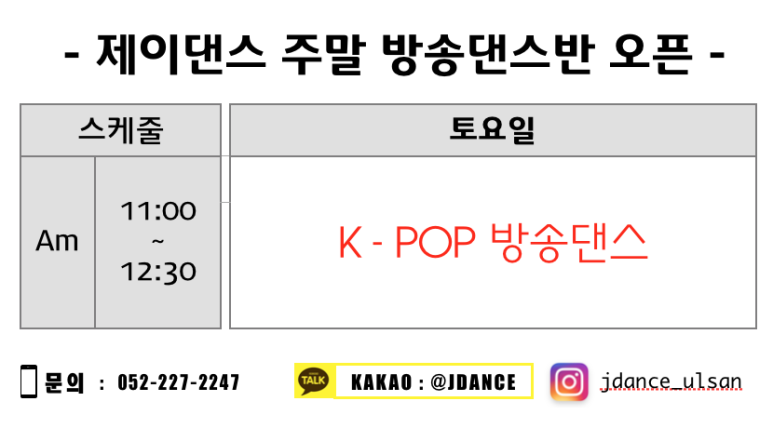 이번 주 토요일(4/30)부터 주말반 케이팝 방송댄스 수업을 신규로 오픈합니다. 그동안 주말반 케이팝 수업 문의가 꾸준하게 있었는데요, 드디어 개설하게 되었습니다. 해당 수업은 특별히 나이, 성별 제한을 두지 않습니다. 케이팝 방송댄스를 누구나 쉽게 매울 수 있게 활짝 열어놓을 계획입니다. 평일에 직장 다니느라, 학원 다니느라 배우고 싶어도 시간이 안되는 모든 분들이 그 대상입니다. 위드 코로나 시대에 맞춰 인원 제한도 두지 않으려고 하는데 원활한 수업 진행을 위한 수용 가능 인원은 20명 되겠습니다. 스트레스도 풀고 최신 유행하는 가요 안무도 배울 수 있는 제이댄스 주말 방송댄스에 많은 관심과 참여 바랍니다^^
