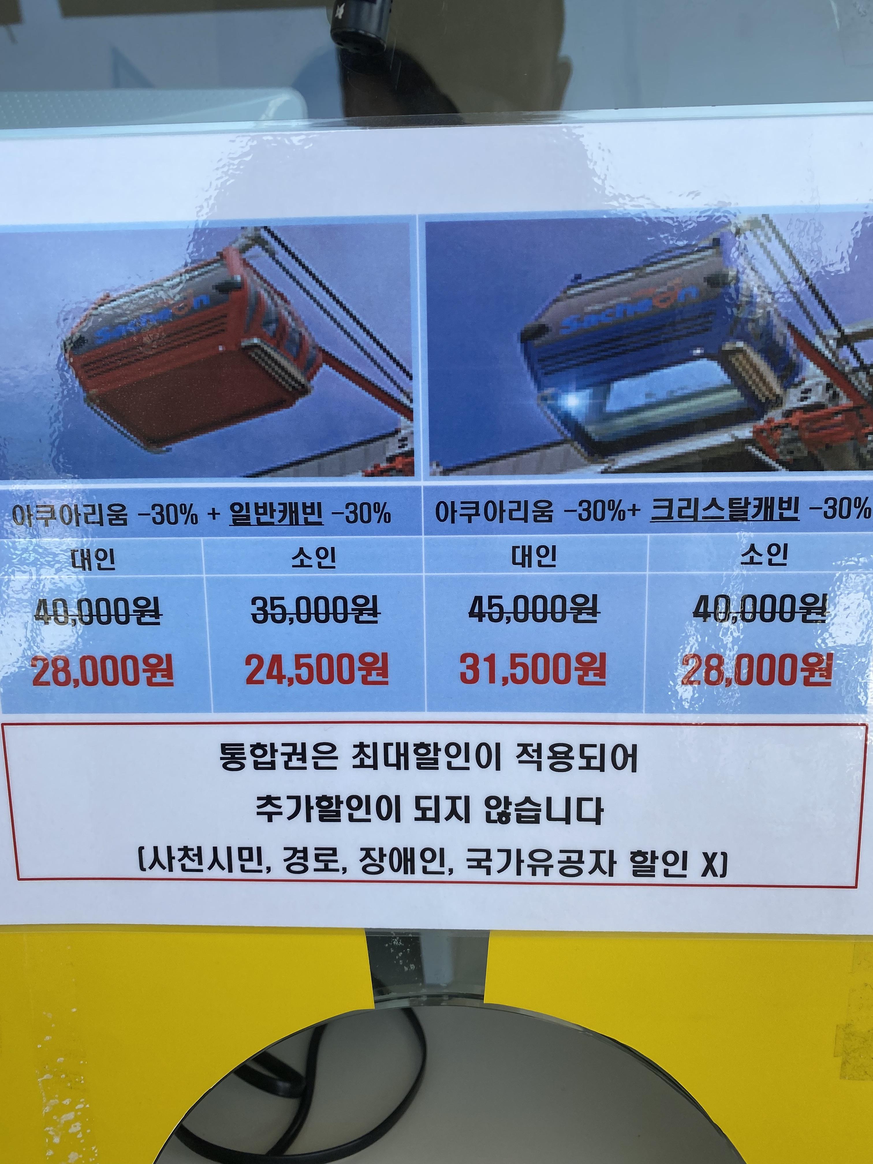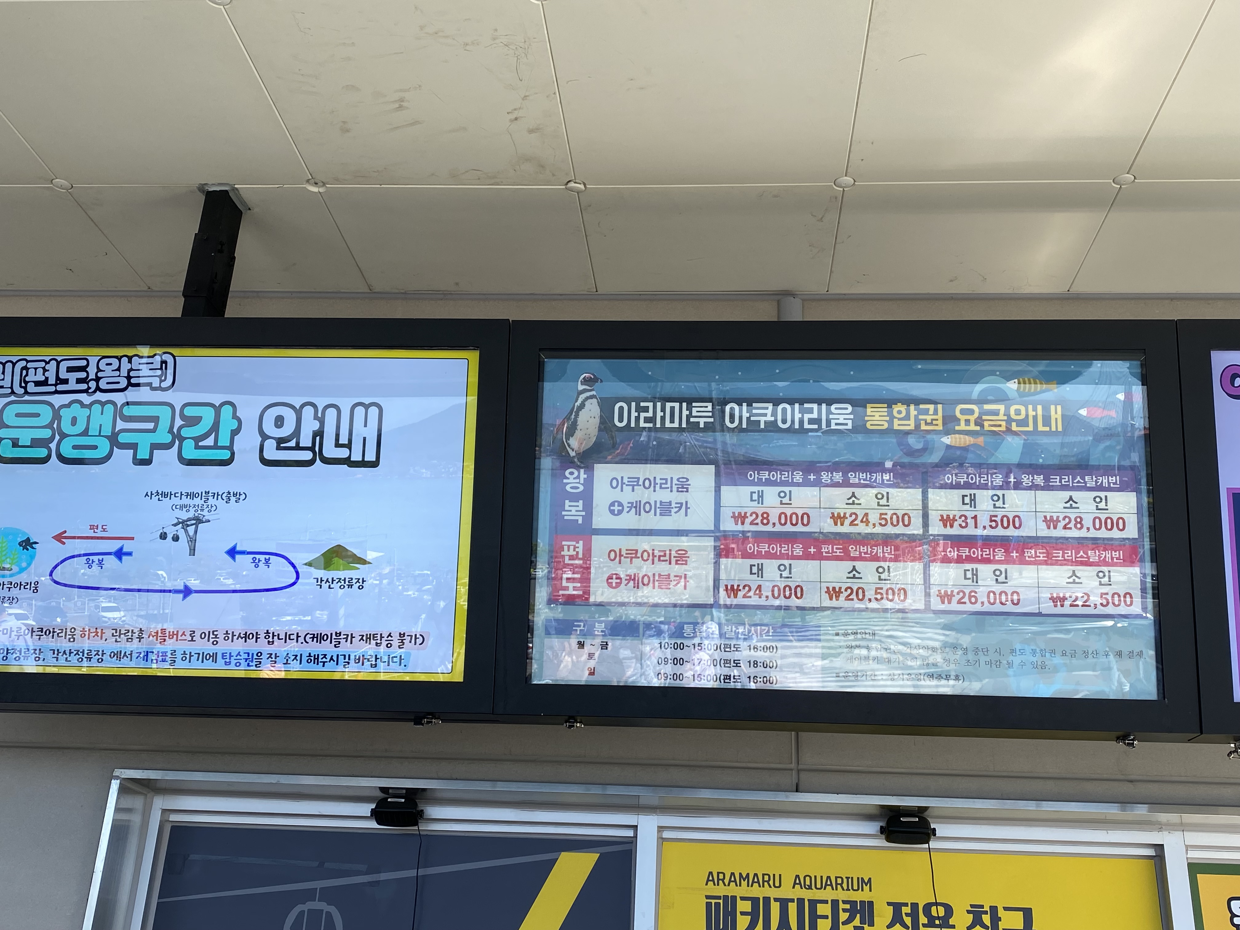 이용권 구입에 관련해 자세히 안내를 해드렸는데 그래도 모르시겠다면 요것만 꼭 기억하세요. 케이블카든 아쿠아리움이든 개별로 구입하시는 거면 무조건 쿠팡에서 구입하는 게 싸다!! 하지만 편도든 왕복이든 케이블카와 아쿠아리움을 같이 이용하고 싶다면 무조건 현장에서 구입하시라!! 통합권은 온라인 구입이 안됩니다. 그래서 전 어떻게 했느냐~~~ 구입에 관련해 안내가 안 되어 있어서 급한 마음에 케이블카 따로 아쿠아리움 따로 ~ 3인 가족으로 아쿠아리움 구입가 66,000원 그리고 케이블카 이용권 구입가 54,000원(크리스털 캐빈) 총 12만 원을 선 구매했고 현장에 와서 왕복 통합권이 30% 싸게 구입 가능하다는 사실을 알고 급히 취소를 하고(부분 취소수수로 발생~ㅜㅜ) 왕복 통합권 3매를 구입했답니다. 구입 당시 분명 대인 2명과 소인 1명으로 밝혔는데 판매하시는 분이 소인 2, 대인 1로 결재를 했습니다. 취소 수수료가 발생해서 살짝 기분이 상했었는데 3,500원 절약을 할 수 있어서 다시 기분이 업 되었다는~^^ 암튼 3인 가족 기준으로 통합권을 현장에서 구입하면 91,000원이 발생됩니다. 따로 구입보다 대략 3만 원 정도 세이브할 수 있습니다. 거의 3인 밥 한 끼 값이 절약됩니다.