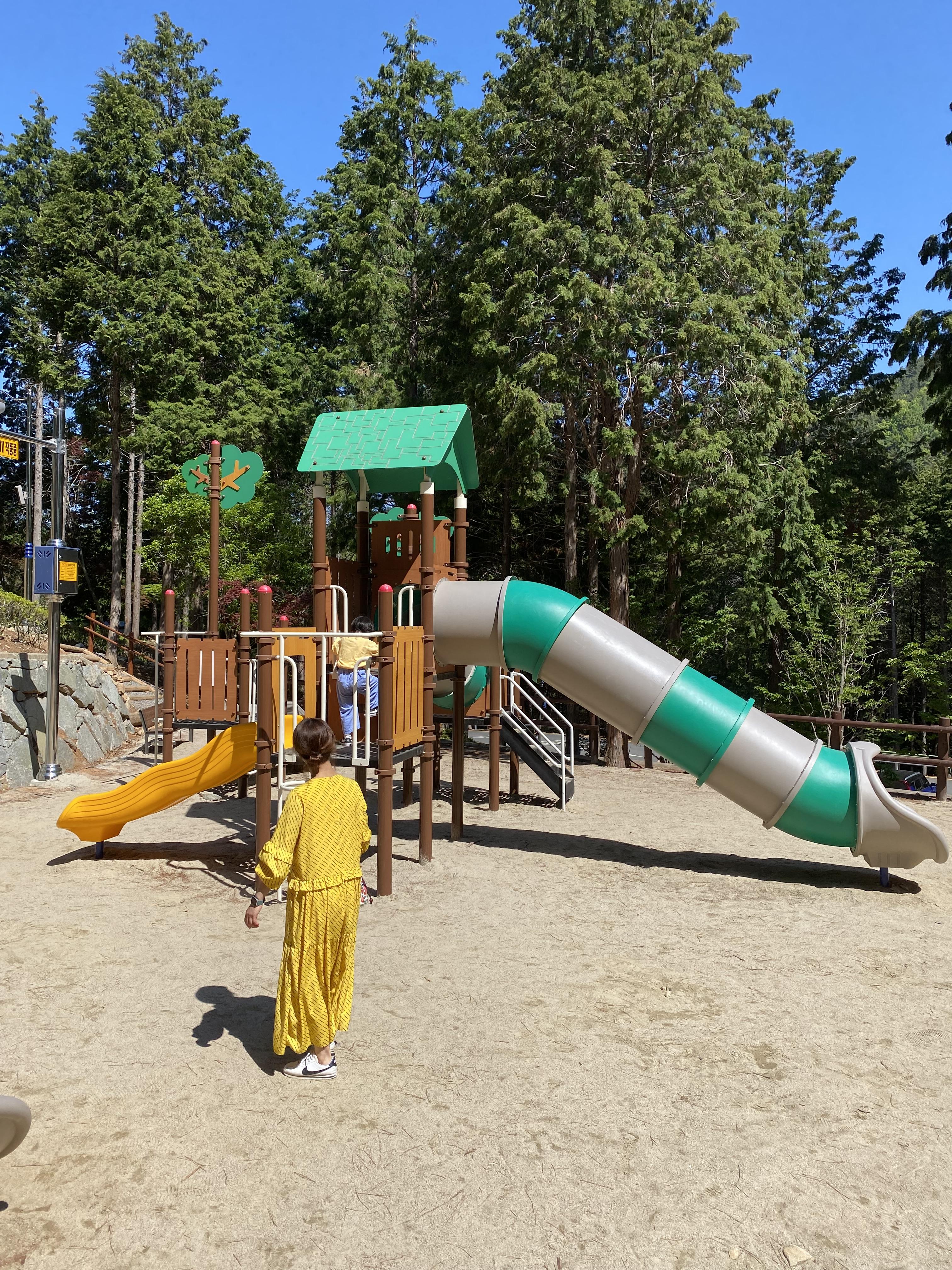 다양한 곳의 자연 휴양림을 이용해 봤지만 어린이 놀이터가 있는 곳은 첨 봅니다. 엄빠는 케이블카를 타러 가야 해서 맘이 바쁜데 아들은 무조건 여기서 놀고 가야 한다고~~~ 그네랑 집라인이랑 미끄럼틀이 있습니다.