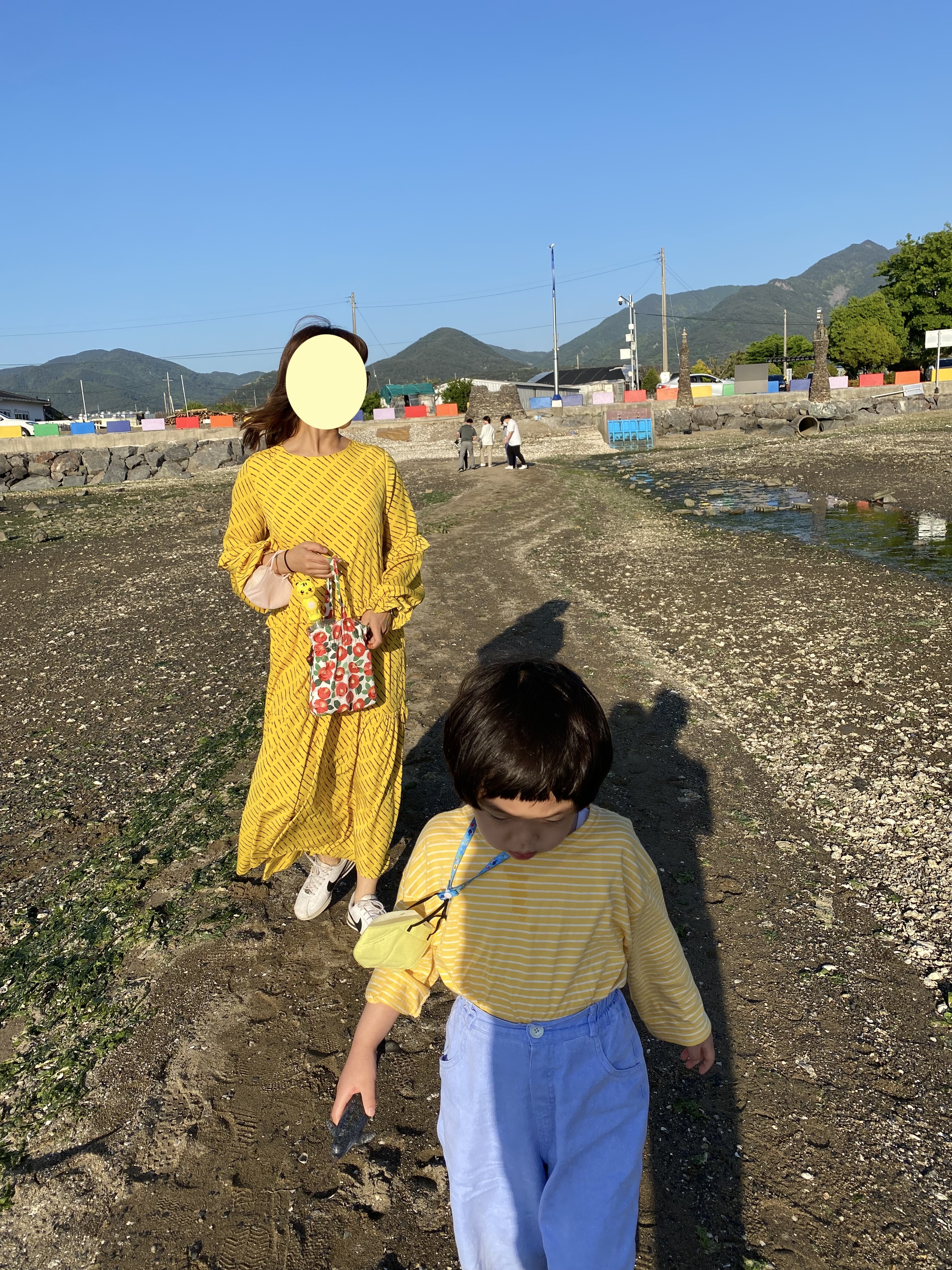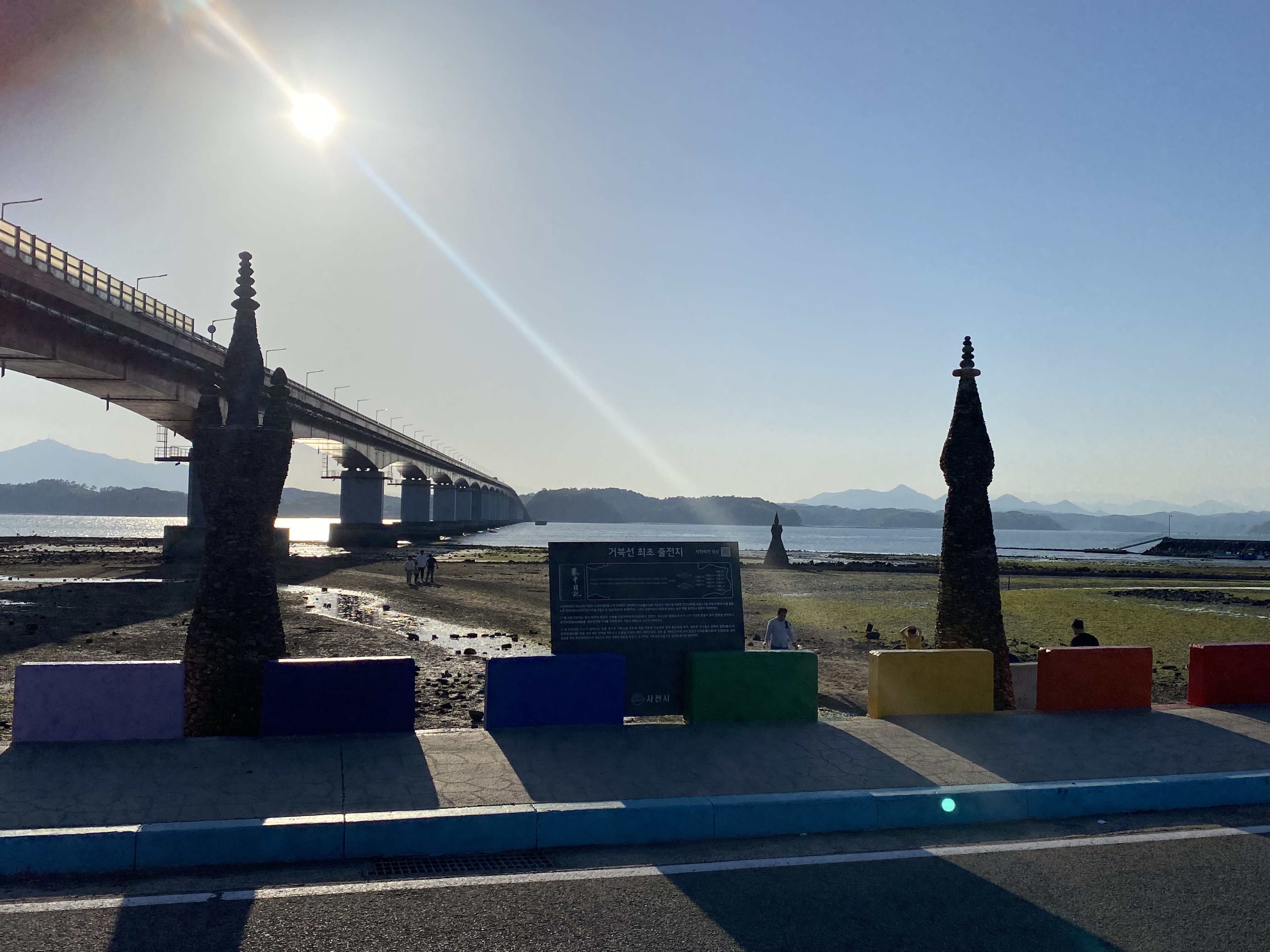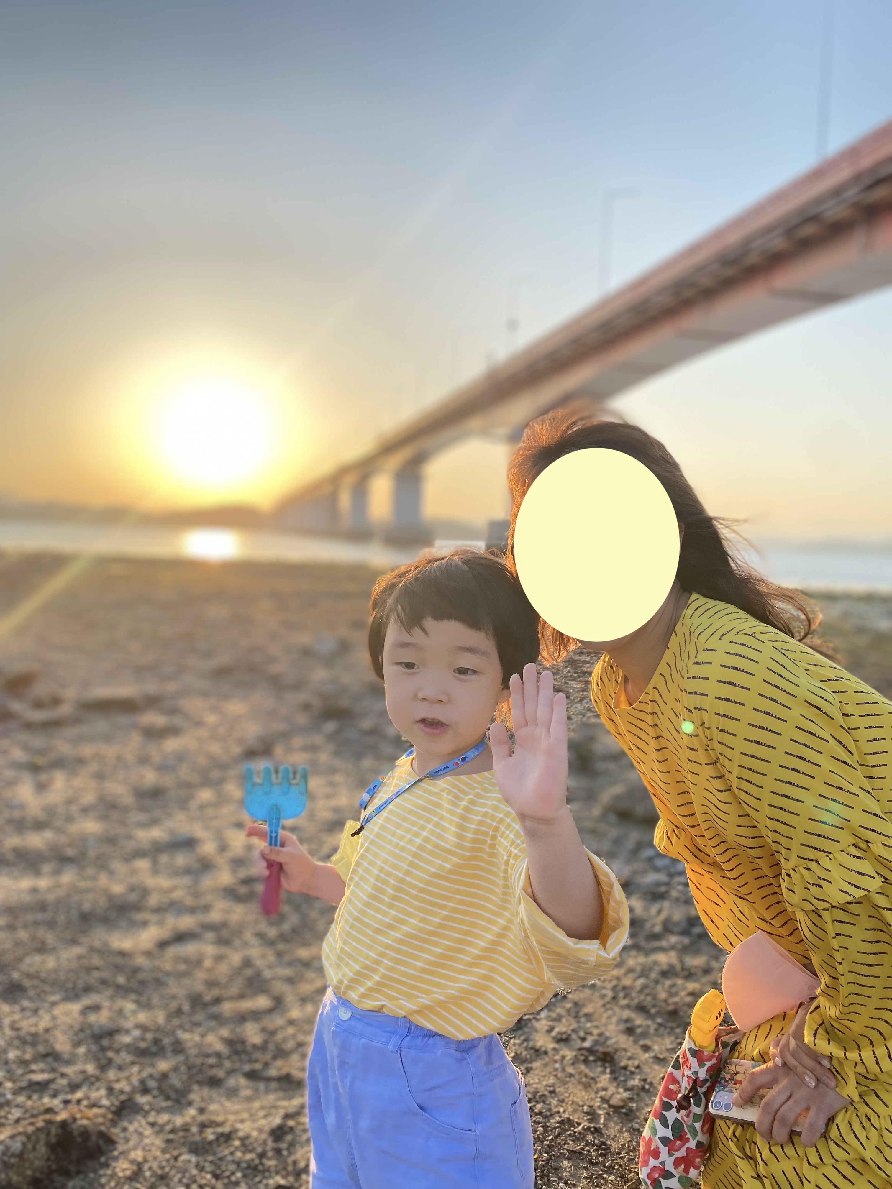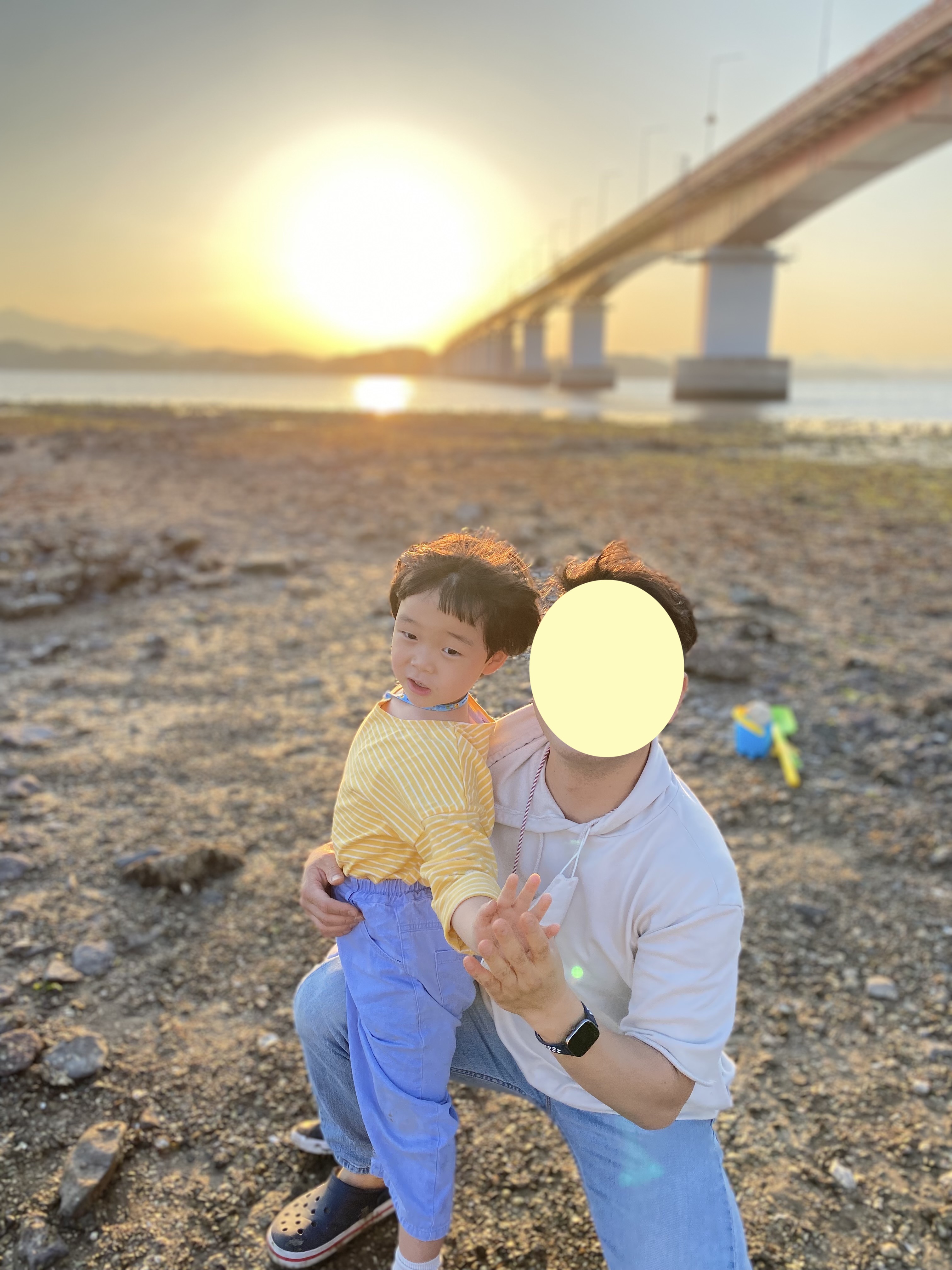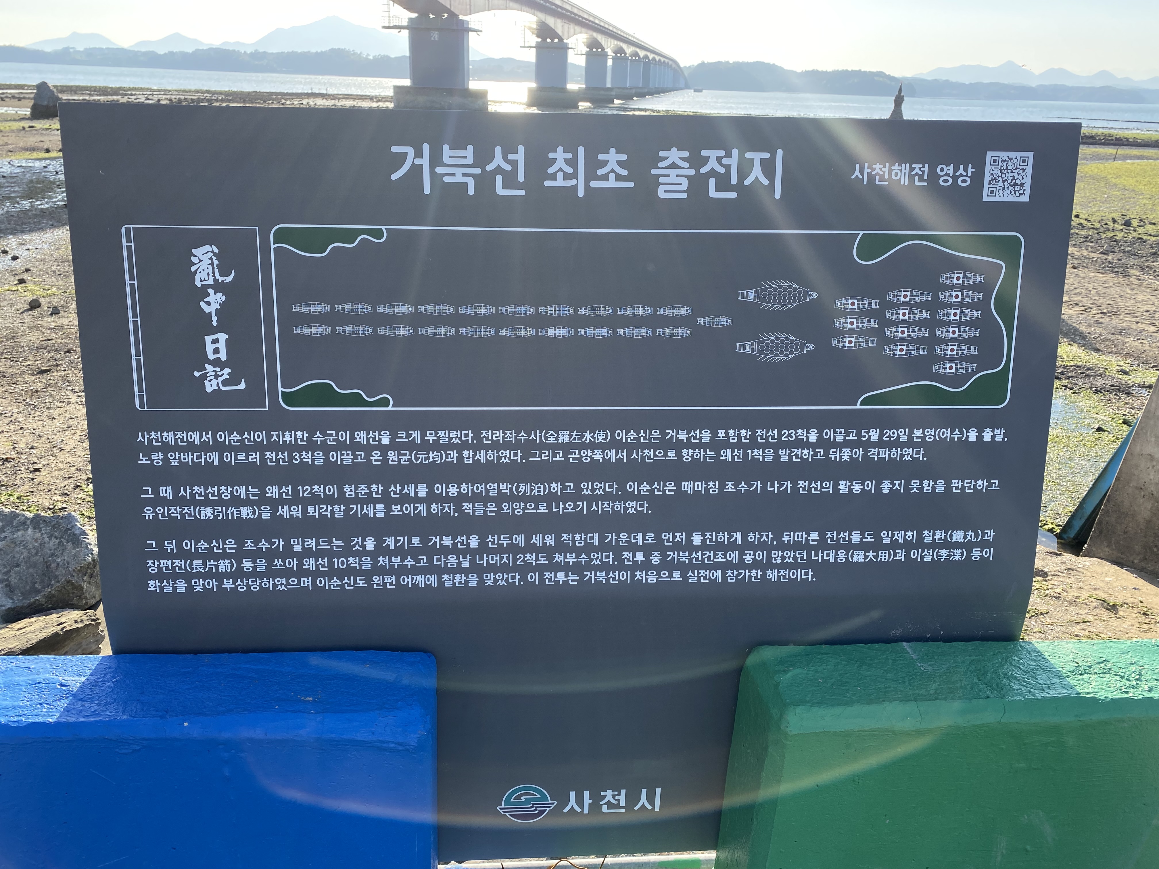 해안도로를 따라 사천대교를 지나다 보면 무료 주차장이 나옵니다. 거기다 주차를 하고 해변가로 가보니 표지판에 거북선 최초 출전지라고 안내가 되어 있더군요. 시간이 얼추 오후 5시 40분을 넘겼을 때였는데 해변은 물이 쫘~~악 빠져 갯벌을 드러내고 있었는데요, 갯벌에서 가족여행을 온 두아들과 아빠가 열심히 갯벌체험을 하고 있는 모습을 발견한 7세 아들이 급 흥분을 하면서 우리도 저기서 모래놀이하자~!! 이러는 겁니다. 해 질 녘 뷰를 느긋하게 즐기다 울산으로 컴백하려는 계획이 급 갯벌체험으로 바뀌는 순간이었습니다.