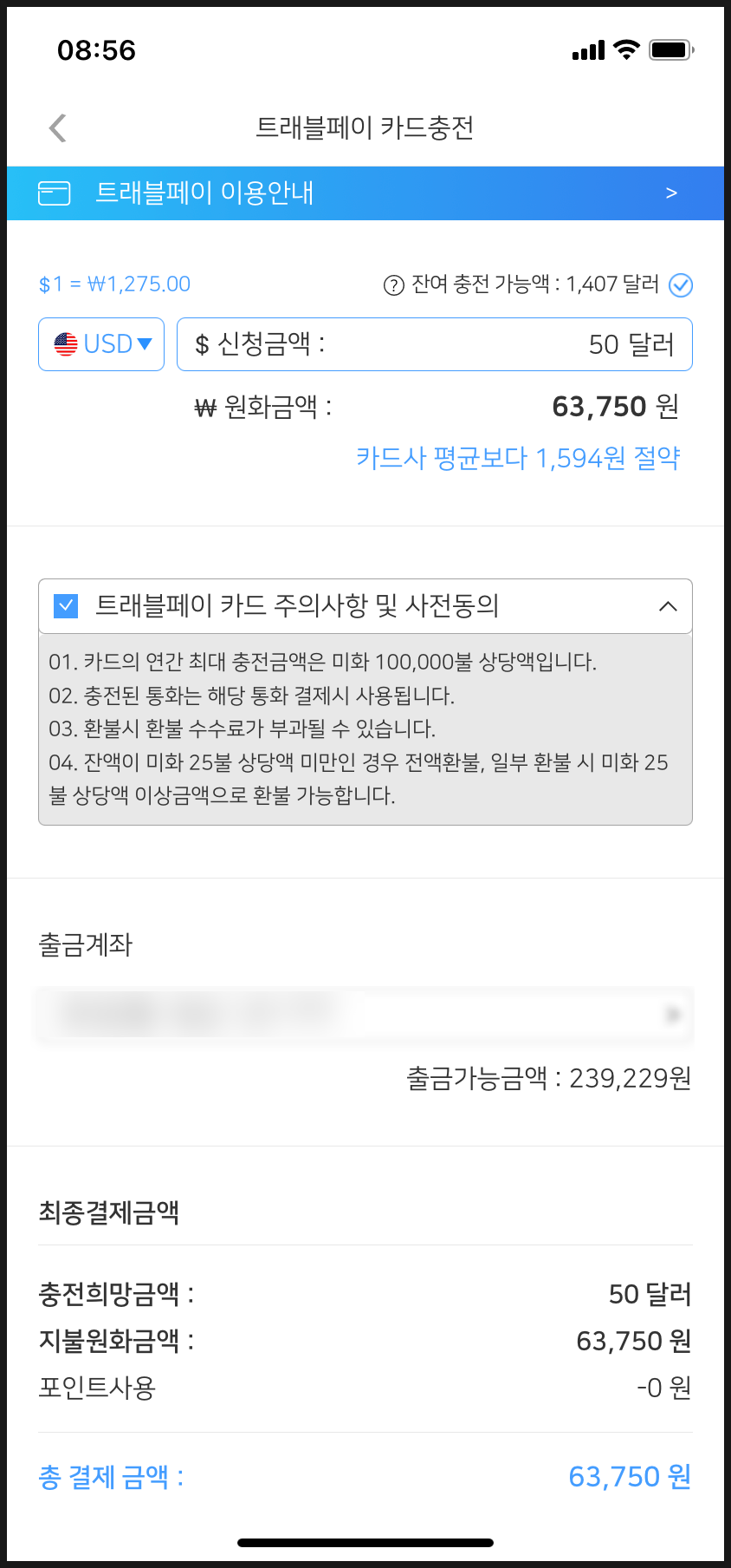 50달러를 충전했고 한화로는 63,750원이 통장에서 빠져나갔습니다.