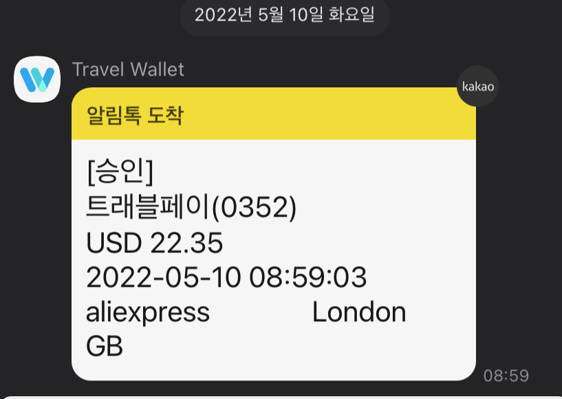 트레블 월렛에서 발급한 모바일 카드로 결제를 누르면 카톡 알림이 실제로 요렇게 날라 옵니다. 결제는 $24.83 하는데 충전한 잔고에서는 10% 할인된 $22.35 결제되었다고 말이죠. 이렇게 성공적인 해외 직구 결제를 완료하게 되었네요. 급하게 꼭 필요했던 무선 핀이어 마이크 세트 관련된 리뷰는 다음 시간에 자세히 올려보도록 하겠습니다. 트레블 월렛으로 저는 알리 말고도 아이허브에서 실제로 영양제나 비누, 샴푸 같은 것도 자주 구매를 하고 있습니다. 그럼 요기까지 글 마무리하도록 하겠습니다.