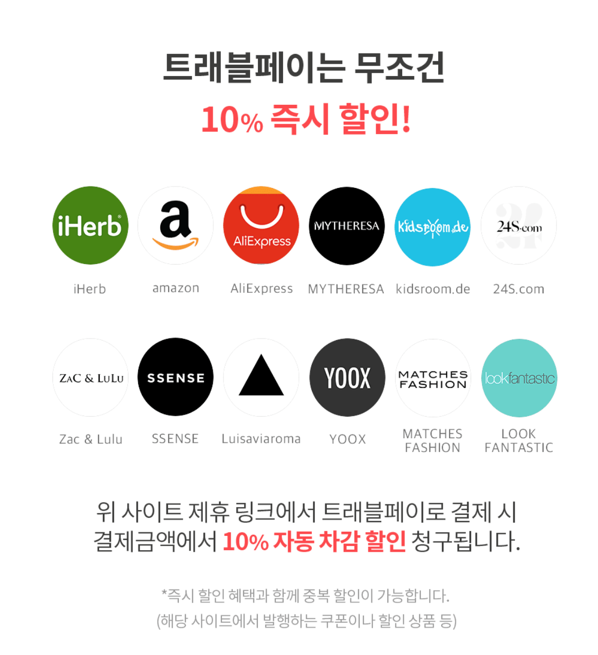 트레블 월렛 홈페이지에 들어가 보면 무조건 10% 즉시 할인이라는 문구를 볼 수 있는데 다양한 해외 직구 사이트에서 사용을 할 수 있습니다.