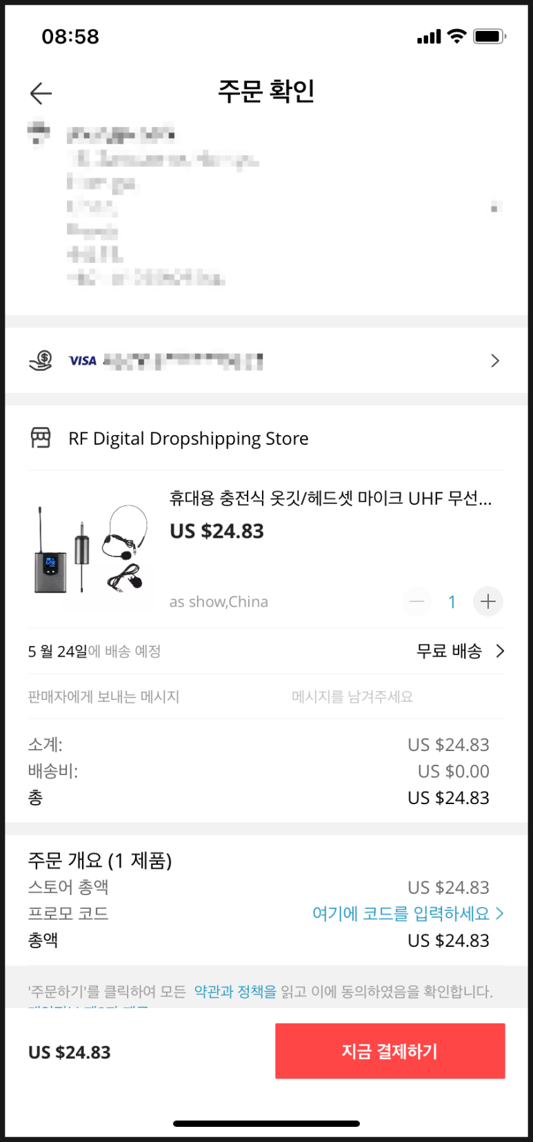 알리 익스프레스에서 급하게 무선 인이어 마이크 세트가 필요해 구입을 했는데 최종 결제가격은 $24.83입니다.