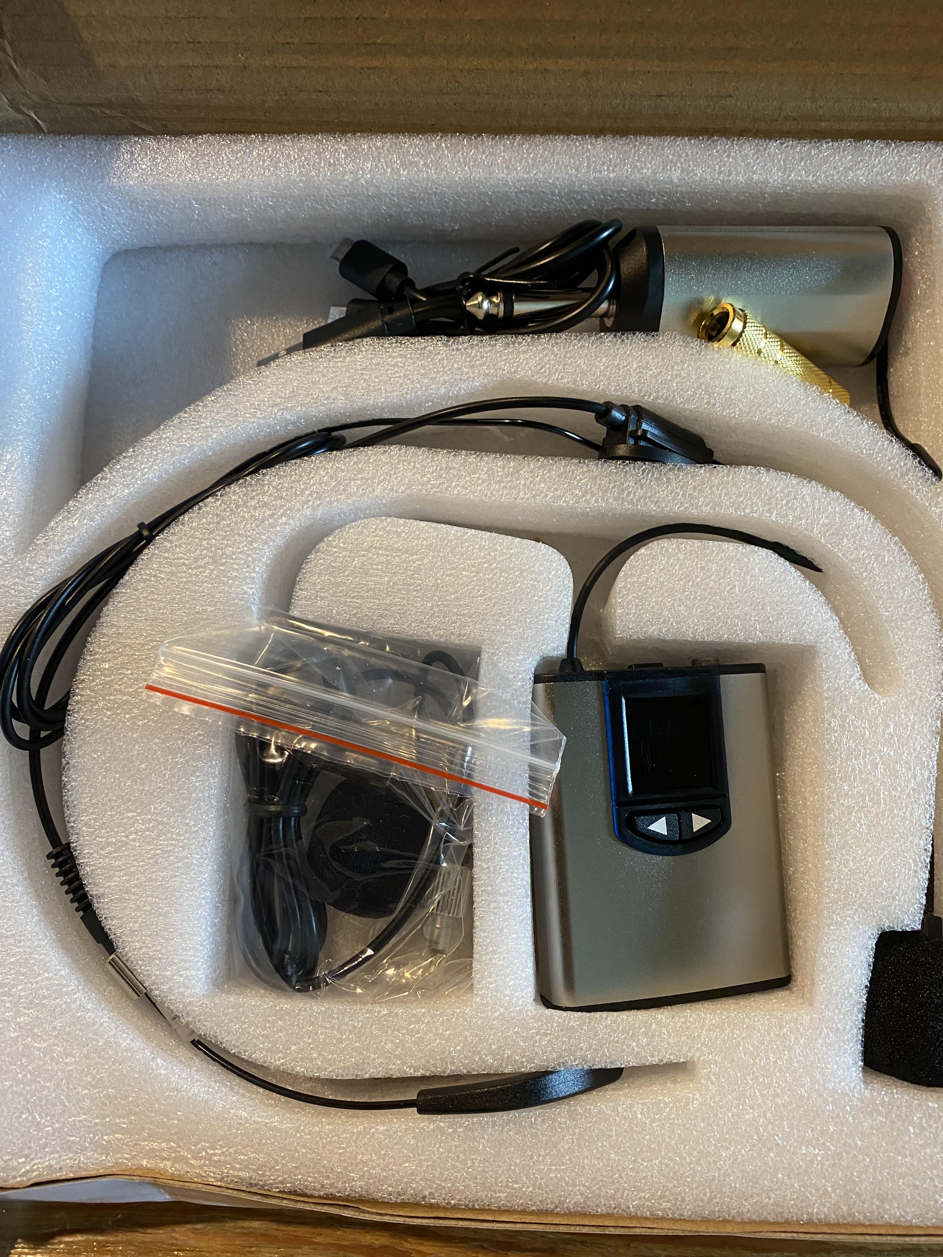 위족에 수신기가 들어가 있고 네모난 충전식 무선 송신기가 들어가 있습니다. 헤드셋 상품으로 구입을 해서 관련 옵션 상품이 함께 동봉되어 있습니다.