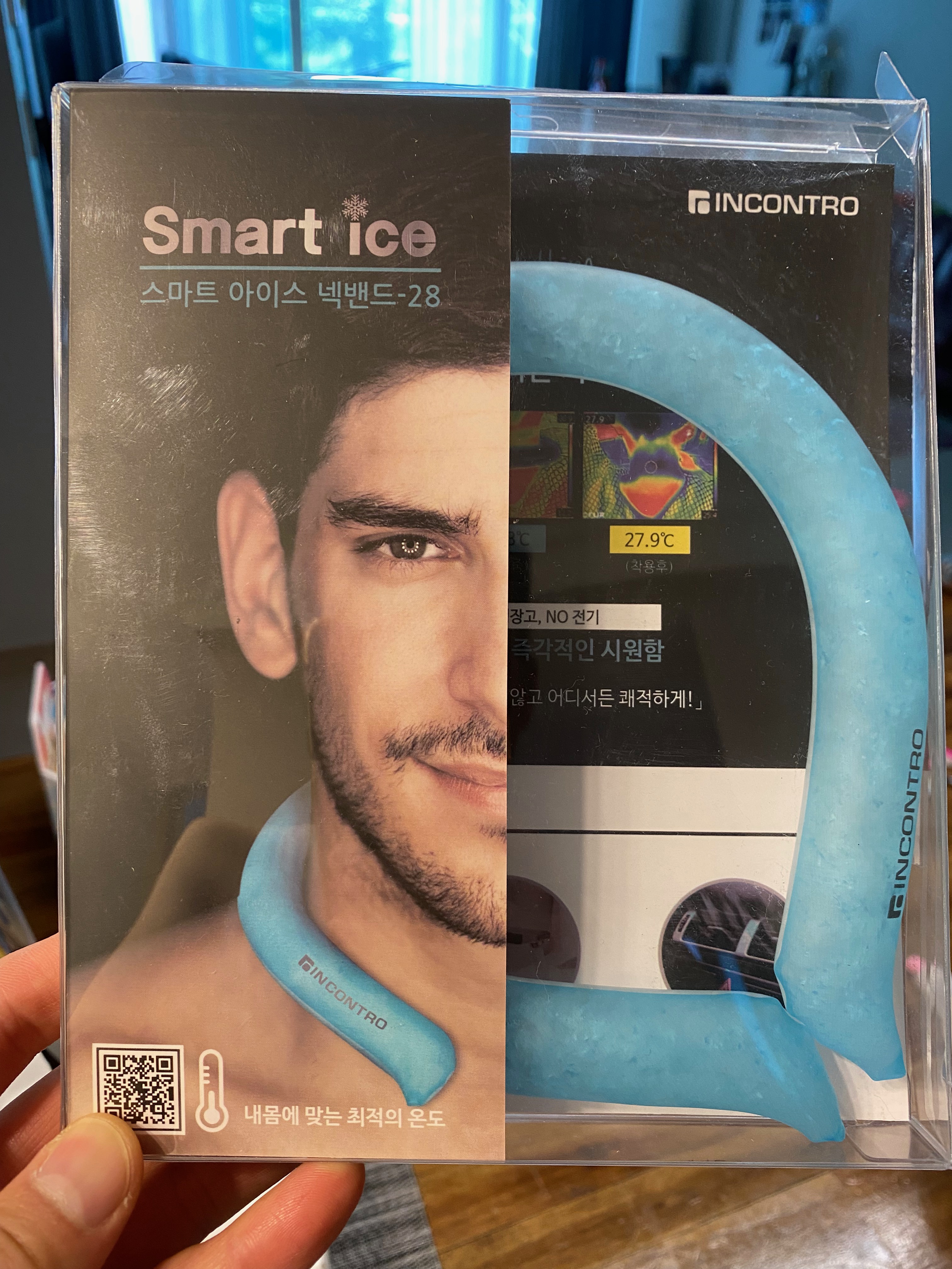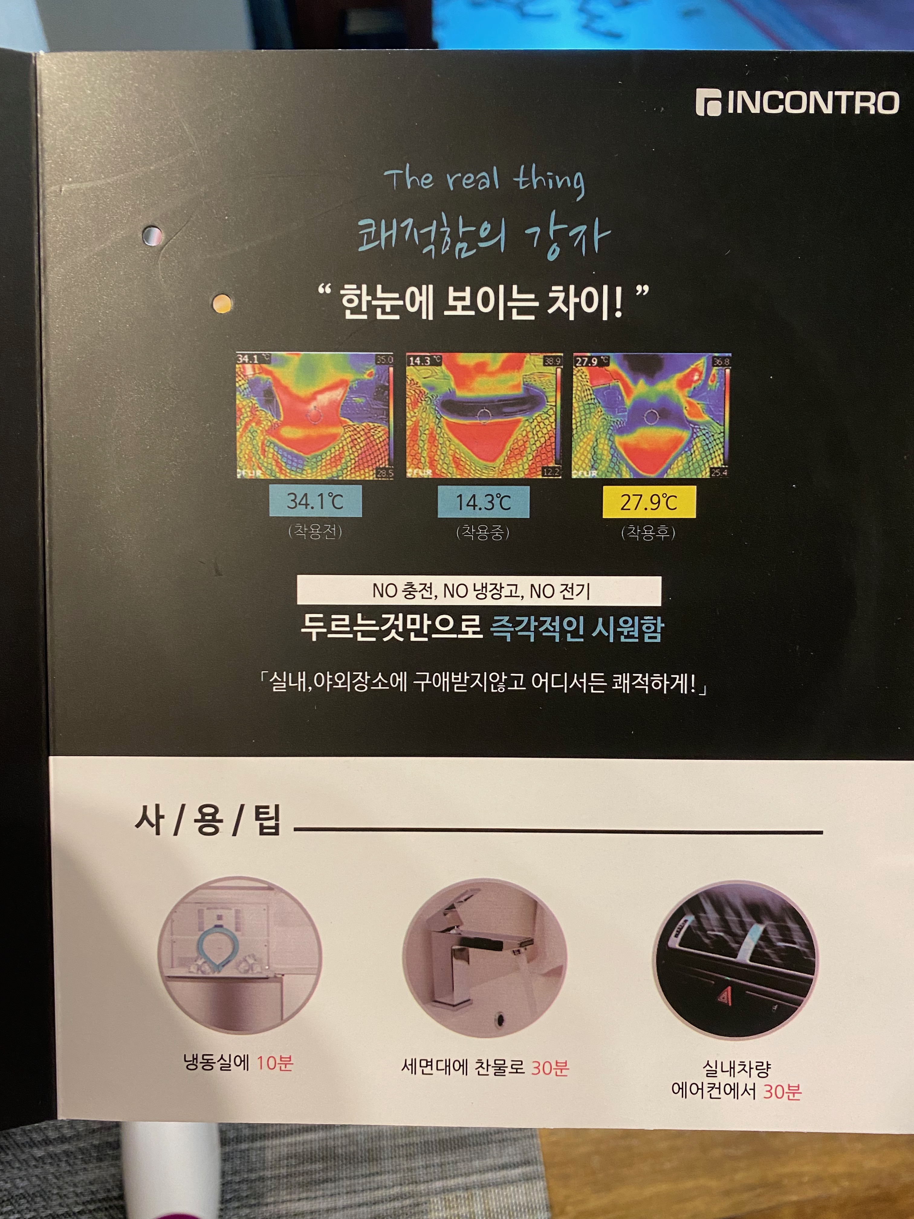 왜 스마트 넥밴드인가 하면요~ 보통 얼음은 더운 날 그냥 바깥에 내놓기만 해도 바로 녹쟈나요?!! 그런데 요 스마트 넥밴드는 기본 녹는 점이 28도부터입니다. 즉 27도 아래에서는 자연 적으로 녹질 않는다는 거~~!! 더운 여름철에 목 주변을 시원하게 감싸주면 한결 쾌적함을 느낄 수 있는데 바로 요 스마트 넥밴드가 그런 역할을 해준다는 거지요. 그래서 오늘 드디어 사용해 봤습니다. 과연 그 효과가 얼마나 될까? 요즘 선풍기가 넥밴드 타입으로 나오고 있는 거 아시쥬?? 그걸 살까도 잠시 고민을 해봤습니다만 주로 무선 인이어 마이크를 착용한 상태로 강습할 때 더위를 조금이나마 식혀주고 싶어 알아본 제품이라 넥밴드 타입의 무선 선풍기는 환경에 잘 맞지 않겠다는 생각이 들었지요. 무선마이크에 바람 소리만 윙윙 들리면 곤란하니까요. 그래서 아무 소음이 없으면서 목 주변을 조금이나마 시원하게 해주는 제품이 바로 요 제품이 아닌가 생각됩니다. 실제로 오늘 사용해 보니 디게 엄청 시원하단 생각은 안 들고 에어컨을 틀어놓고 착용을 한 상태로 강습을 했는데 안 한 것보다는 한결 더 나은 상태라는 점.... 그리고 무한대로 반복 사용이 가능해서 초기 구입 비용만 들고 배터리 재충전 같은 그런 일은 안 해도 된다는 점... 뭐 이런 것들이 요 인콘트로 스마트 넥밴드의 장점이 아닌가 생각됩니다. 구입은 각자 환경에 맞게 잘 판단해서 해보셔요^^