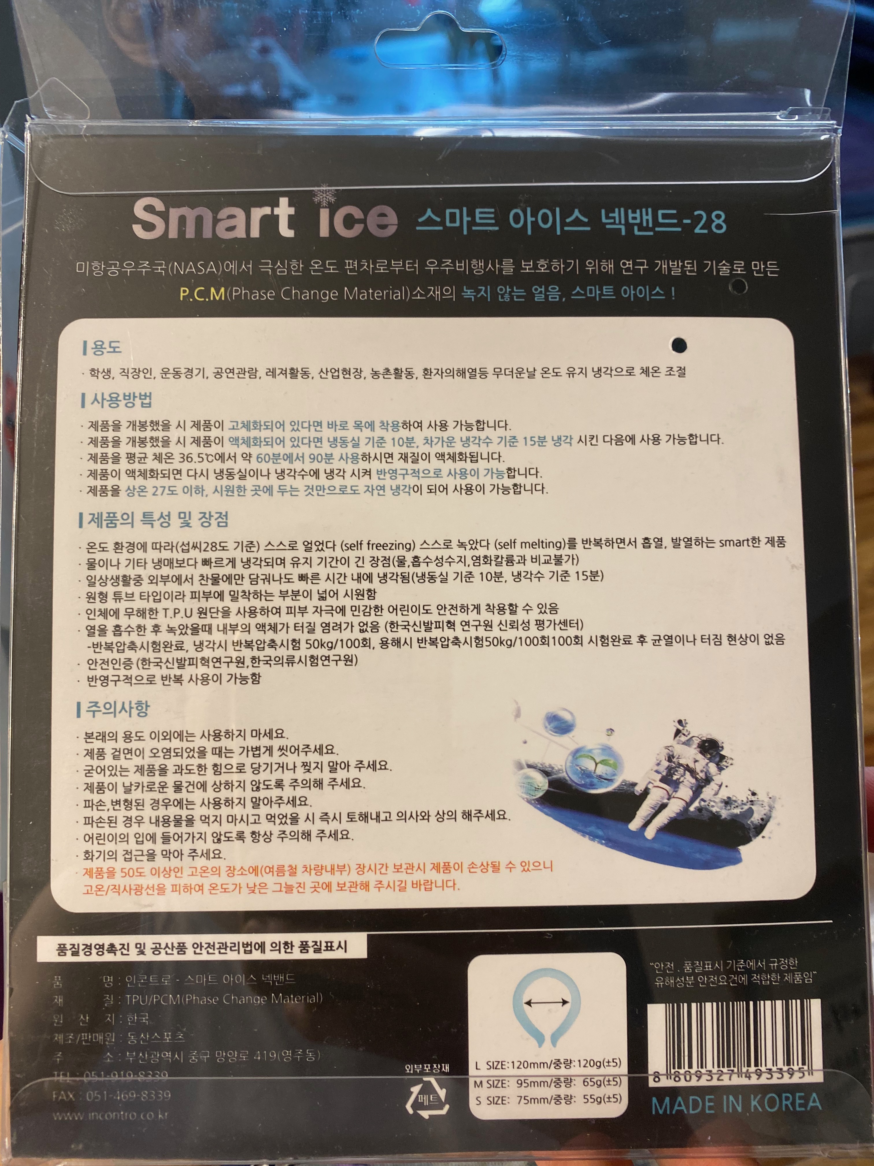 벌써부터 무더위 걱정을 해야 하는 세상이 왔습니다. 5월은 이상 기온 영향으로 가뭄에 쌀쌀하기까지 했는데 6월 들어서는 장마 시즌도 아닌데 무덥고 습하고 숨이 턱턱 막히는 날들이 사나흘씩 이어지고 있습니다. 그래서 이 무더위에 조금이라도 시원하게 보내고픈 맘에 여름 준비물 3탄을 준비해 봤습니다. 5월에 진즉에 사다 놓고 날씨가 쌀쌀해 한 번도 사용을 안 하다가 드디어 사용을 해보고 나서 후기를 적게 되었네요. 제품은 바로바로 '인콘트로 스마트 아이스 넥밴드'입니다. 사이즈는 S, M, L 요렇게 세 가지가 있는데 대체로 아이용 / 여성용/ 남성용 요렇다고 보시면 되겠고 가격은 아이용이 14천 원 정도 고 나머진 다 18천 원에 판매되고 있습니다. 전 중고제품으로 단순 변심 상품을 15천 원 정도에 구입을 했습니다.