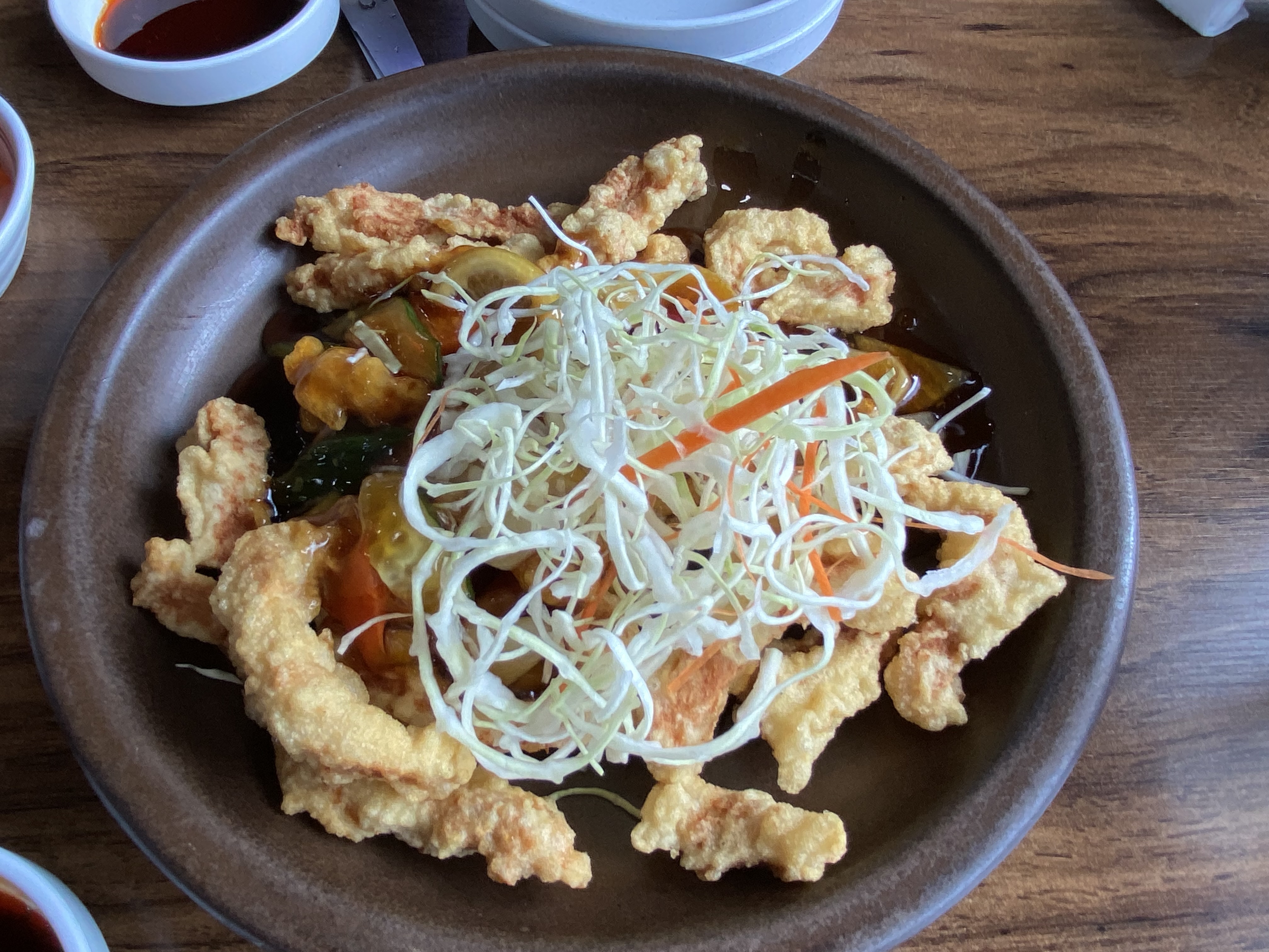 탕슉이 나왔습니다. 저희 집은 모두 찍먹파인데..... 부먹으로 그냥 세팅이 되었다는... 그래도 바삭하니 맛있었습니다.