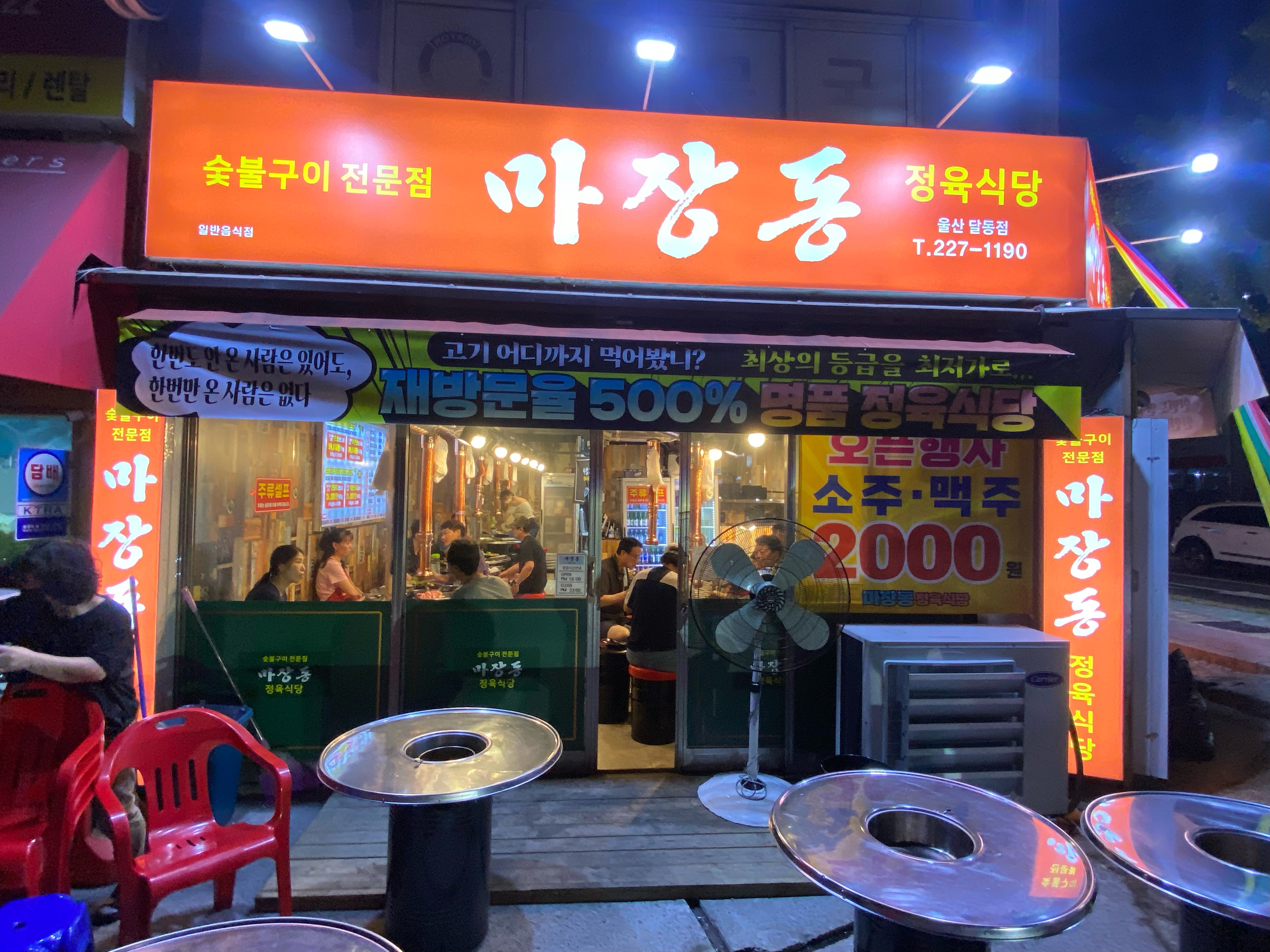 걸어서 5분~! 울 집 앞 사거리에 최근 고깃집이 오픈했습니다. 원래 공구를 파는 곳이었는데 리모델링을 해서 고깃집으로 오픈했다가 한 육개월즘~~ 지났을까요? 새로운 간판이 걸리더니 오늘 소개하는 '마장동 정육식당 울산달동점'으로 재오픈을~!! 연일 무더위에서 사람들이 꽉꽉~ 바깥 테이블까지 꽉꽉 차서 언제 저길 한번 가보긋노~ 했는데 지난 주말 저녁에 고기나 먹자고 해서 집을 나선 길에 지나가보니 운 좋게 실내 테이블이 한자리 남더라고요~^^ 이건 무조건 여기서 한 끼를 해결해라 라는 신호라 생각하고 7살 아들과 엄빠가 자리를 잡습니다.