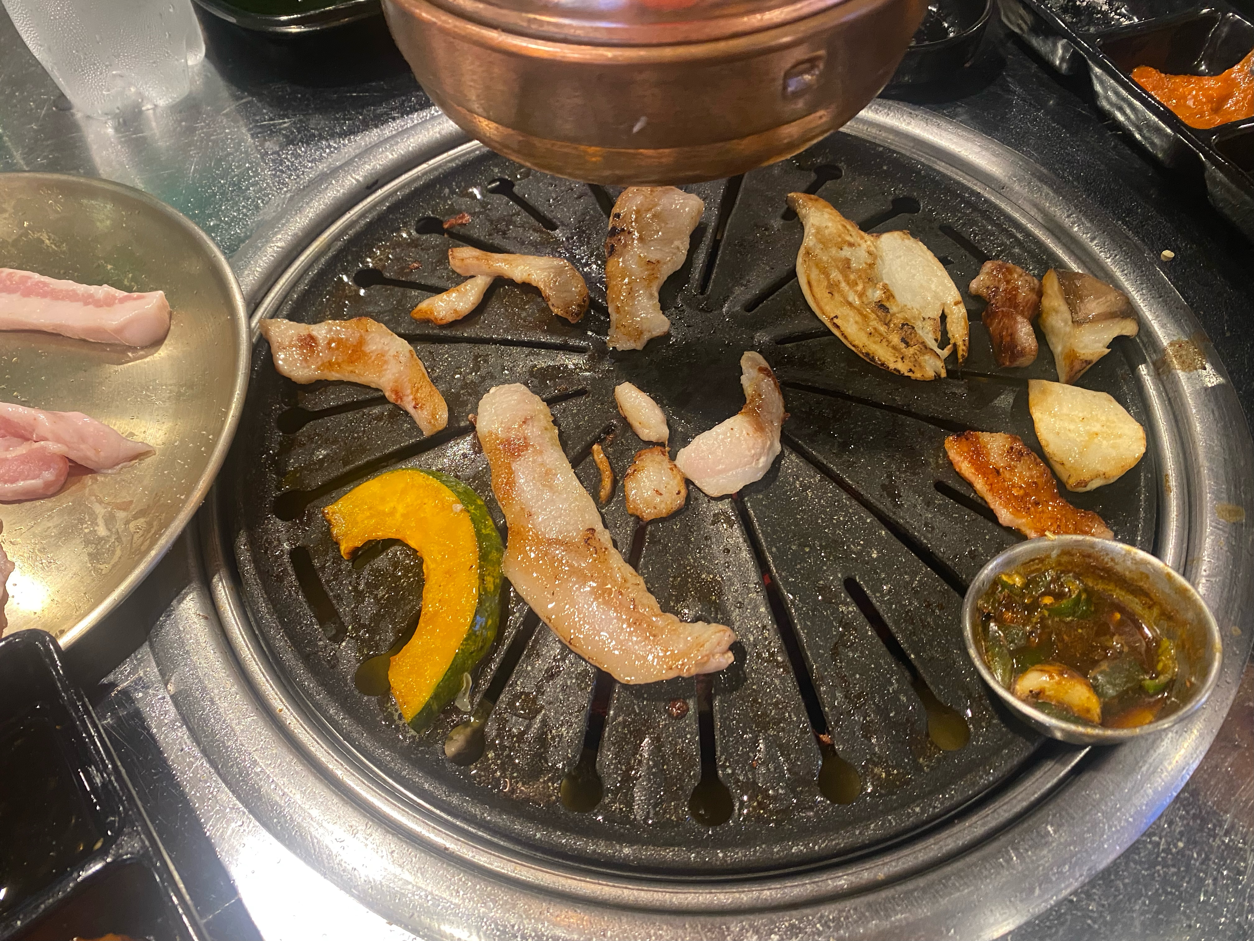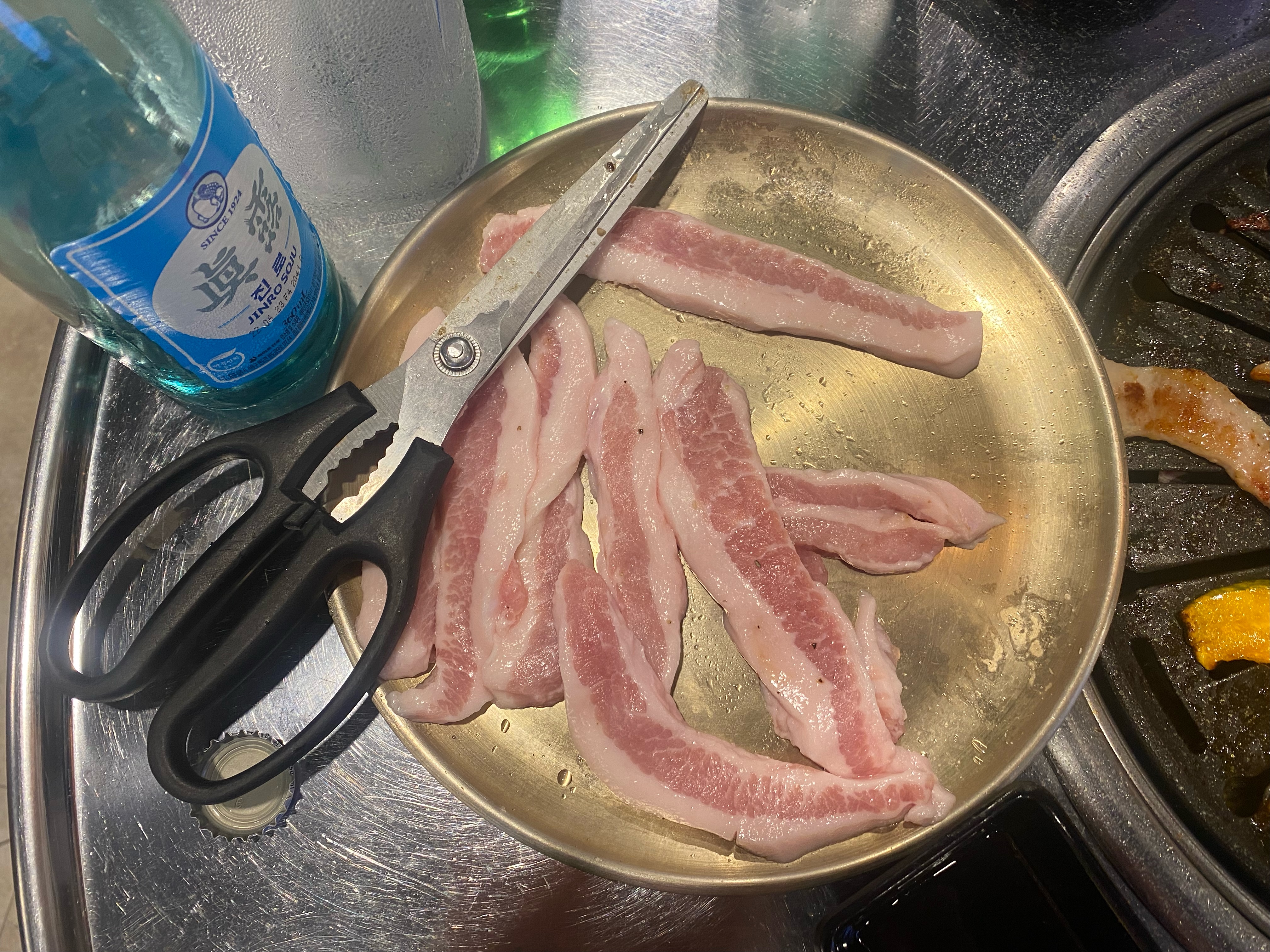요 메뉴판 사진도 중간에 사람들이 빠져나가는 타이밍에 급하게 한 컷!! 가격 보시면 참말로 착하지요잉??!! 돼지 한 근에 26천 원이면 요즘 물가치고는 도저히 나올 수 없는 가격이 아닌가.... 저희는 당연히 입 짧은 와이프님 있어서 작은돼지 한마리를 시켰습니다. 아쉽게도 밝혔다시피 맛집 글을 올릴 생각이 없었기 때문에 작은돼지 한 접시가 나왔을 때 사진은 찍지도 않았지요. 냉삼겹, 생삼겹, 목살, 가브리살, 항정살~ 고루고루 한 접시가 나왔습니다. 우선 배고파하는 아들을 위해 제일 빨리 굽히는 냉삼겹으로 시작해서 가브리살, 생삼겹, 목살, 항정살 순으로 구웠습니다. 그런데 말입니다... 고기 맛이 좋았던지 7살 아들이 급발진을 하는 게 아니긋습니까? 냉삼겹은 엄빠 맛도 못 보고 순삭! 그 뒤로 아빠는 고기 굽기 바빴구요, 엄마는 아들 밥 먹이기 바빴습니다. 아들이 충분히 배가 부른 걸 보고서야 엄빠는 고기 한 점 맛볼 수가 있었지요^^