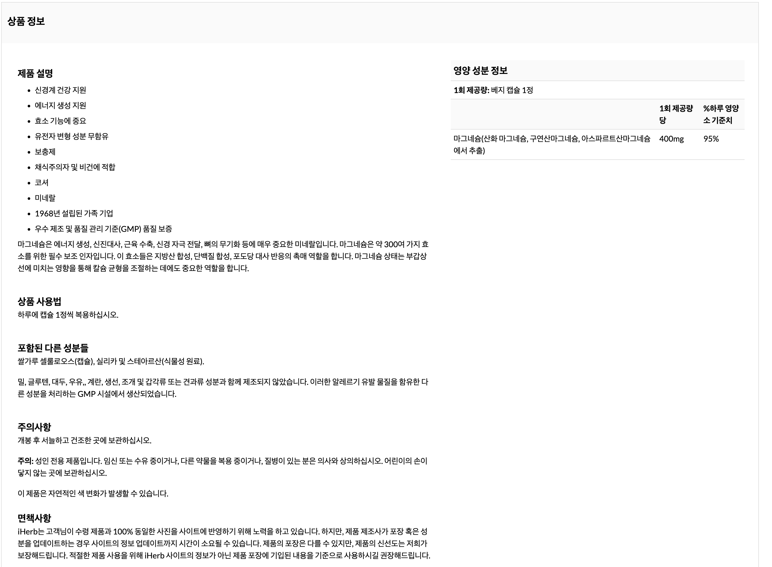 관련 제품 정보는 아이허브에서 캡처해서 올려봅니다. 마그네슘 알약이 제법 커서 말이죠 목 넘김에 조심하셔야 합니다. 입안에 물을 충분히 들이마신 다음 알약과 함께 꿀꺽~ 해야지 안 그럼 목 안에서 걸려있는 듯한 느낌이~~ 으~~~~