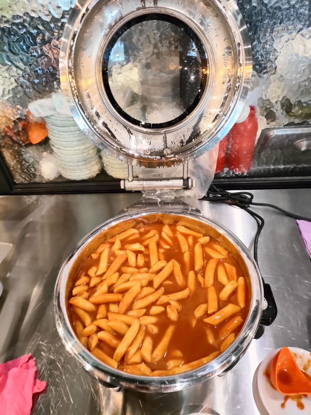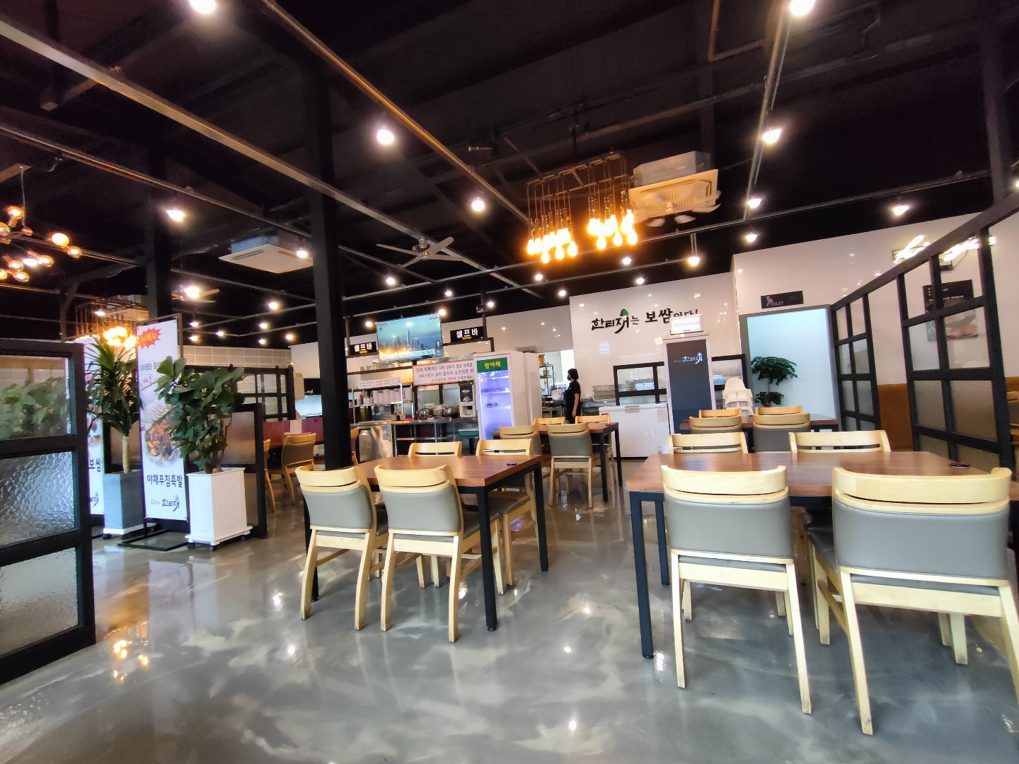 실내로 들어가면 공간이 탁 트여있고 좌석도 많아서 여유 있게 식사를 할 수가 있습니다. 셀프 바가 있는데 여기서 각종 밑반찬 리필과 잡채, 떡볶이를 식전 음식으로 맛볼 수가 있습니다.