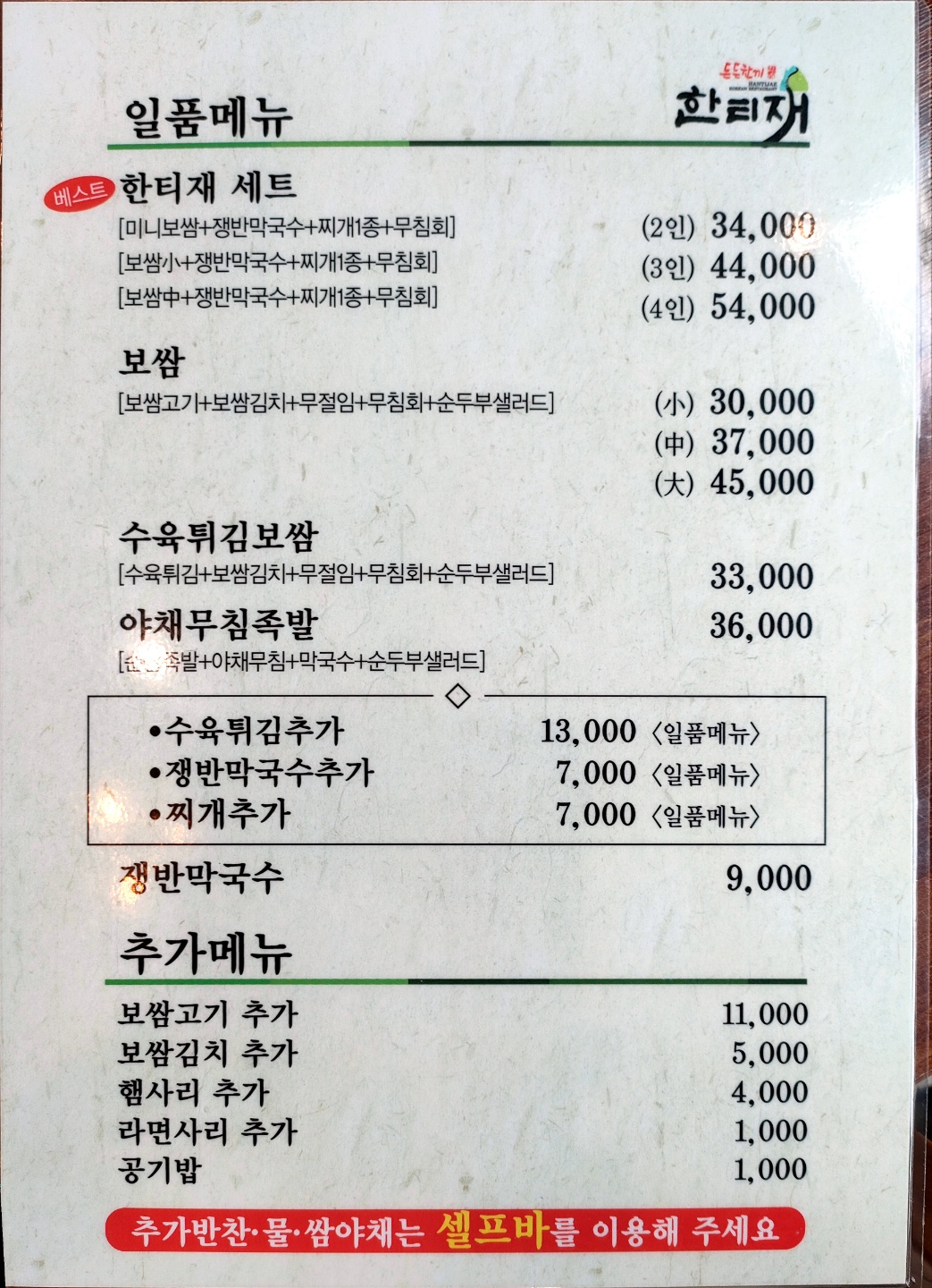 전체 메뉴판을 올려봅니다. 평소 와이프님께서 소식이셔서 세 식구 주문을 2인분만 하면 되기 때문에 보쌈고기를 많이 먹고 싶다는 생각에 보쌈과밥 메뉴를 2개 시켰습니다. 다른 블로그에 올라온 글을 보면 순두부찌개와보쌈을 주문하셨다고 했는데 의외로 고기 양이 적어서 추가 주문을 했다고 하더라고요. 그러면서 보쌈과밥 메뉴에는 고기가 좀 더 많이 나온다고 참고하라면서~~