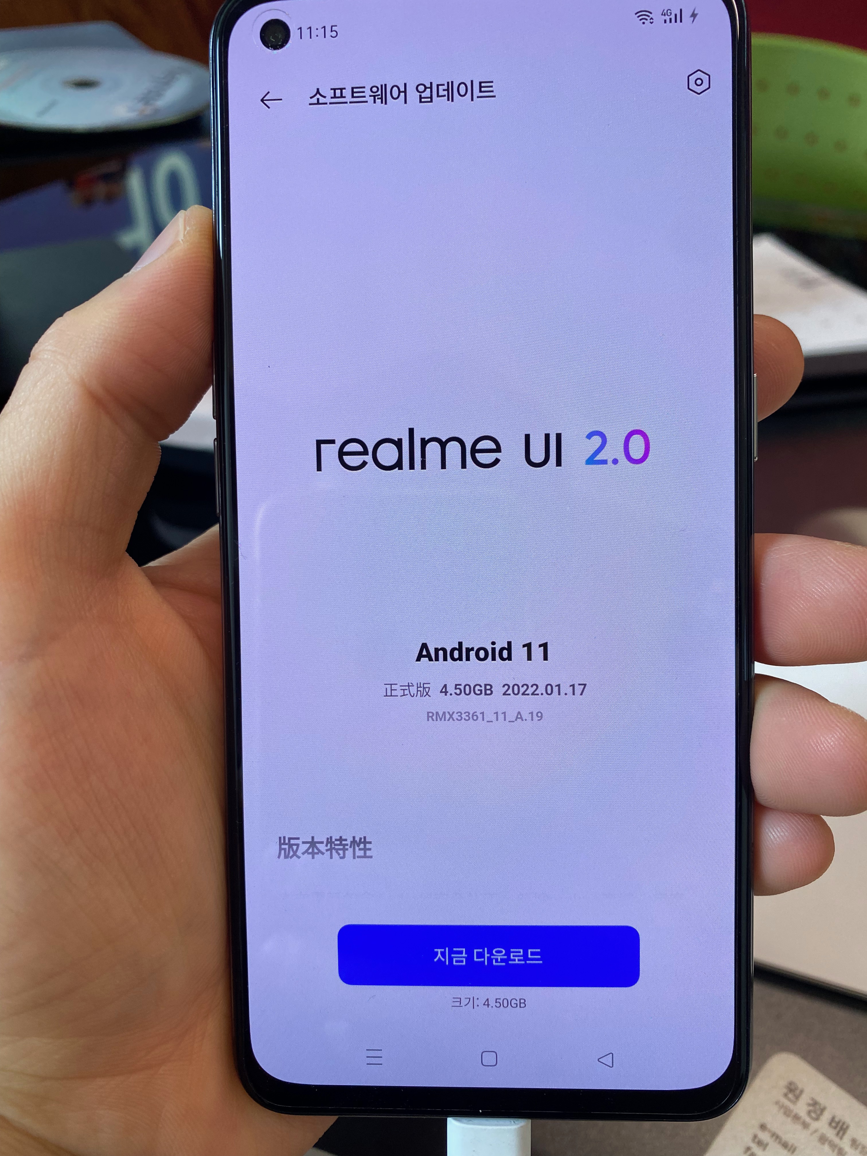 본체 사진을 찍어봅니다. 손에 감기는 맛이 좋습니다. 한 손에 착! 기존 리얼미 제품보다 액정은 동일한데 가로 사이즈가 좀 더 깍여나가서 그런지 아이폰 11보다도 더 날씬합니다.