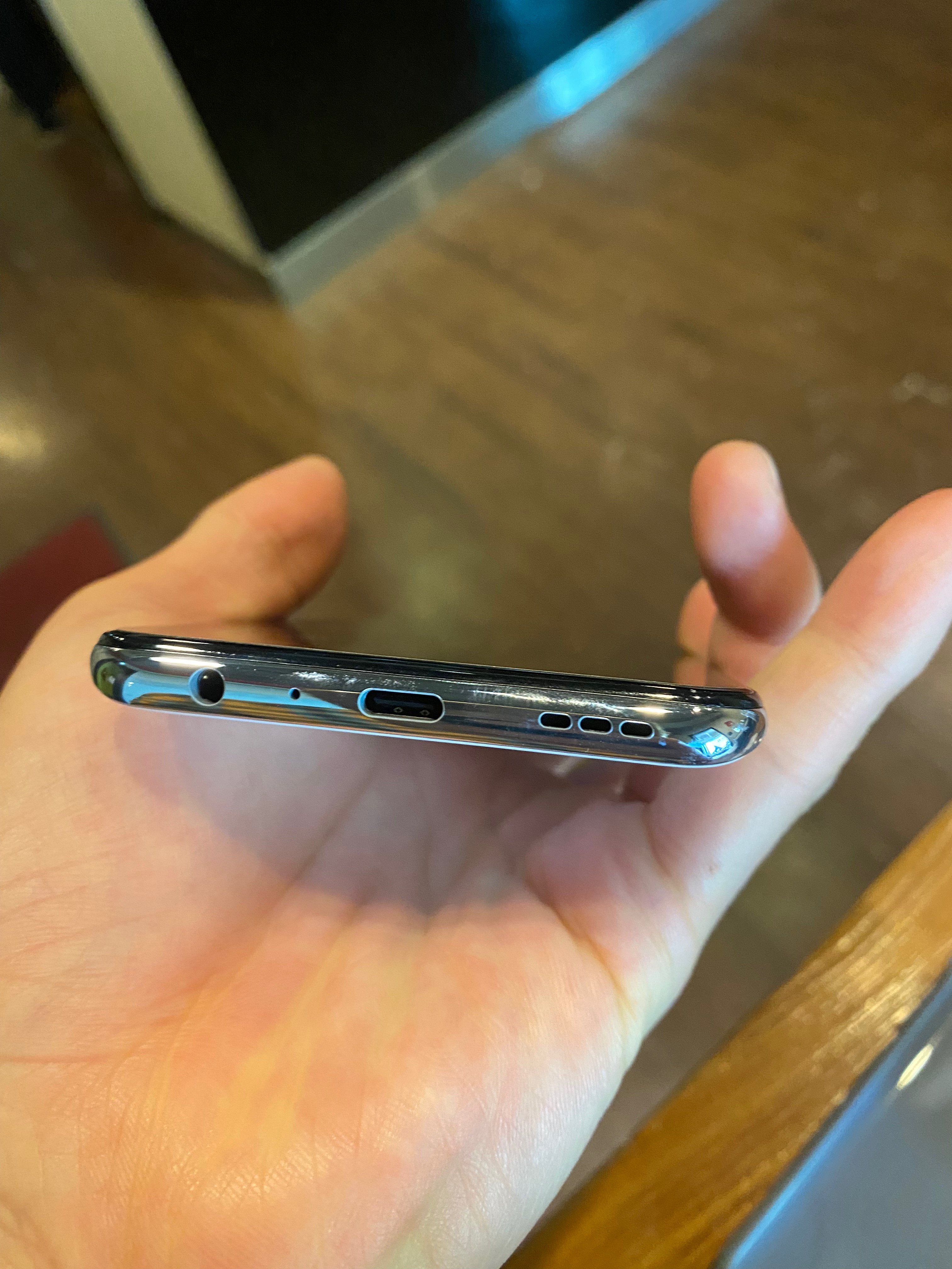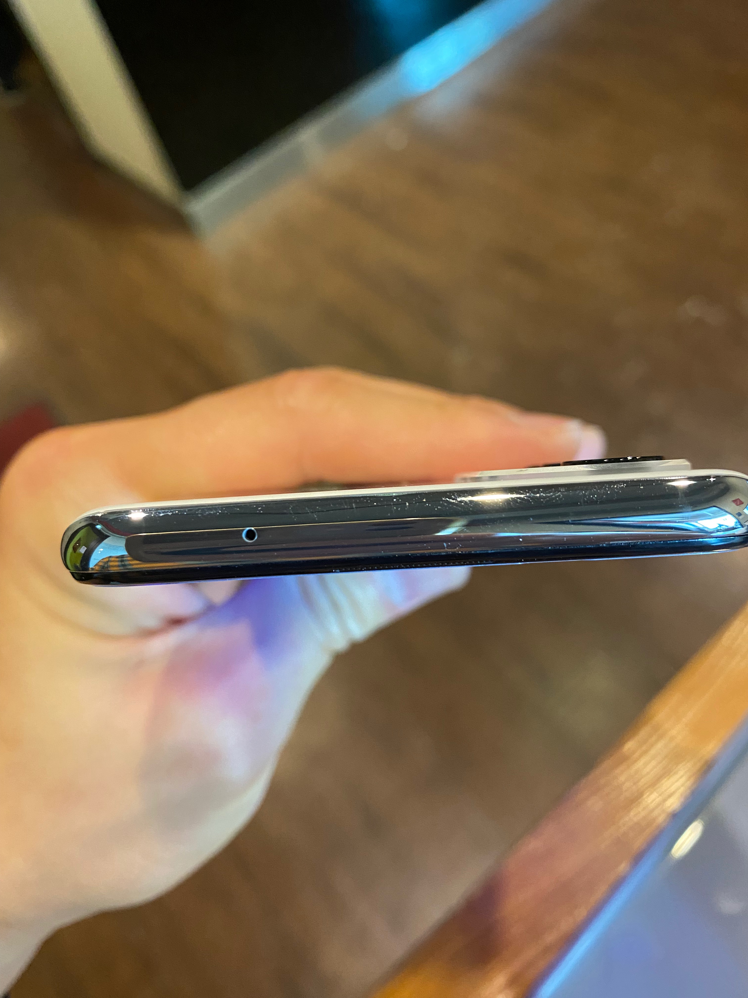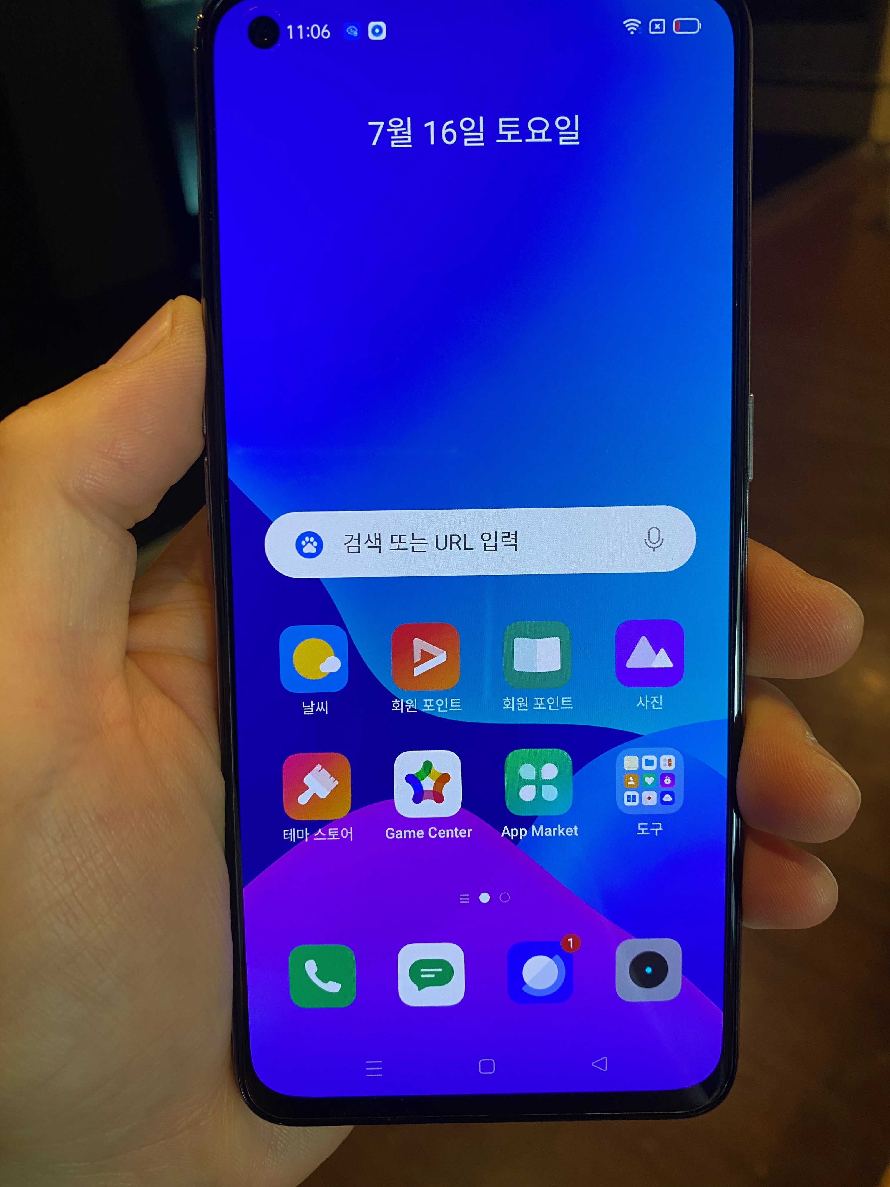 본체 사진을 찍어봅니다. 손에 감기는 맛이 좋습니다. 한 손에 착! 기존 리얼미 제품보다 액정은 동일한데 가로 사이즈가 좀 더 깍여나가서 그런지 아이폰 11보다도 더 날씬합니다.