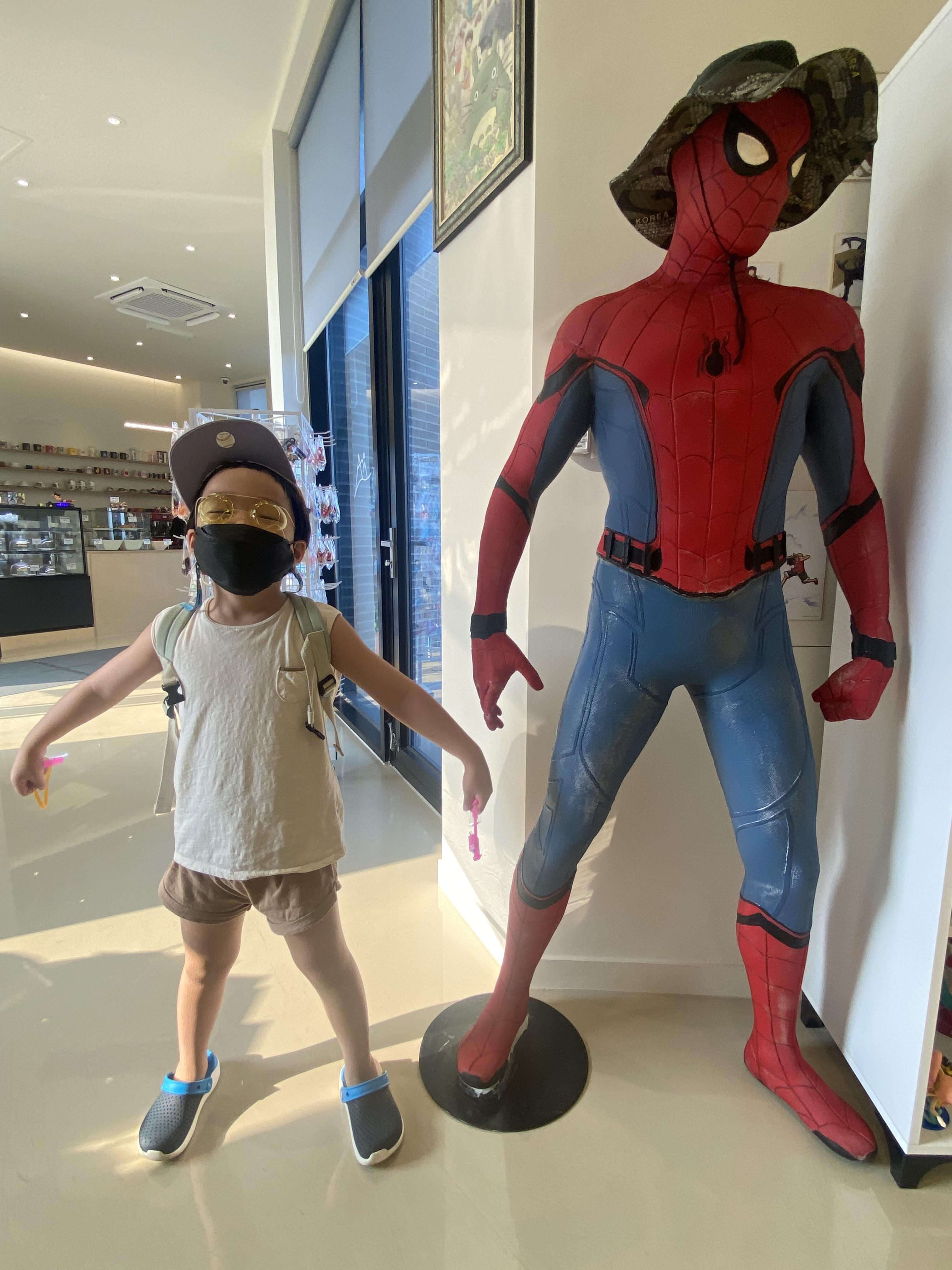 그냥 그러려니 하고 아아 한 잔과 레몬블루에이드 한 잔을 시켰는데 소금 빵이 너무 맛있었다는 손님이 빵만 더 사가더라고요. 그래서 급 소금 빵과 사과 파이었나? 그걸 추가 주문하고 있는데 아들이 갑자기 우와~~~~ 뒤를 돌아보니 그제서야 뒷공간에 엄청난 풍경이 눈에 들어옵니다. 아들은 실물 크기의 스파이더맨에 같은 포즈로 한 컷 찍으면서 수많은 피규어들을 감상하기 시작했지요^^