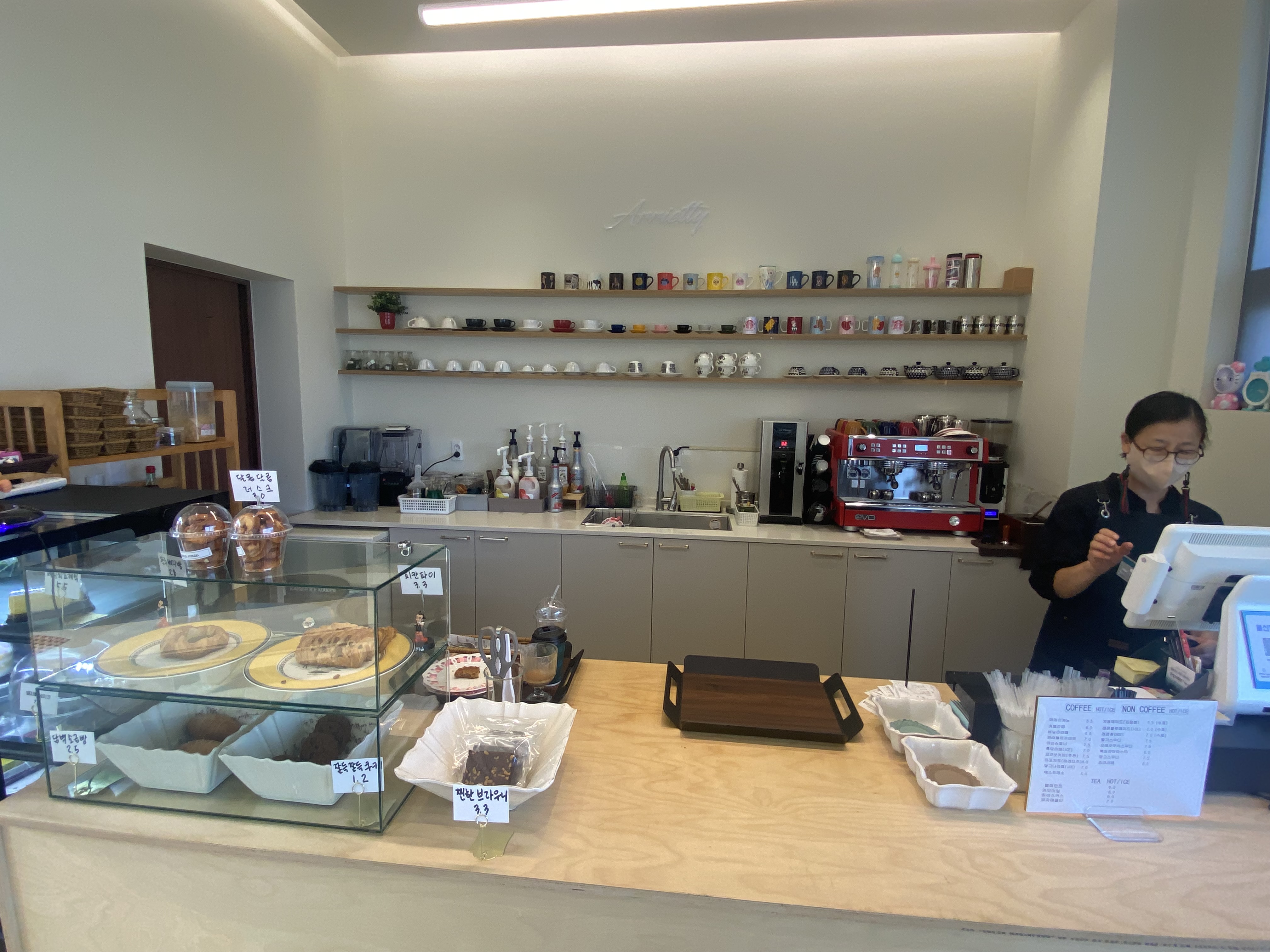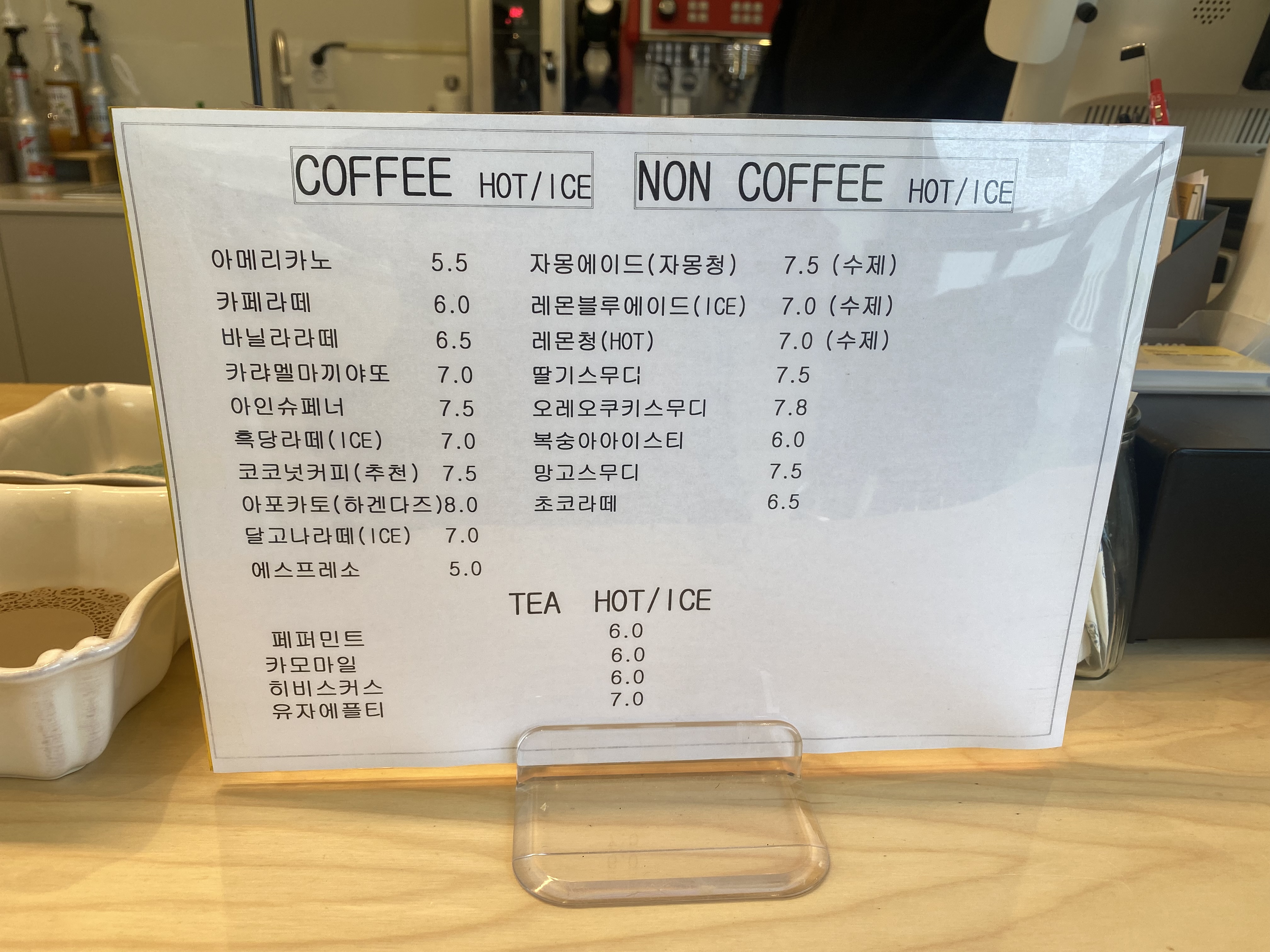 1층 문을 열고 들어가면 바로 카운터가 있고 쥔장분이 열심히 주문을 받고 계십니다. 커피 포함 음료는 가격이 제법 나가는 곳인데요, 아쉽게도 빵 사진을 근접 샷으로 찍질 못해서 가격을 알려드리진 못하겠네요ㅠㅠ