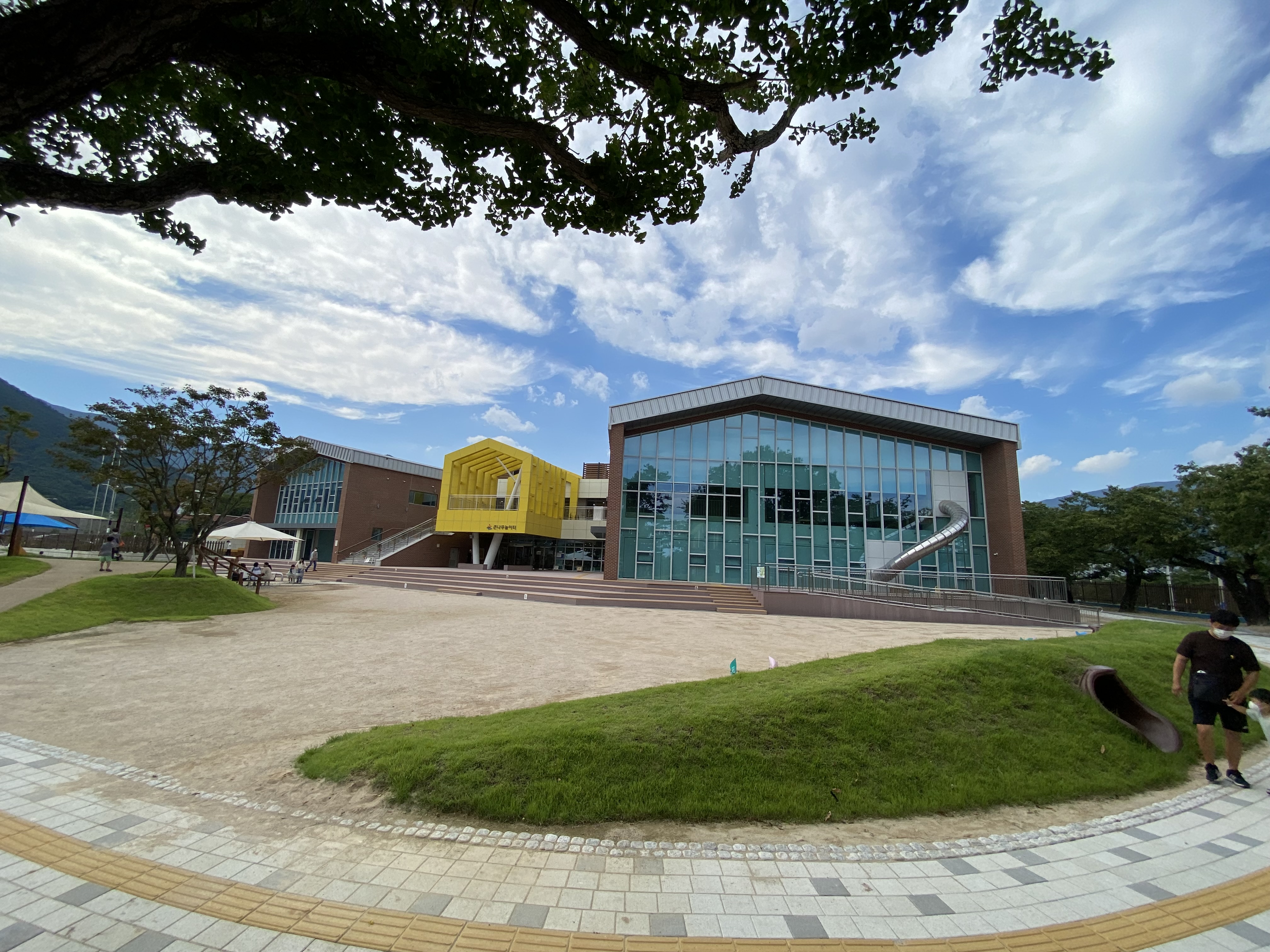 입구에 들어서면 우측 편에 놀이터가 조성되어 있고 바로 여기에 팽나무가 큼지막하게 자리 잡고 있고요, 정면을 바라보면 실내 놀이터 건물이 있습니다.