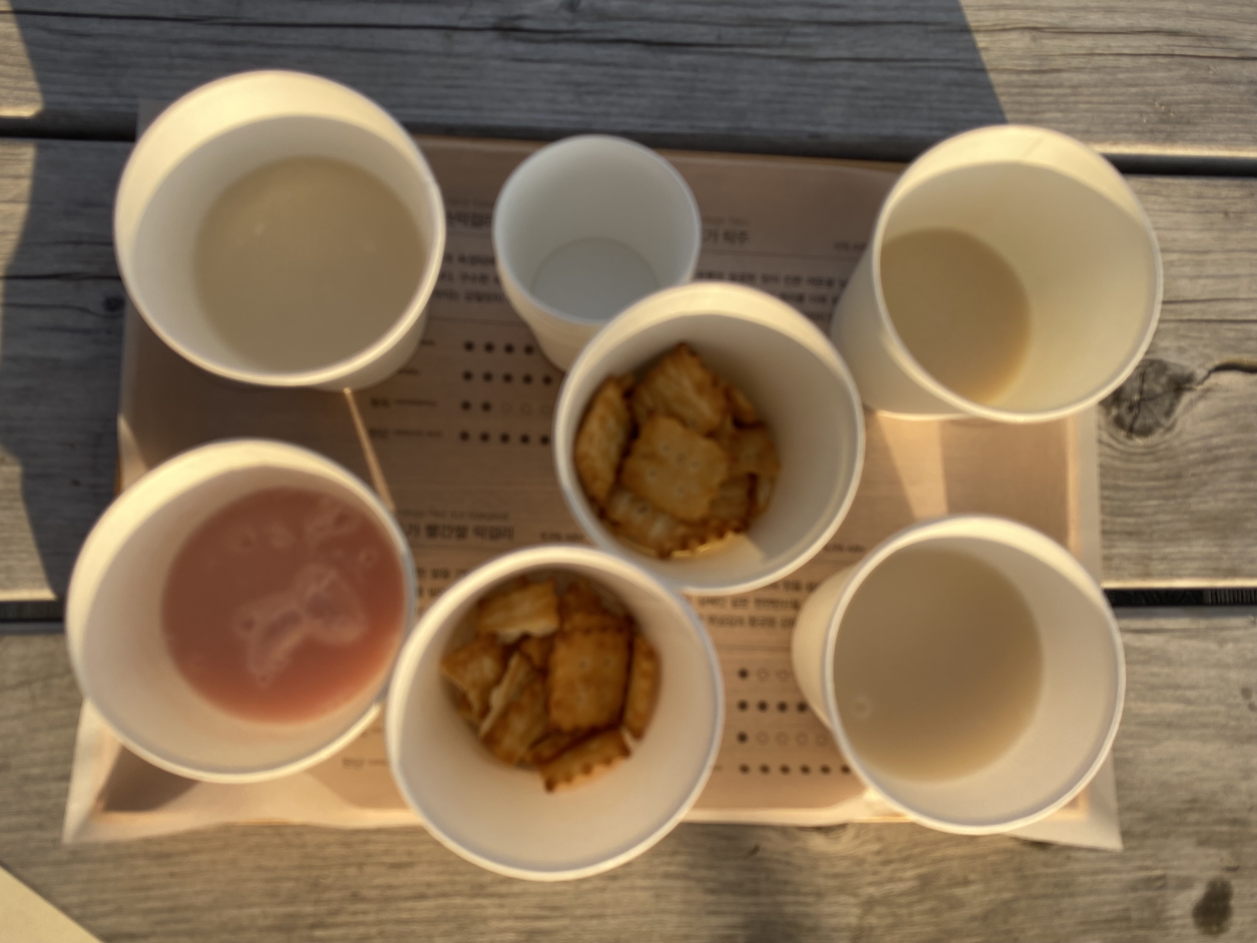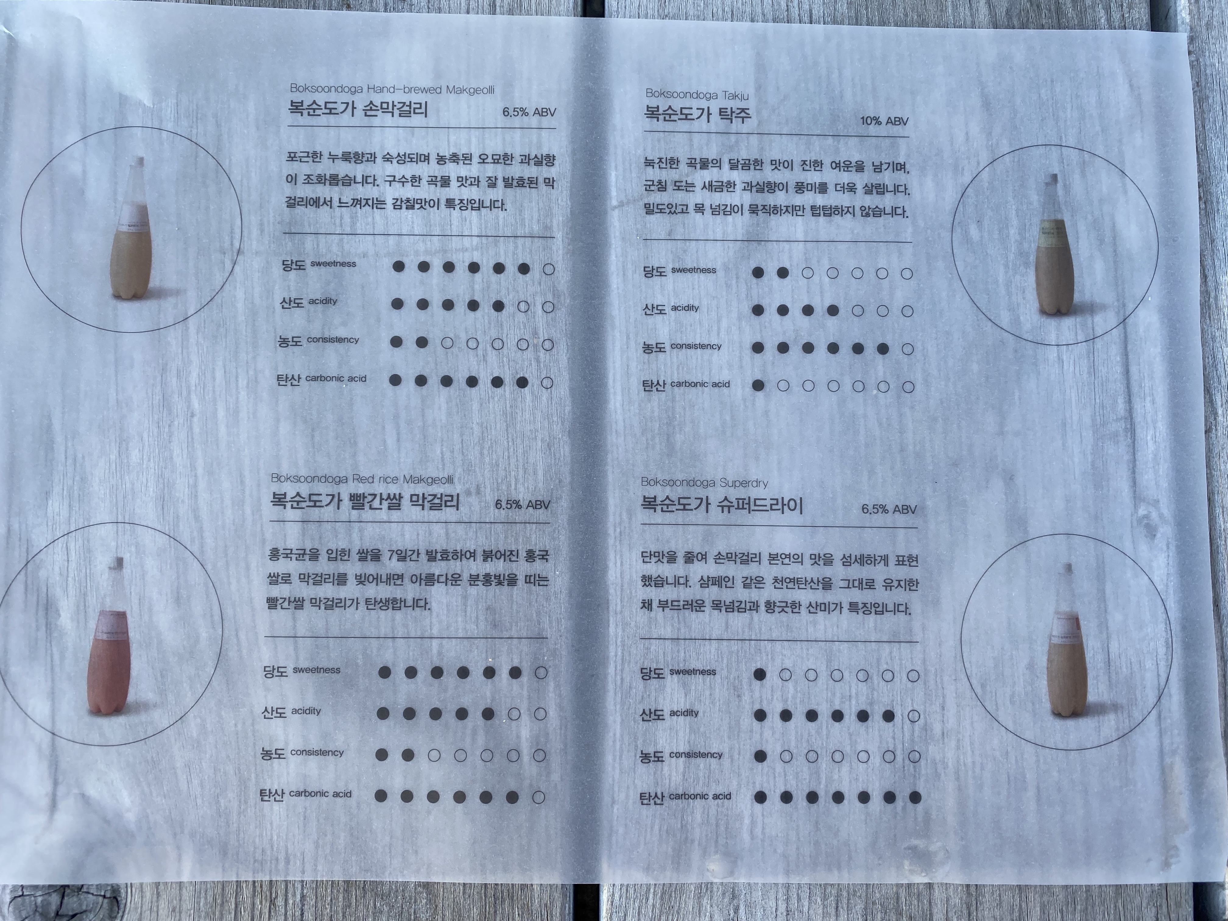 시식 코너에서 간단하게 설명을 듣고 바깥 테이블로 이동해서 복순도가에서 판매하는 4종류 막걸리 맛을 봤답니다. 막걸리에 관련된 상세한 안내장이 관련 막걸리 맛에 세팅이 되어 있어서 마시면서 다시 한번 그 맛을 설명을 통해 알 수 있었습니다. 그중에 저희 부부를 가장 사로잡은 막걸리는 바로 빨간 쌀 막걸리~!!!!! 요즘 시중에 나오는 막걸리들은 탄산을 최대한 빼고 나오는 제품들이 인기를 얻고 있는데 복순도가 빨간 쌀 막걸리는 과한 탄산으로 마치 스파클링 와인 같은 그런 맛도 나는데요 결국 빨간 쌀 막걸리 한 병을 구입~!!! 유효기간이 10월 중순까지라 아직 김치냉장고에 잘 보관 중이랍니다. 아이와 함께 주말에 큰나무 놀이터에서 하루 종일 놀다가 집에 가는 길에 복순도가 들러서 어른들이 잠시나마 힐링하는 시간을 가져보는 것도 괜찮을 거 같쥬??!! 매우 매우 강추해 봅니다. 단~!! 시식 매장 운영시간이 오후 6시였나? 너무 늦게 가면 맛도 못 보니 운영시간 잘 확인해서 들러보세용^^