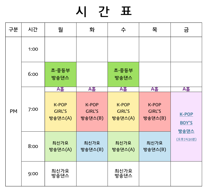 10월 제이댄스 수업 시간표 안내합니다. 10월달은 2주 연속으로 월요일 휴일이라 학원이 피치 못하게 휴강을 하니 스케줄 잘 챙겨 보시고 공휴일 월요일에 착오 없으시길 바랍니다. 케이팝 수업 문의로 공통된 질문이 걸스 방송댄스 수업과 최신가요 방송댄스 수업에 대한 차이가 뭔지 문의가 자주 오는데요, 저녁 7시 타임 수업은 케이팝 방송댄스 중에서도 걸그룹 안무만 특화해서 배울 수 있는 수업이고 저녁 8시 타임은 걸그룹과 보이그룹을 번갈아가며 최신 가요 안무를 배울 수 있는 시간 되겠습니다. 그리고 오직 보이그룹만 특화해서 배울 수 있는 수업도 있습니다. 바로 금요일 주 1회 수업으로 진행되는 보이 방송댄스 수업되겠습니다. 매시간별 수업 진도가 제각기 다 다르기 때문에 반드시 카톡이나 전화로 원하는 수업에 관련된 수업 진도를 반드시 체크하시고 수강계획을 잡으시기 바랍니다^^
