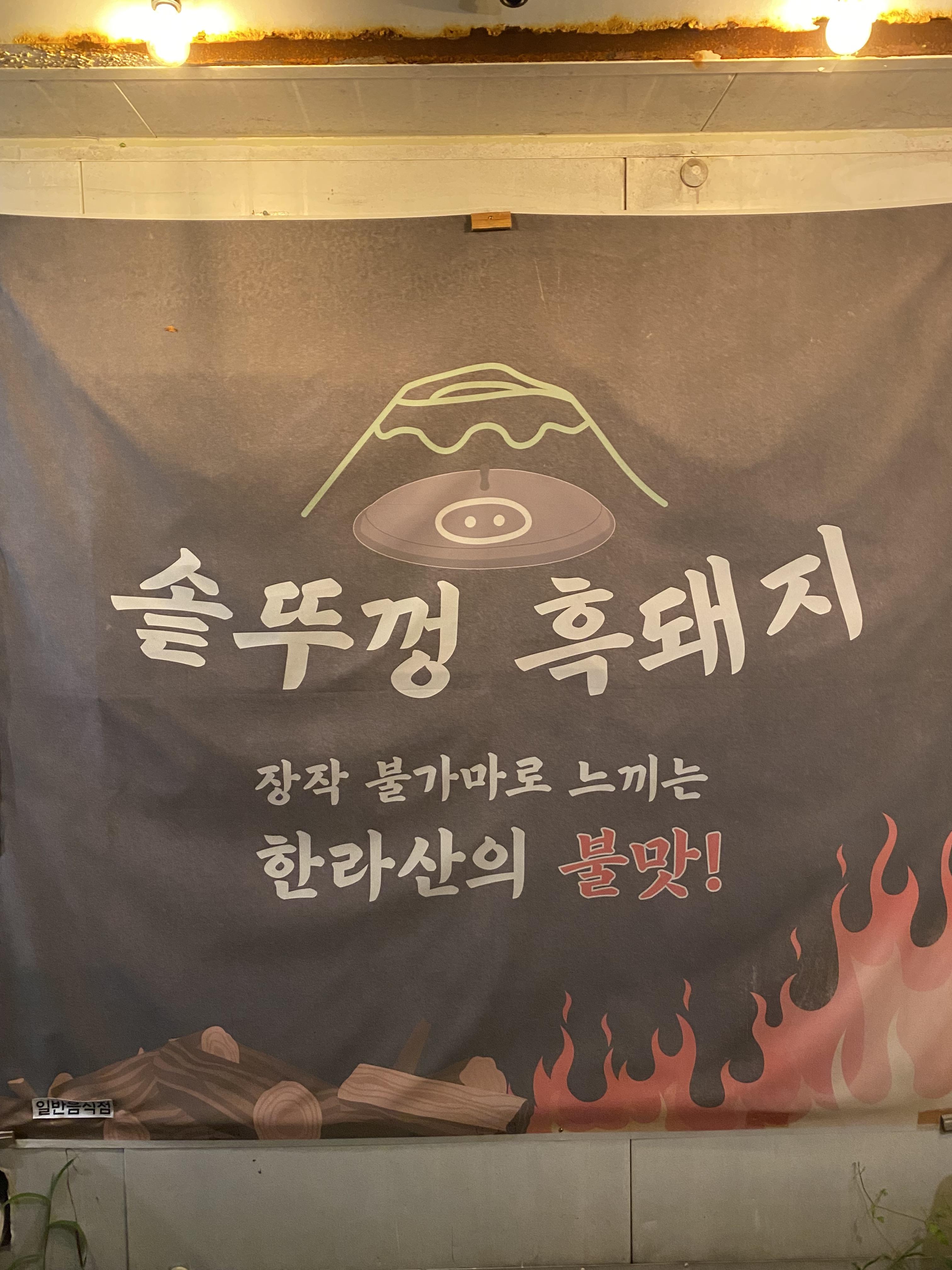 클리프 펍&카페에서 커피 한 잔과 제주 바다 뷰를 맘껏 즐겼더니 금세 저녁밥 먹는 시간이 되더군요. 그래서 숙소 체크인도 겸사겸사해야 하는 상황이라 숙소 가는 길 방향에 인스 핫플레이스 장소를 급하게 예약을 했답니다. 바로 '솥뚜겅 흑돼지'라는 식당인데 야외에서 솥뚜껑에다 장작불로 흑돼지를 구워주는 곳으로 인증샷 사진만 봐도 맛있을 것 같은 곳이었지요. 제주도 산 중턱쯤에 위치한 곳인데 도착했을 당시엔 이미 깜깜한 밤이 되어버린 상태라 내비를 보고 갔어도 까닥했으면 그냥 지나칠 뻔했다는.....