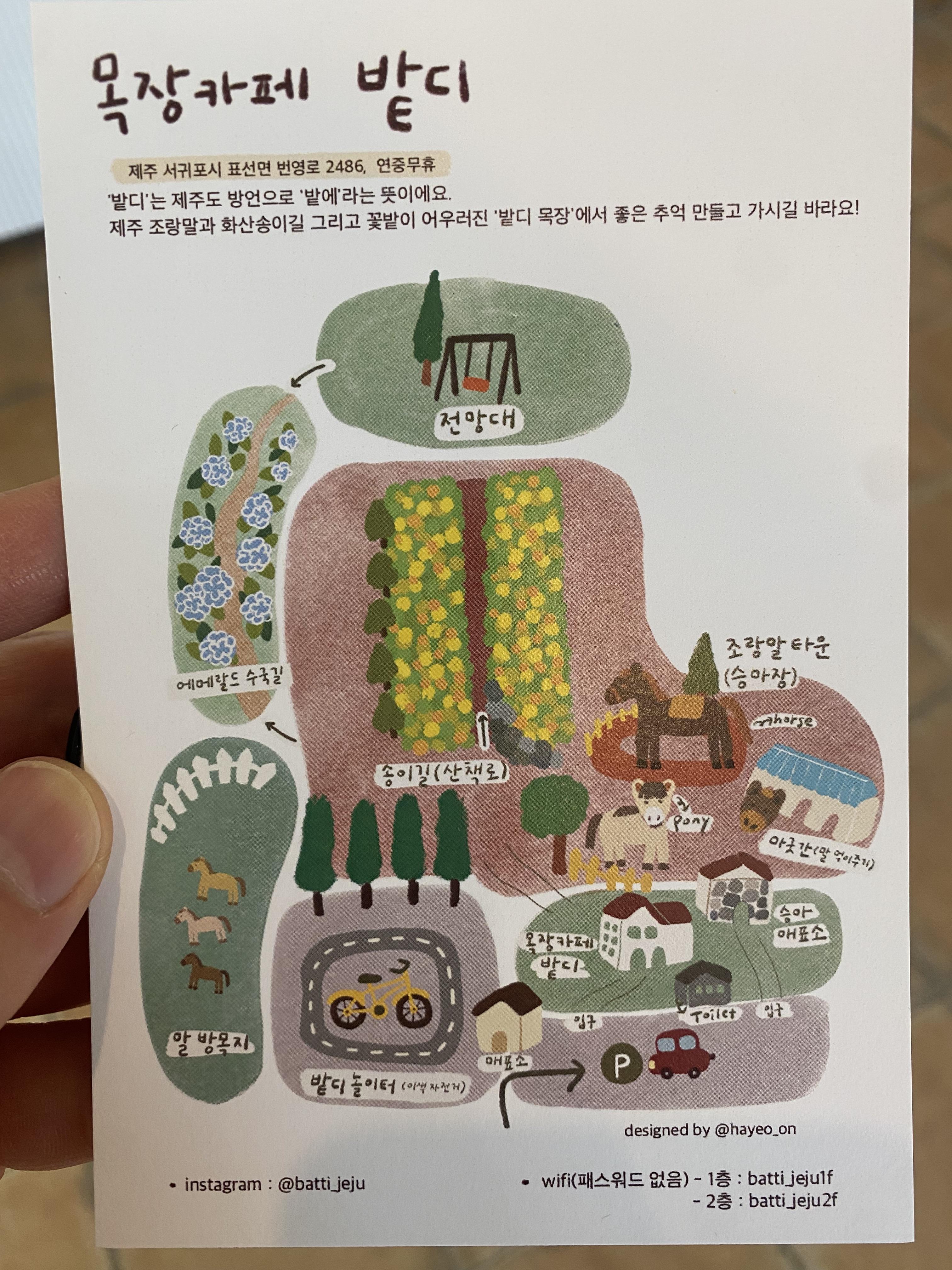 어승생 홀스랜드와 비교를 해보자면 홀스랜드는 진짜 승마장에서 제대로 된 체험을 즐길 수 있는 곳이고 목장카페 밭디는 승마 맛만 보고 만다고 해야 할까요? 가족끼리 와서 그냥 밭디 주변으로 걷기도 하고 커피도 마시고 여러 체험을 즐길 수 있는 놀이터 같은 느낌이랄까요? 두 곳이 명확하게 장단점이 나뉩니다. 승마를 좀 길게 즐기고 싶다면 어승생 홀스랜드를 가는 걸로~ 그냥 이것저것 알차게 즐기는 승마를 하고 싶다면 밭디도 좋은 선택이 되지 않나 싶네요. 그래도 승마를 언제 즐겨보겠습니까? 아빠는 어승생 홀스 랜드에 한 표!!!