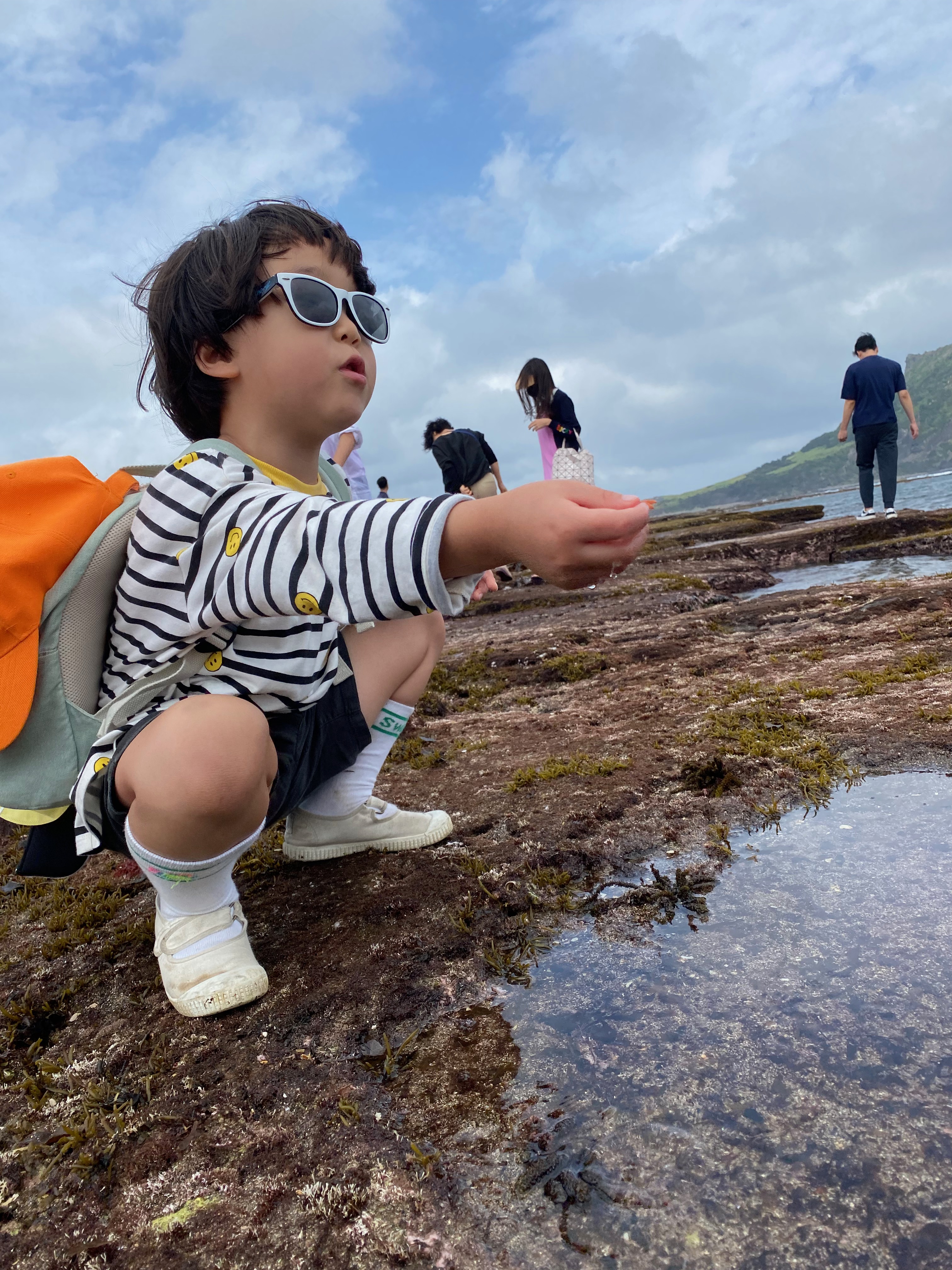 아쿠아플라넷 제주에서 성산일출봉 가는 길에 있는 해변인데 썰물일 때 가보면 갯벌 해변이 아니고 평평한 바위들이 드러나는데 다양한 해양생물들을 만나볼 수 있는 살아있는 체험장이 열립니다. 저희는 복귀 시간이 점점 다가오느라 그리 오래 있지는 못했어요.