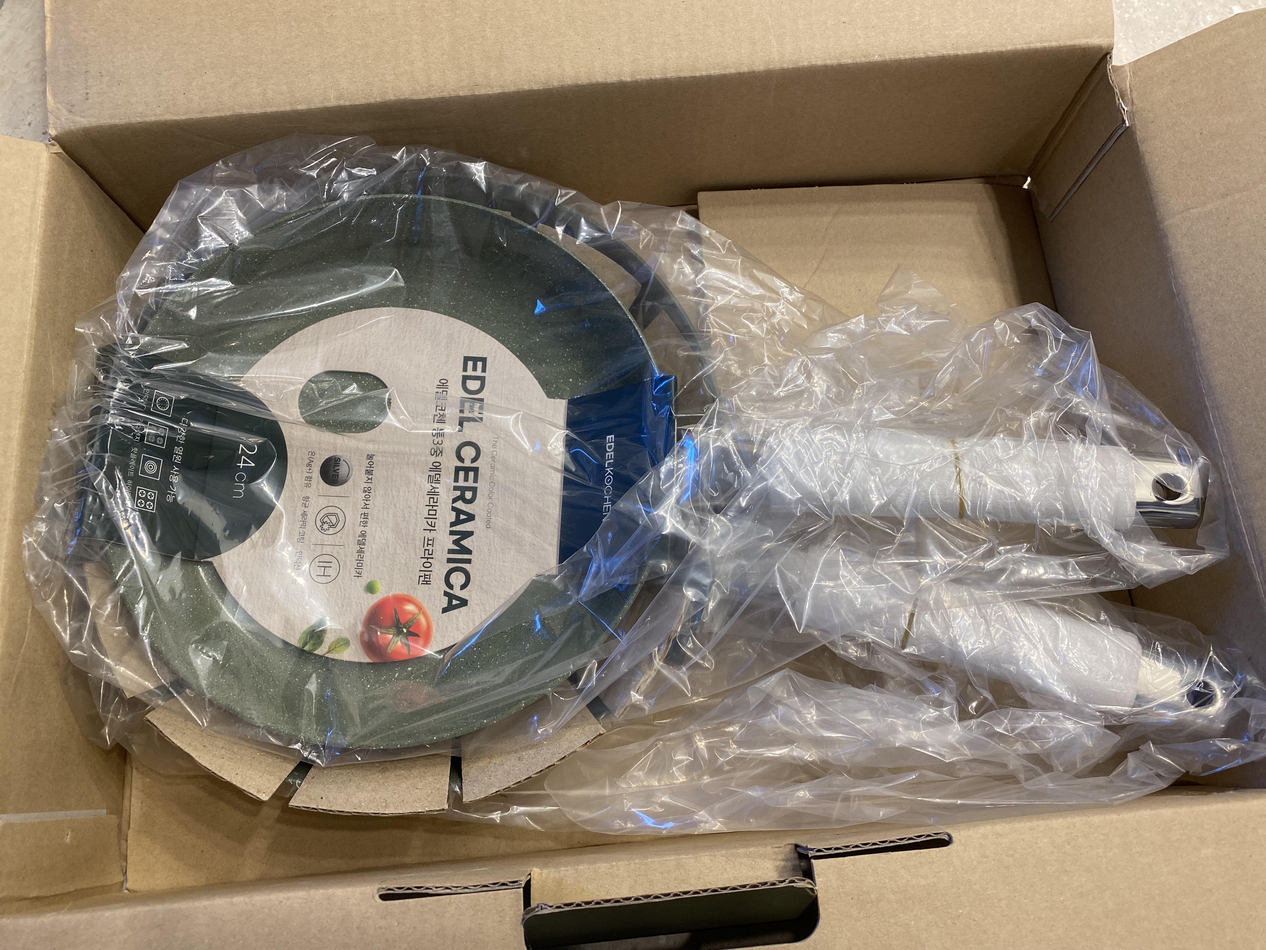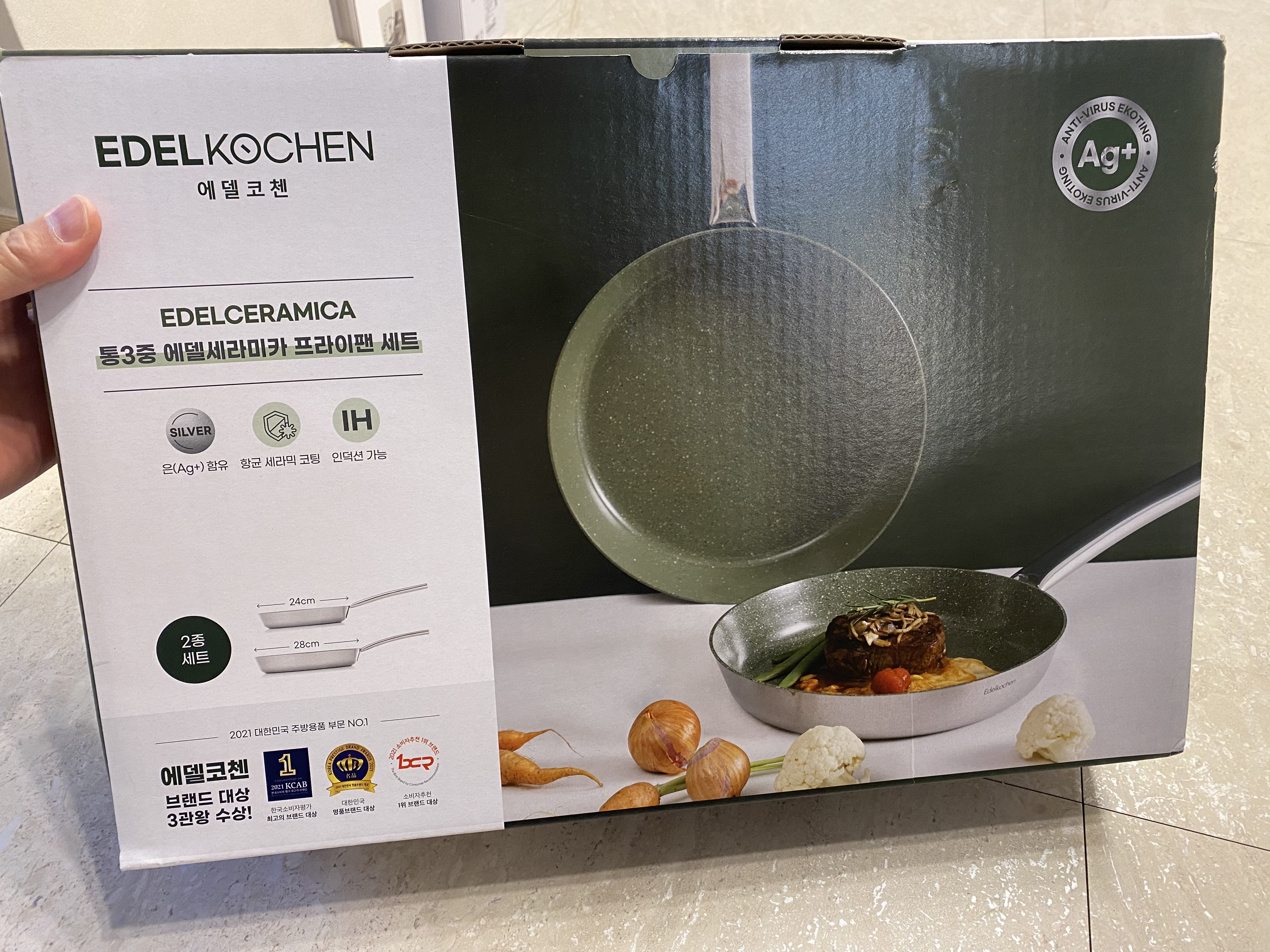 두 종류의 프라이팬이 들어가 있습니다. 앞번에 사용한 이케아 프라이팬 제품이 나름 괜찮았으나 보통 육 개월 사용하면 코팅이 다 날라가 새 제품으로 교체를 해줘야 한다고 백종원님이 평소 방송에서도 자주 얘기를 하자나요? 이케아가 가격 대비 가성비가 무척 좋아서 잘 사용했으나 코팅도 날라갔기도 했고 침수피해로 도저히 사용하기 찜찜한 상태라 과감히 폐기처분을 했답니다. 에델코친 프라이팬을 받아보니 확실히 일반적인 프라이팬과 좀 다릅니다. 세라믹 코팅이 뭔가 싶은데 이게 뭔 도자기 같은 느낌도 나면서 좀 두껍게 코팅이 되어있다는 느낌적 느낌이 납니다. 그리고 많이 무겁지가 않아서 손목에 부담도 덜하다는~