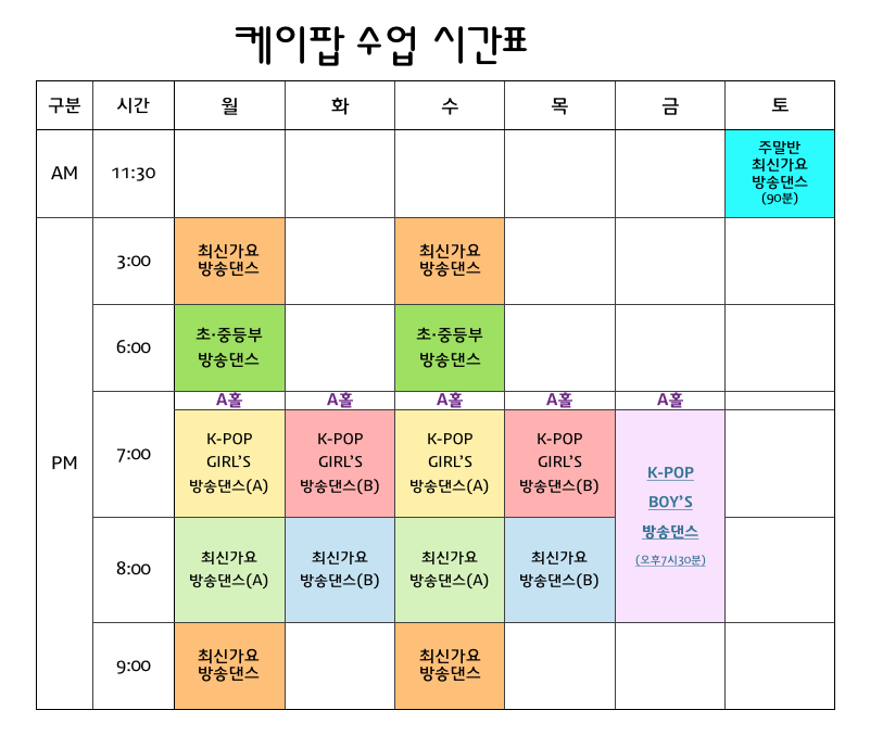 11월 제이댄스 수업 시간표 안내합니다. 개인 사정으로 잠시 떠나 있었던 월, 수 9시와 주말반 케이팝 수업을 담당했던 강사님께서 석 달간의 휴양을 끝내고 드디어 복귀를 하게 됩니다. 많이 기다려 주신 회원님들과 주말 수업에 문의를 해주신 분들께 다시 한번 감사의 인사를 전합니다. 기다린 만큼 값진 수업이 되도록 열심히 준비하고 있으니 지금 바로 참여해 주시면 되겠습니다. 초등부 수업과 화, 목 저녁 7시 수업은 주로 학생들이 많이 참여하는 시간이고 월, 수 7시와 화, 목 8시 수업에 일반인들이 많이 참여하는 시간으로 자연스럽게 나눠져있습니다. 각 반별 강습인원은 10명 내외로 아직 쾌적한 수업이 진행되고 있으니 케이팝 방송댄스를 배우고 싶은 분들은 안내글 다시 잘 확인하셔서 본인에게 맞는 수업을 선택해서 즐겁게 스트레스도 풀고 자신감도 되찾는 시간을 가져보세요^^ 매시간별 수업 진도가 제각기 다르기 때문에 반드시 카톡이나 전화로 원하는 수업에 관련된 정보를 안내받으시고 수강계획을 잡으시기 바랍니다!!