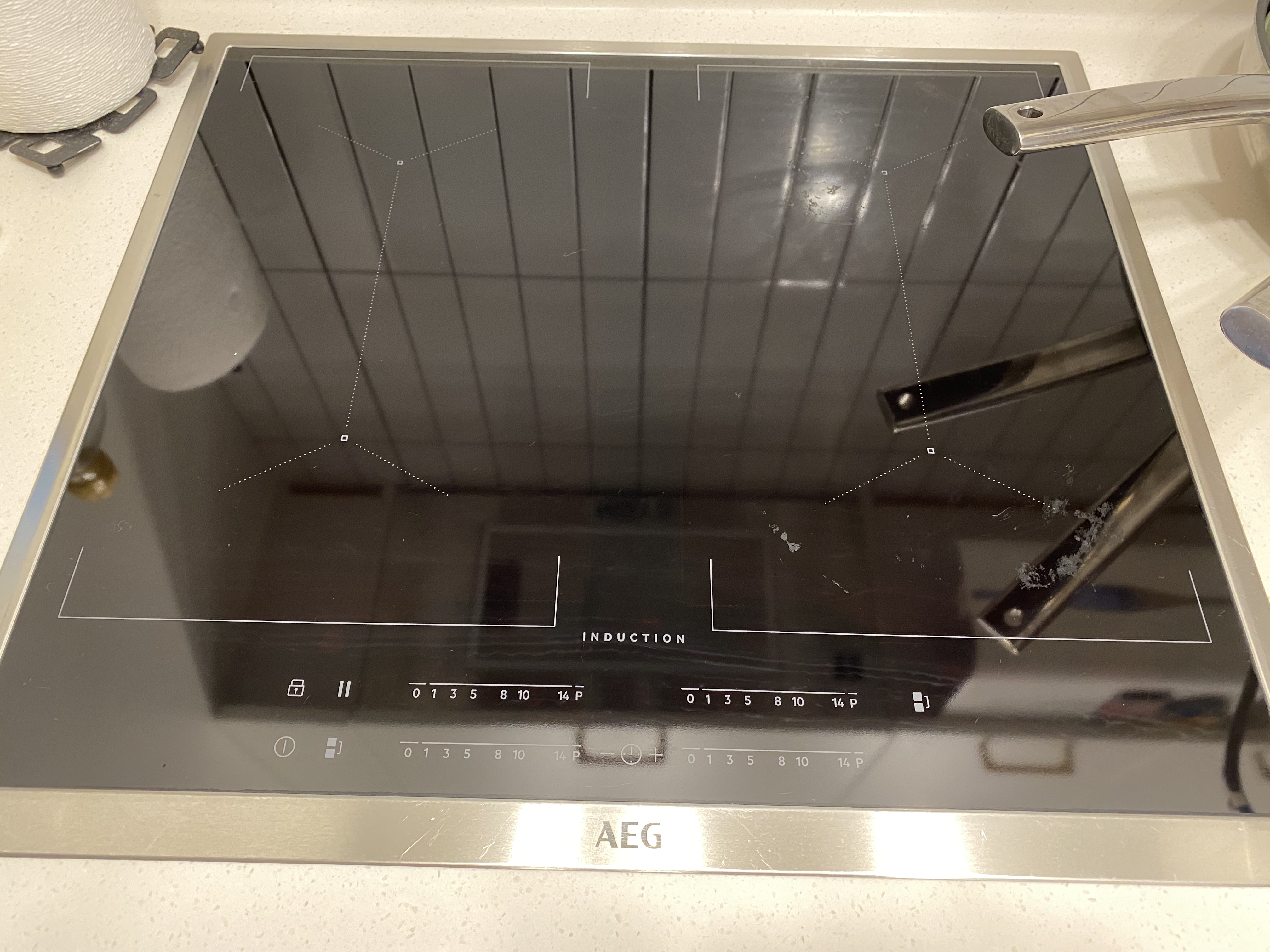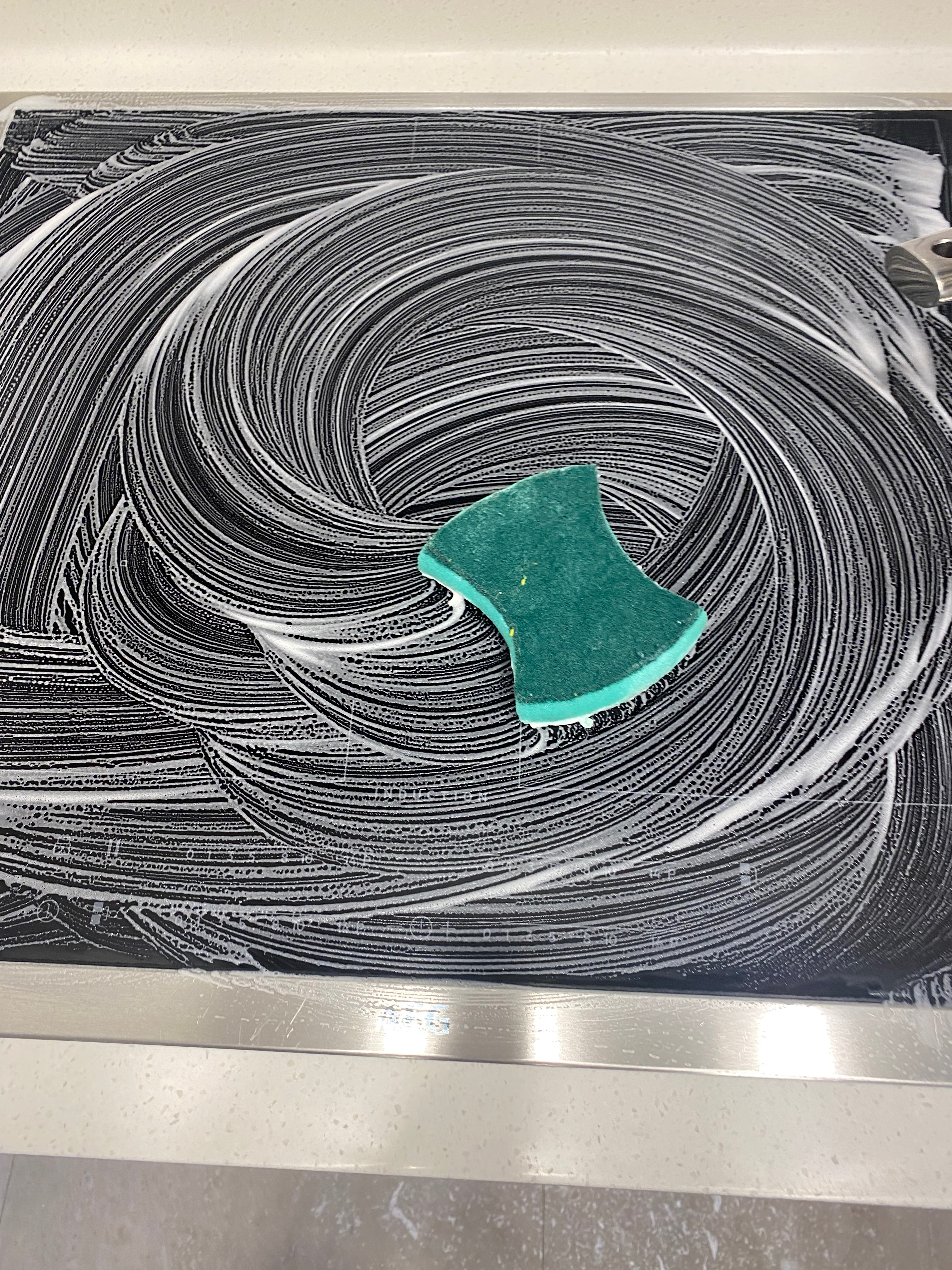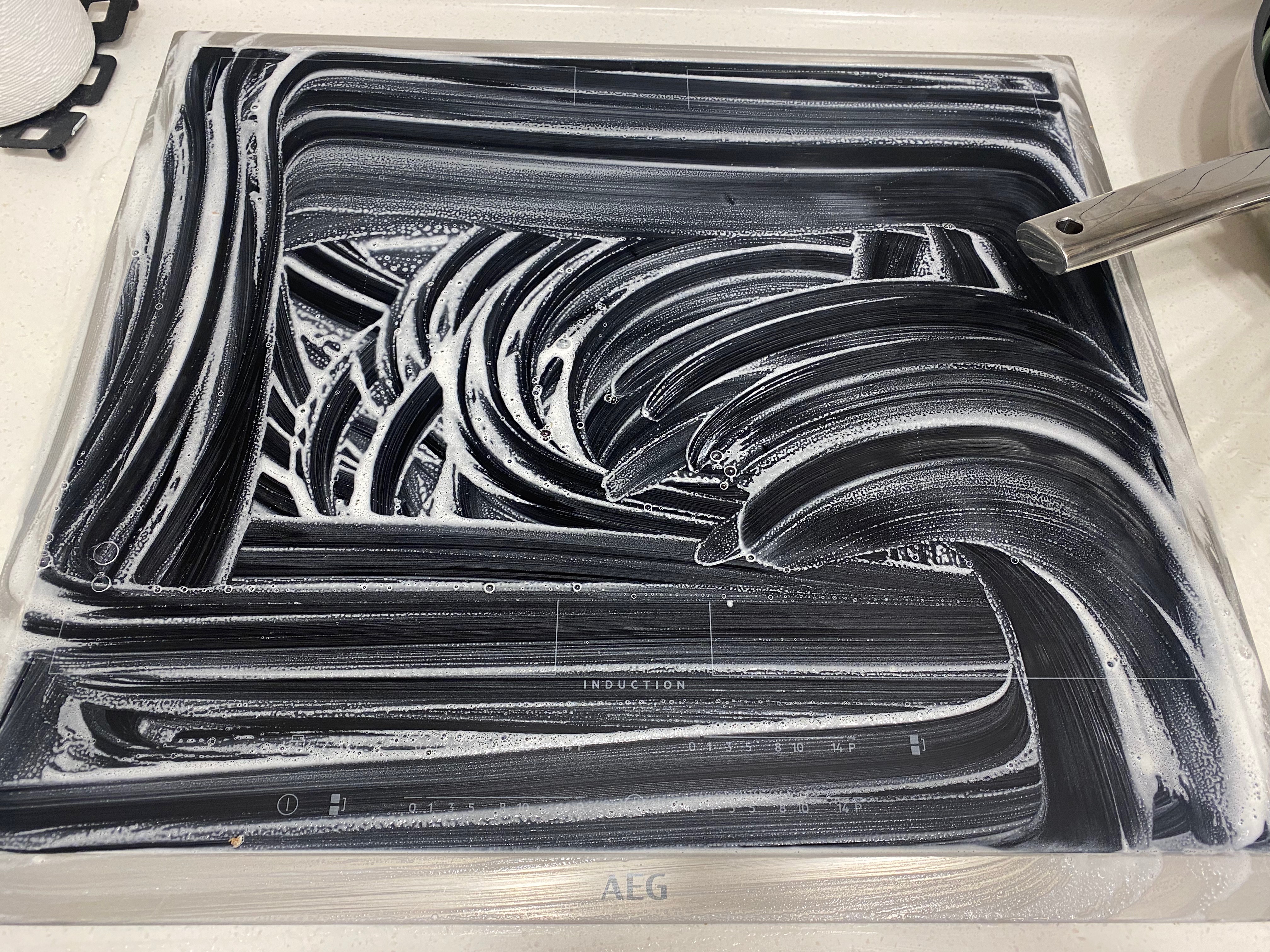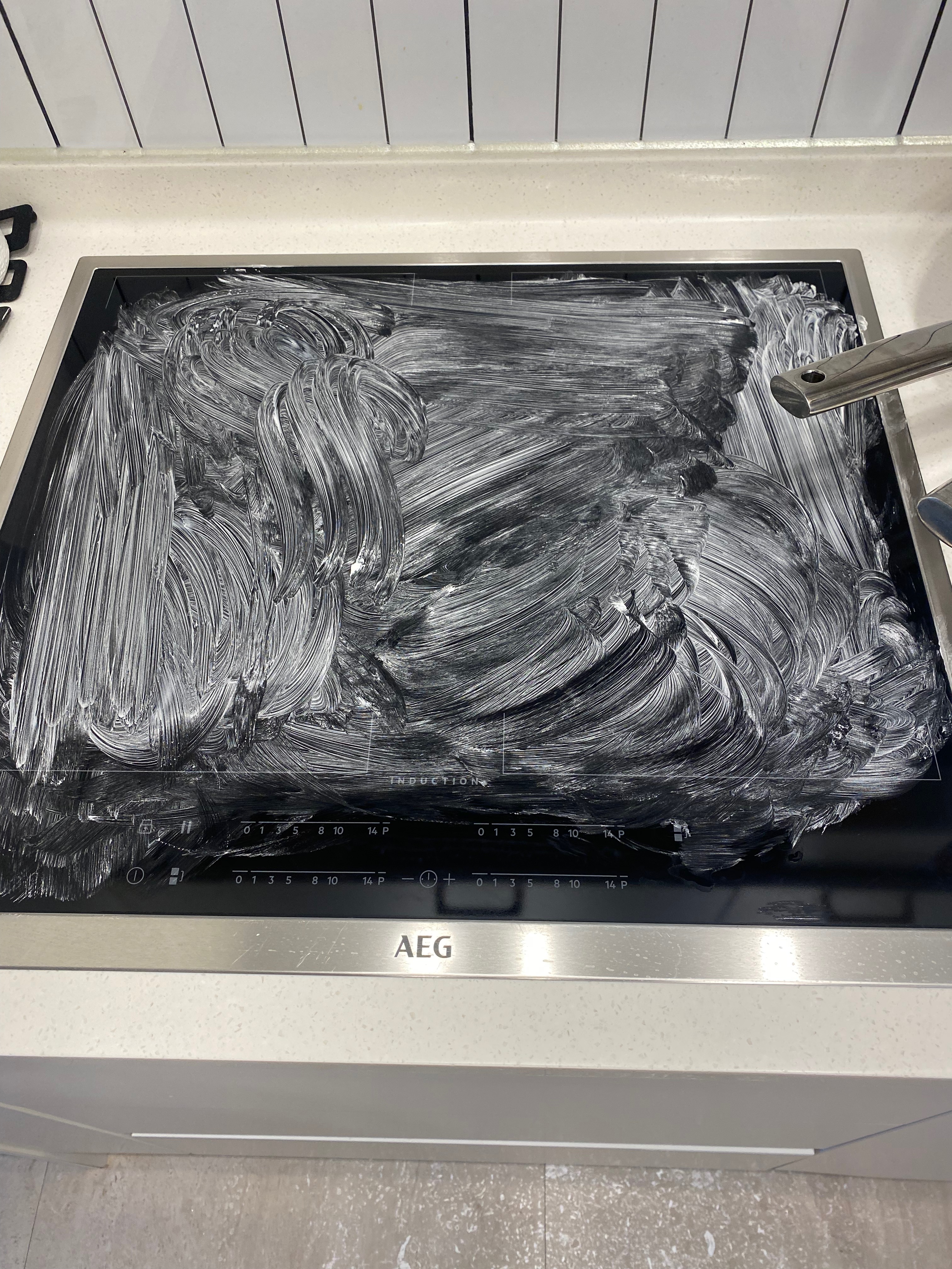 오늘 사진은 인덕션 상판에다 사용해 봤는데 다용도이면서 스테인리스 냄비를 새 제품까지는 아니어도 아주 깨끗한 상태로 만들어 주는 클리너 크림입니다. 암튼 인덕션 상판에 크림을 넓게 아주 잘 발라 줍니다. 그런 다음 10분 정도 불려주고요.