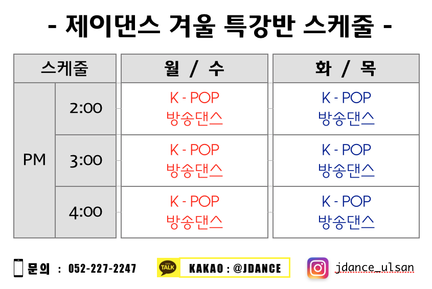겨울 특강반 시간표는 아래 스케줄 보고 참고하시면 되겠습니다. 수험생들과 대학생들은 겨울 특강반 스케줄 잘 보시고 최대한 빨리 수강신청을 하면 내년 2월 중순까지 최신 케이팝 안무를 최대한 많이 배울 수 있습니다. 특히 신입생 장기자랑 준비를 하는데 겨울 특강반이 도움 많이 되실 거예요^^