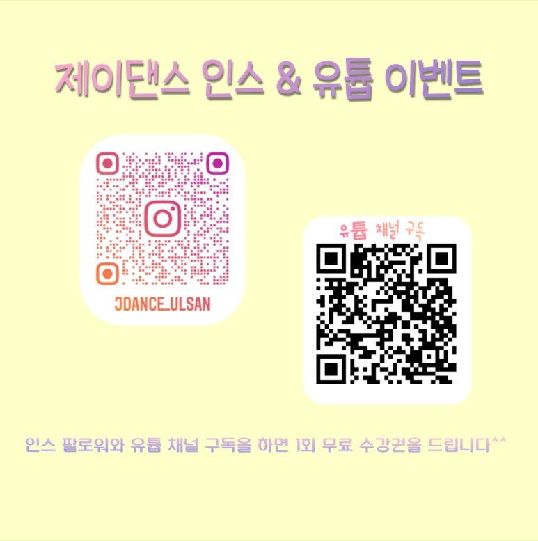 제이댄스 학원의 인스타 & 유튜브 팔로워와 채널 구독하기를 누르면 최신 수업 영상도 즐길 수 있고 더불어 제이댄스 학원에서 진행하는 모든 클래스 수업 중 하나를 선택해 1회 무료 수강 혜택도 누릴 수 있습니다. 지금 바로 QR코드로 간편하게 제이댄스와 친구가 되어 주세요^^
