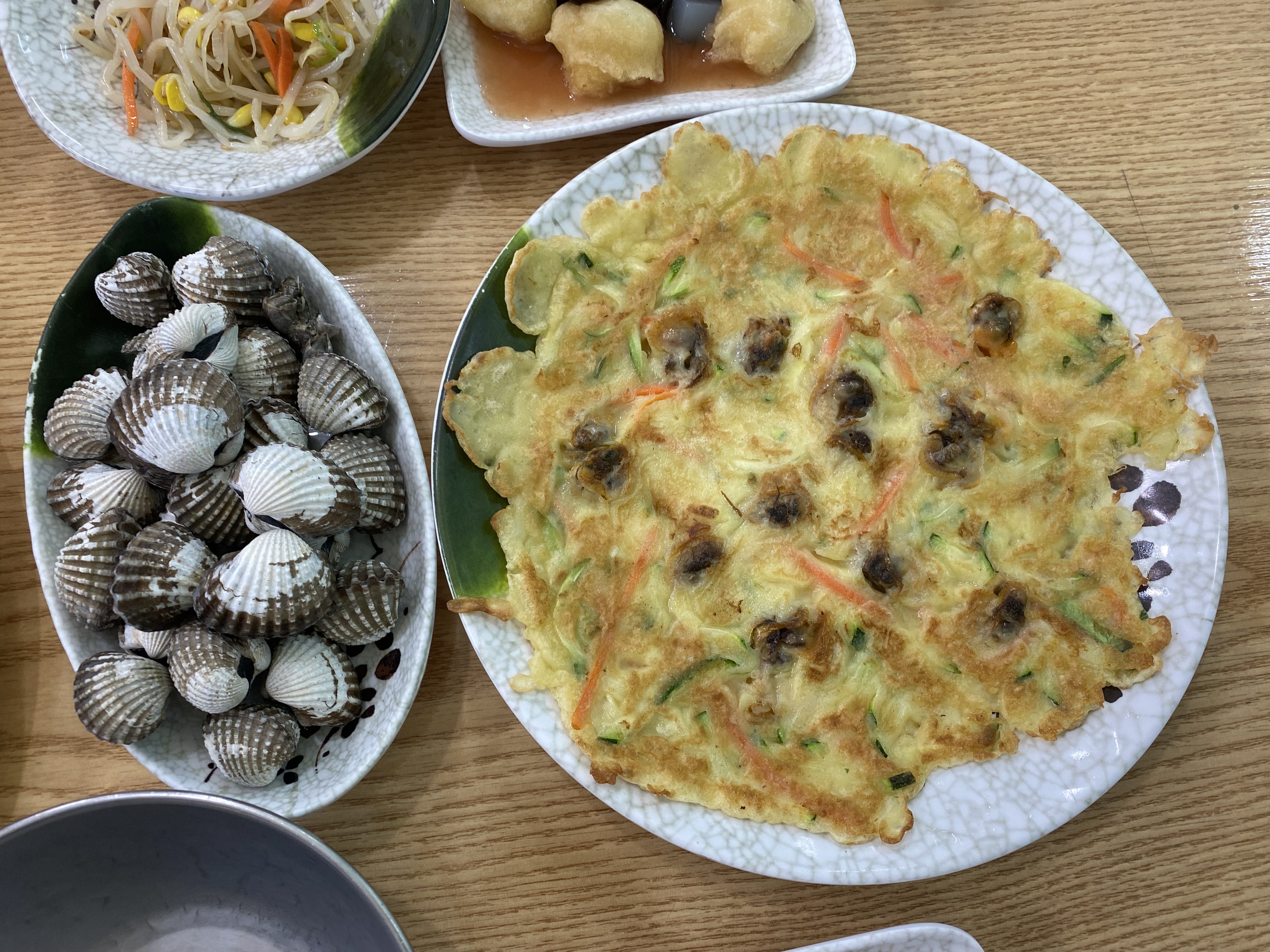 까먹는 꼬막이 삶은 꼬막이고 꼬막전, 양념꼬막, 꼬막탕수육, 꼬막무침, 꼬막된장국이 밑반찬과 함께 한꺼번에 세팅이 됩니다. 꼬막전은 호박과 당근이 같이 들어가 있어서 호박전 먹는 맛인데 중간중간 꼬막이 마치 올리브 토핑된거 같다는 느낌으로다가~ 맛있네요. 꼬막탕슉은 음.... 그냥 맛만 살짝 보세요. 식어서 맛이 엄서요...ㅠㅠ