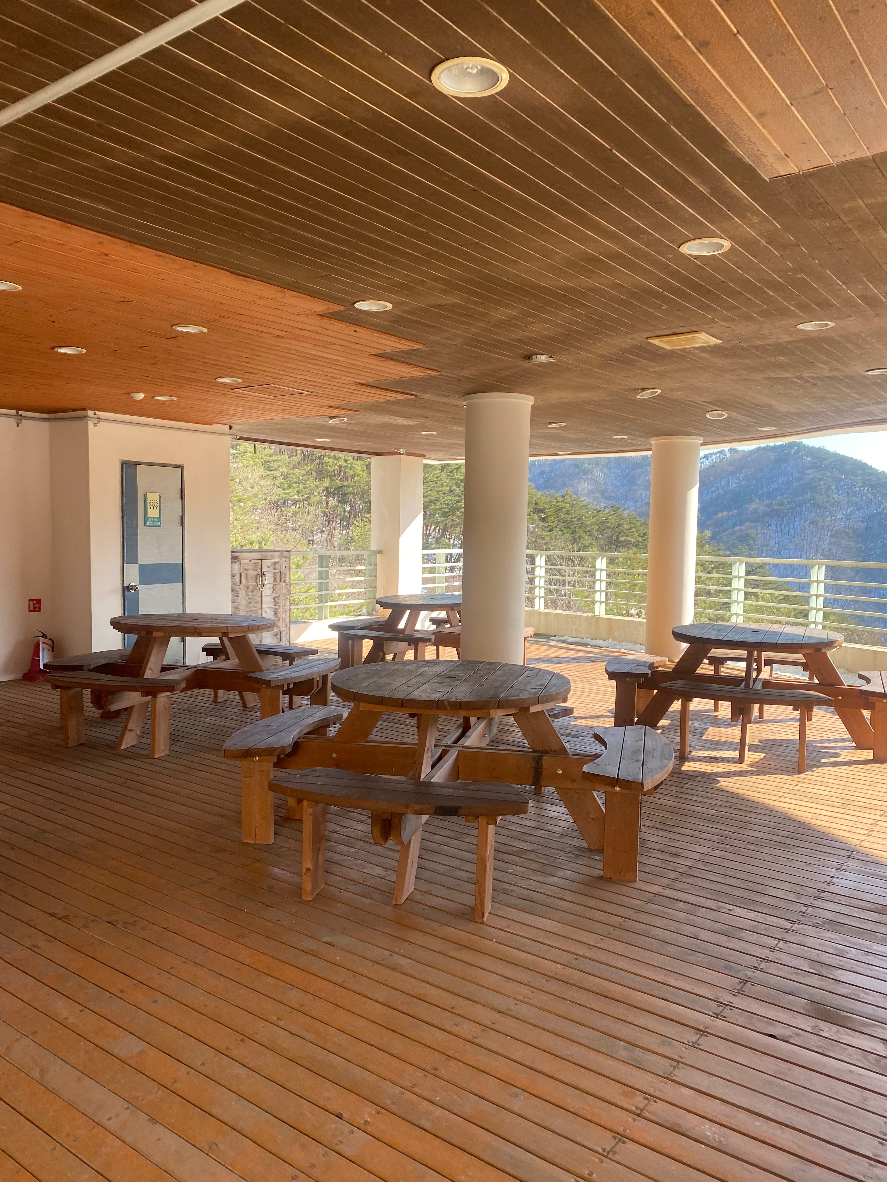 건물 입구에 들어서면 야외에서 식사나 차를 할 수 있는 테이블이 마련되어 있습니다. 한겨울 추운 날만 아니면 뷰를 즐기며 여유를 만끽할 수 있는 공간이 아닌가 생각됩니다.
