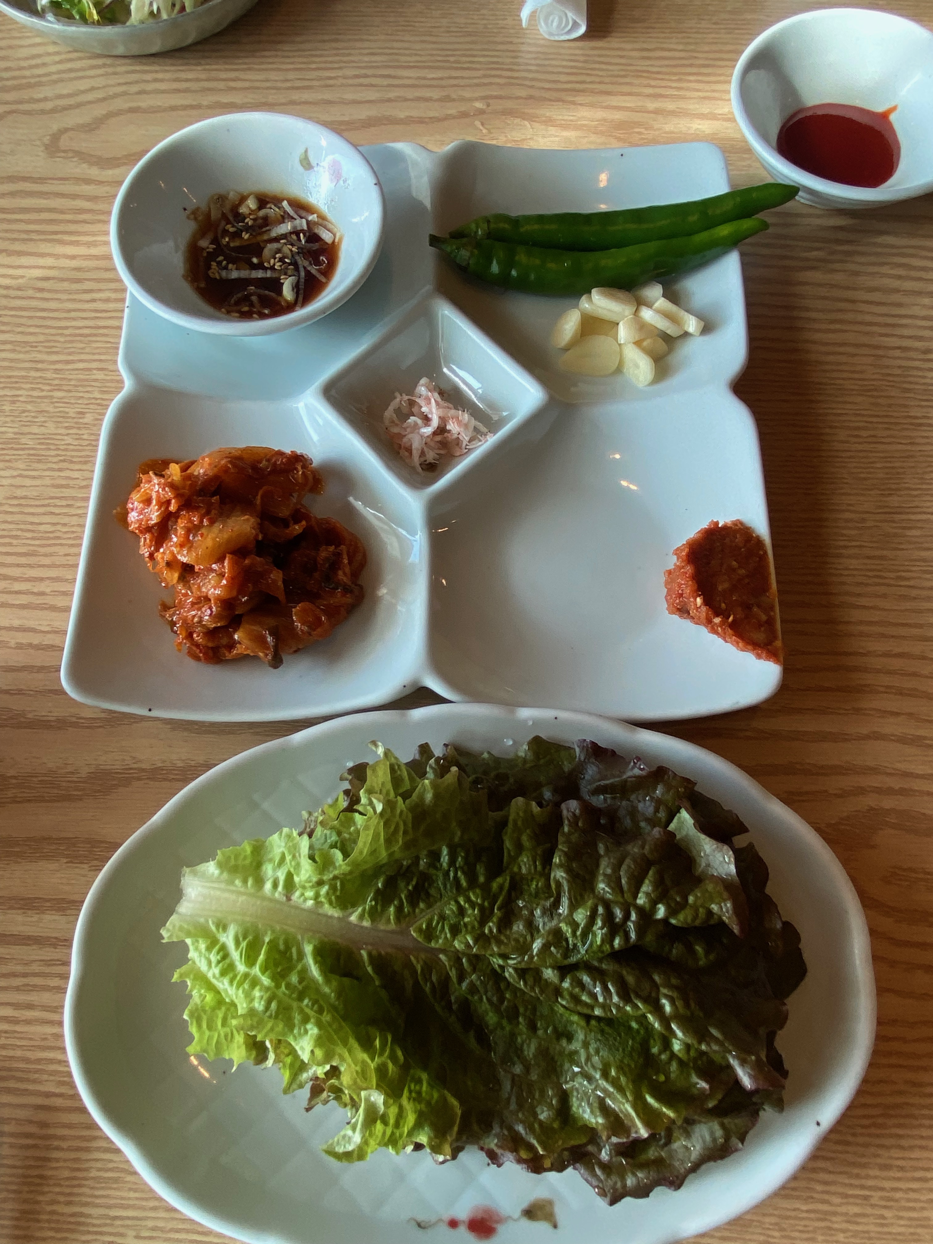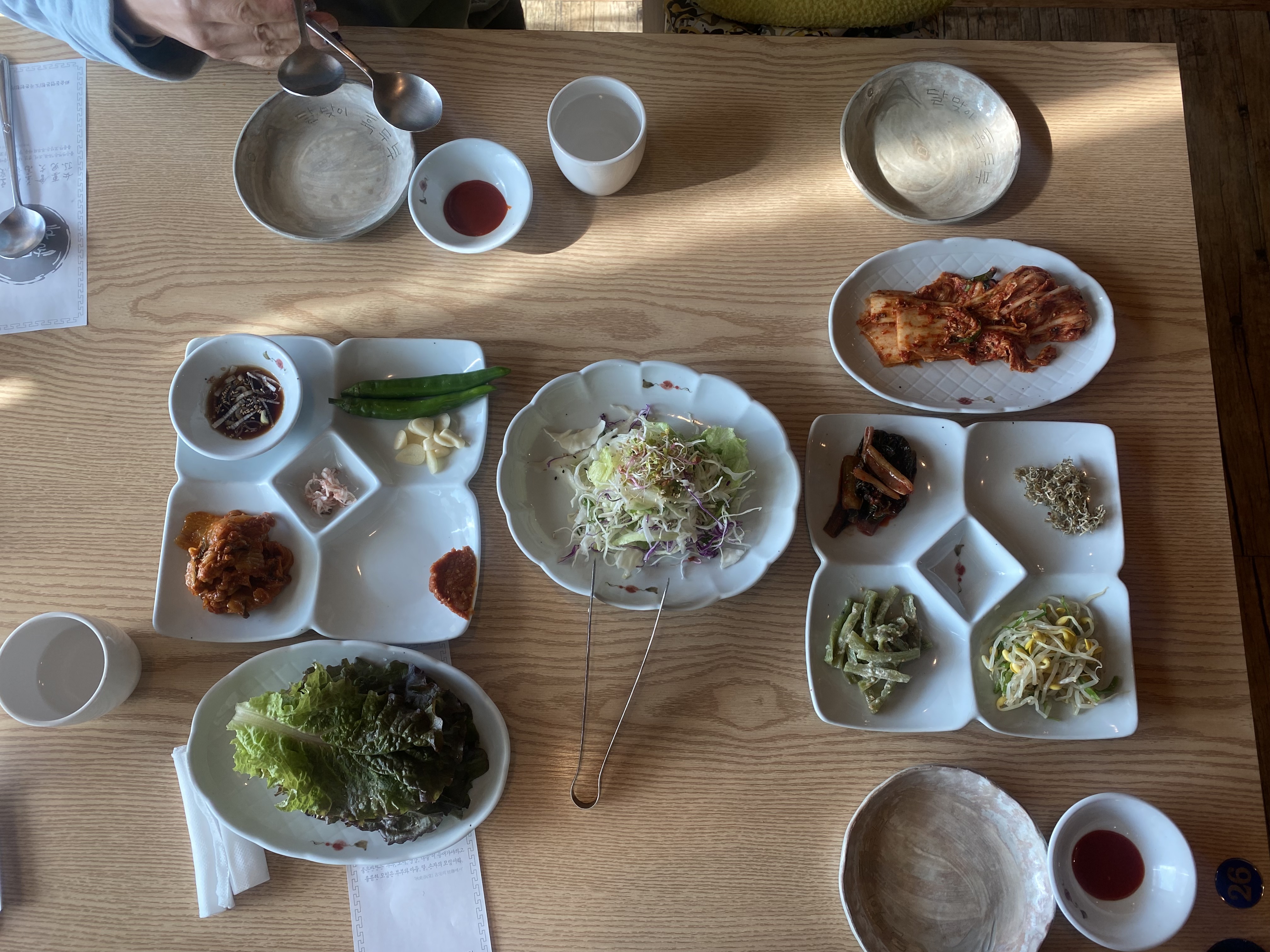 기본 밑반찬이 쌈, 샐러드와 함께 정갈하게 한상 잘 차려져 나옵니다.