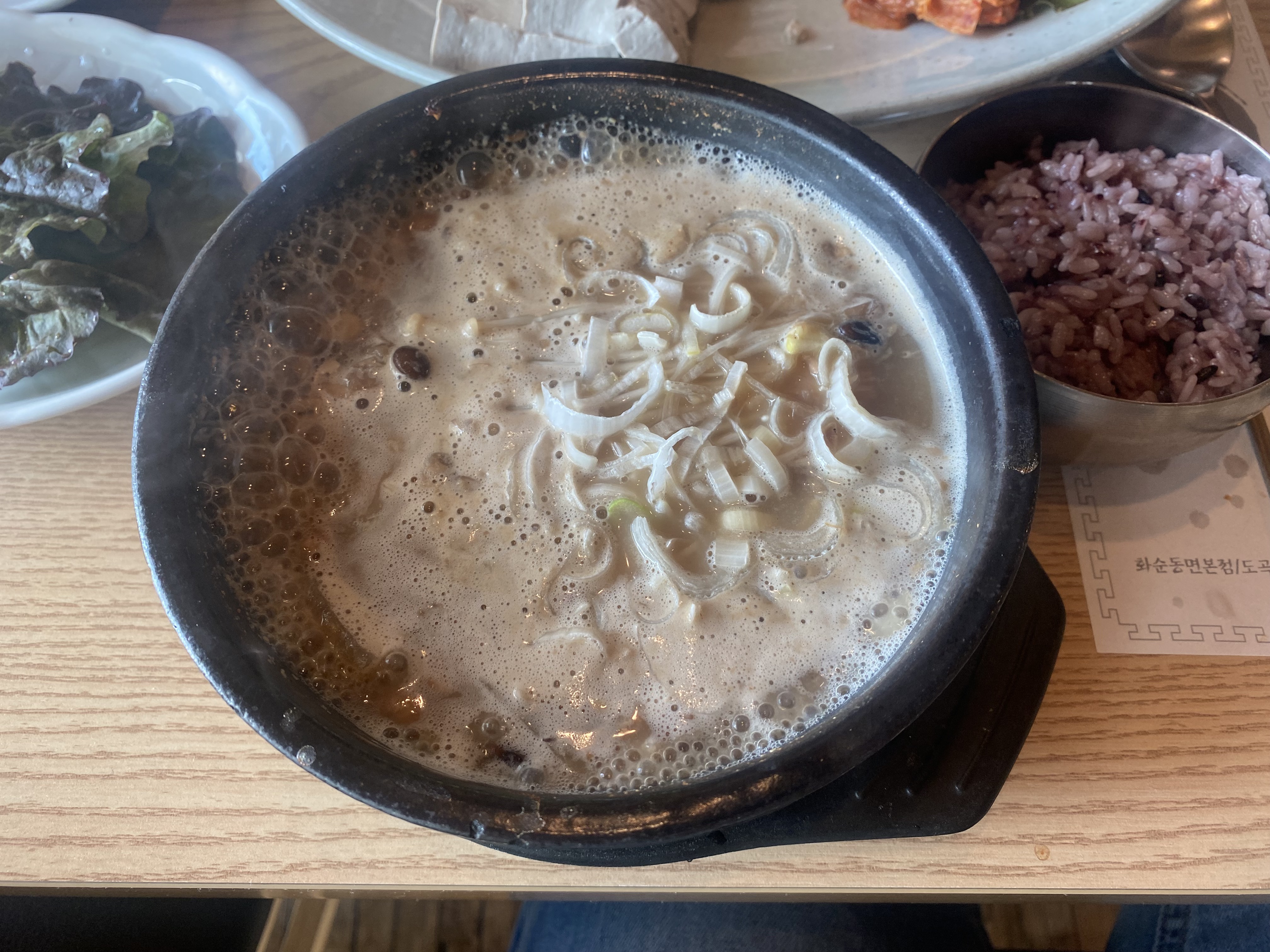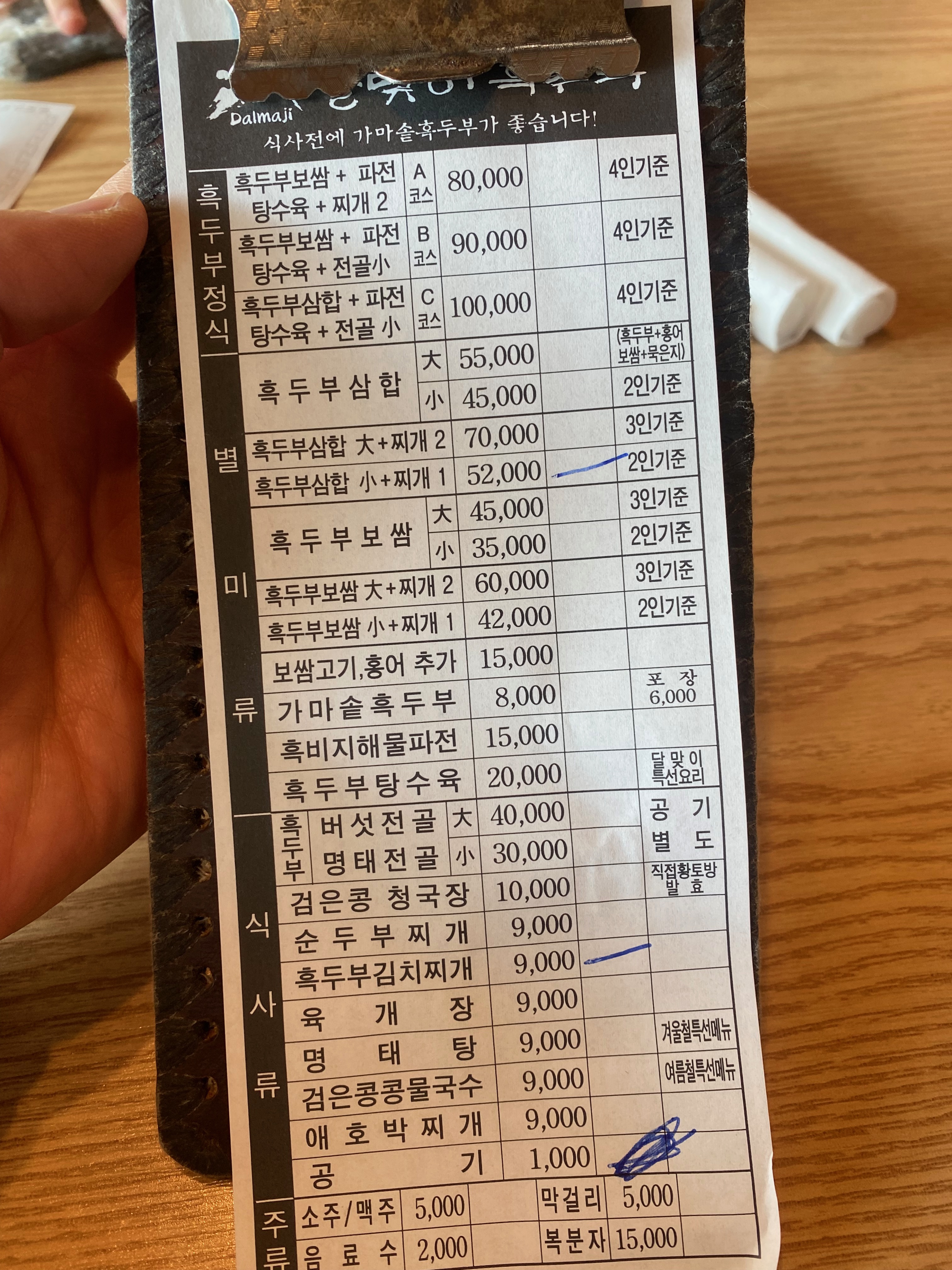 실내가 무척 깨끗하고 탁 트여있고 무척 넓습니다. 천장이 높아서 더 그렇게 느껴집니다. 메뉴판은 따로 없었고 계산서가 메뉴판을 대신했는데요, 소식좌 와이프님 때문에 많은 걸 맛보고 싶었지만 꾹 참고 흑두부삼합 소짜 + 청국장찌개, 그리고 추가로 흑두부 김치찌개를 시켰습니다.