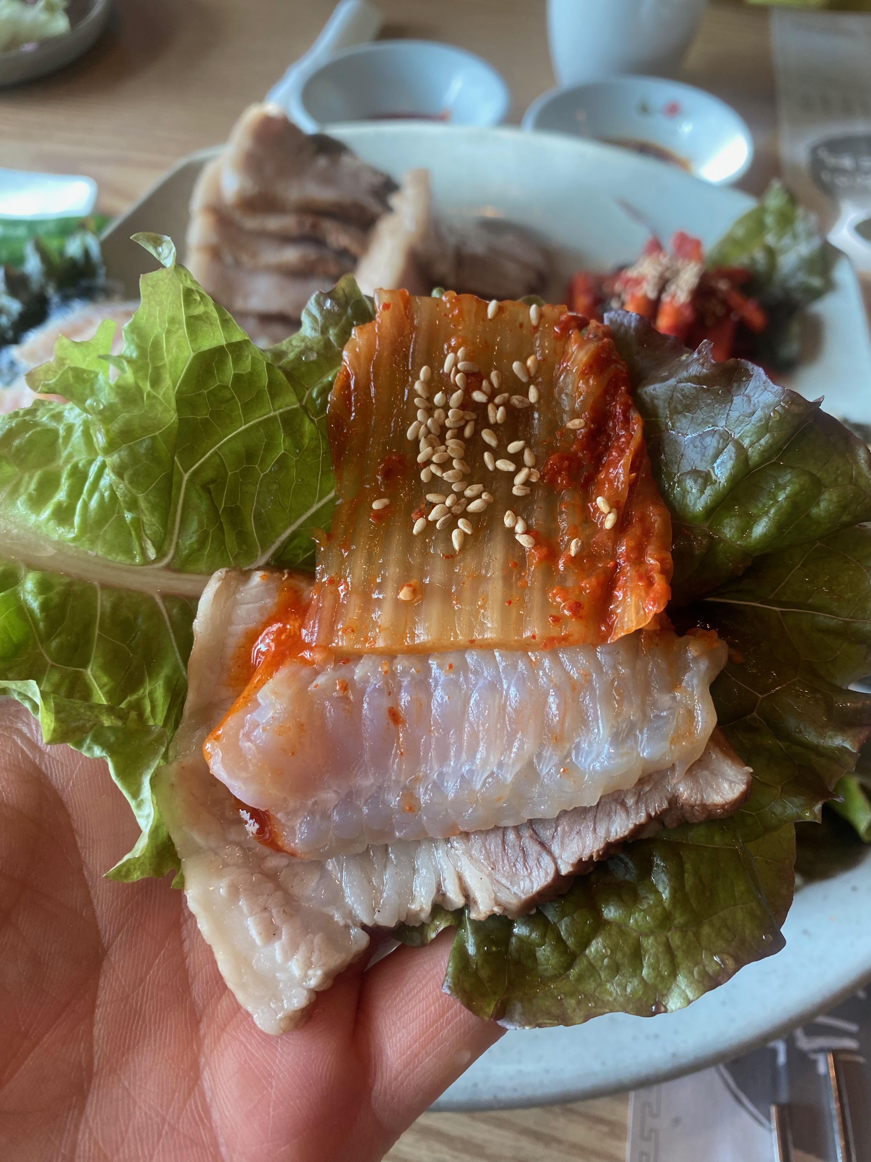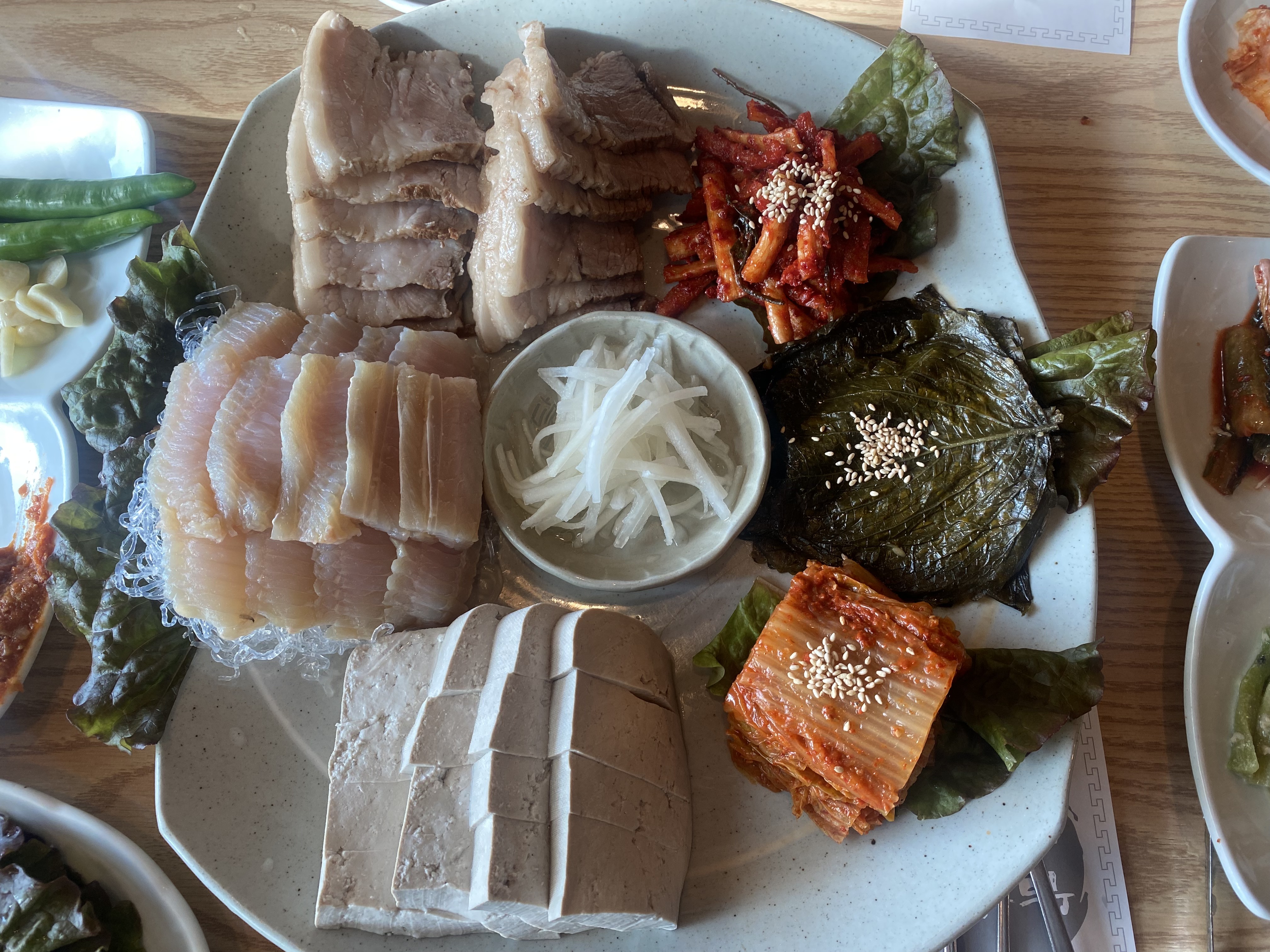 드디어 메인메뉴 흑두부 삼합이 짜잔~!! 보는 순간 입에서 군침이.... 바로 한 쌈 해봅니다. 얼마 만에 맛보는 삼합인지. 캬~~~~~무조건 막걸리 타임이었는데 오후 일정도 남아있고 해서 겨우 참으며 음식에만 집중을 합니다.ㅠㅠ 홍어는 국내산인지 아닌지 잘 모르겠으나 디게 톡 쏘는 정도는 아니고 삼합 한 쌈 입에 넣으면 딱 먹기 좋은 정도의 삭힘이었네요. 흑두부도 어찌나 꼬시고 맛나던지. 김치도 실로 오랜만에 맛보는 정통 남도식 김치라 국물 거의 없고 딱 제가 원하던 맛의 김치였습니다.