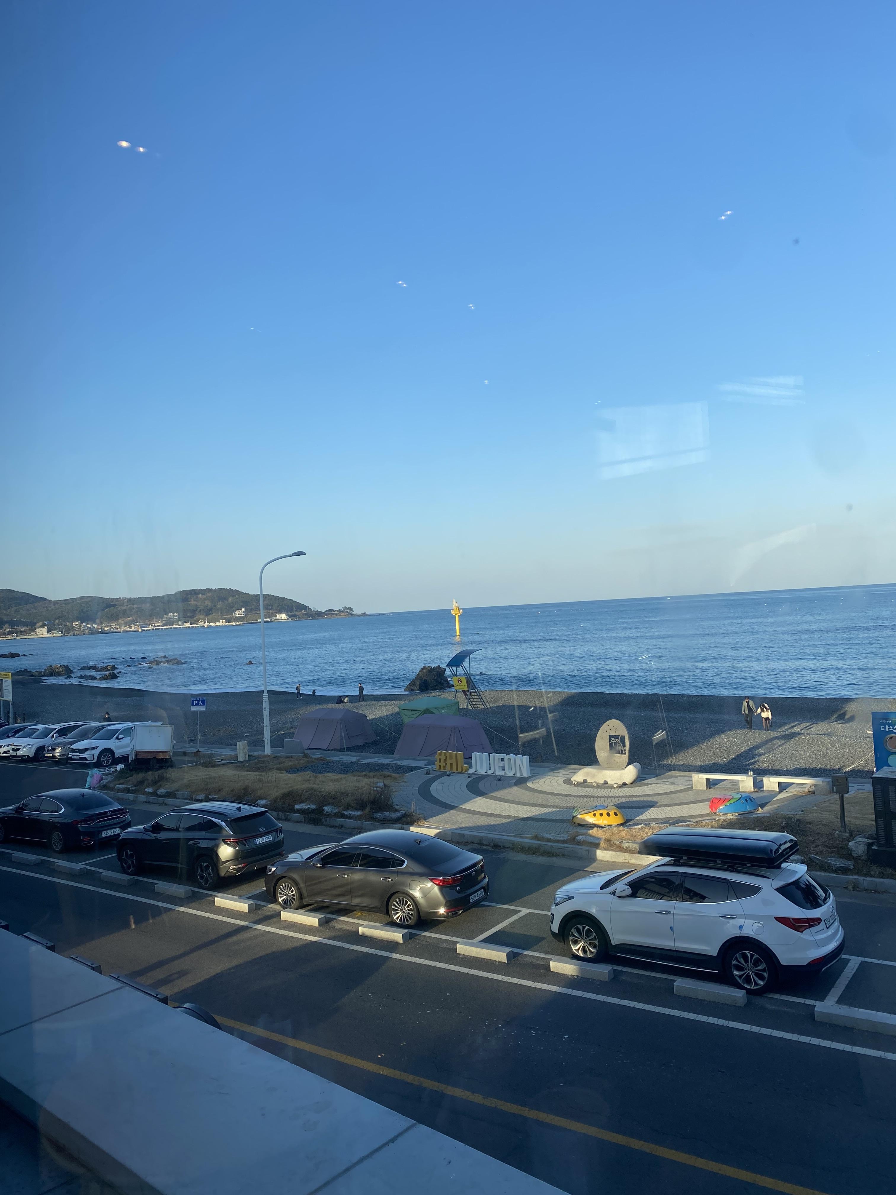와이프님은 아직도 주전, 정자, 강동 넘 헷갈려 하는데요 주전은 동구에서 가면 가장 먼저 만나는 바다입니다. 요쪽 라인은 대부분 자갈밭으로 되어 있고요, 시원한 파도에 자갈 데구르르~~ 굴러가는 소리가 일품인 돌 멍하기 딱 좋은 바다랍니다. 그런 주전 바다 앞에 떡하니 엄청 크게 자가 건물로 스타벅스가 쨔잔~!!