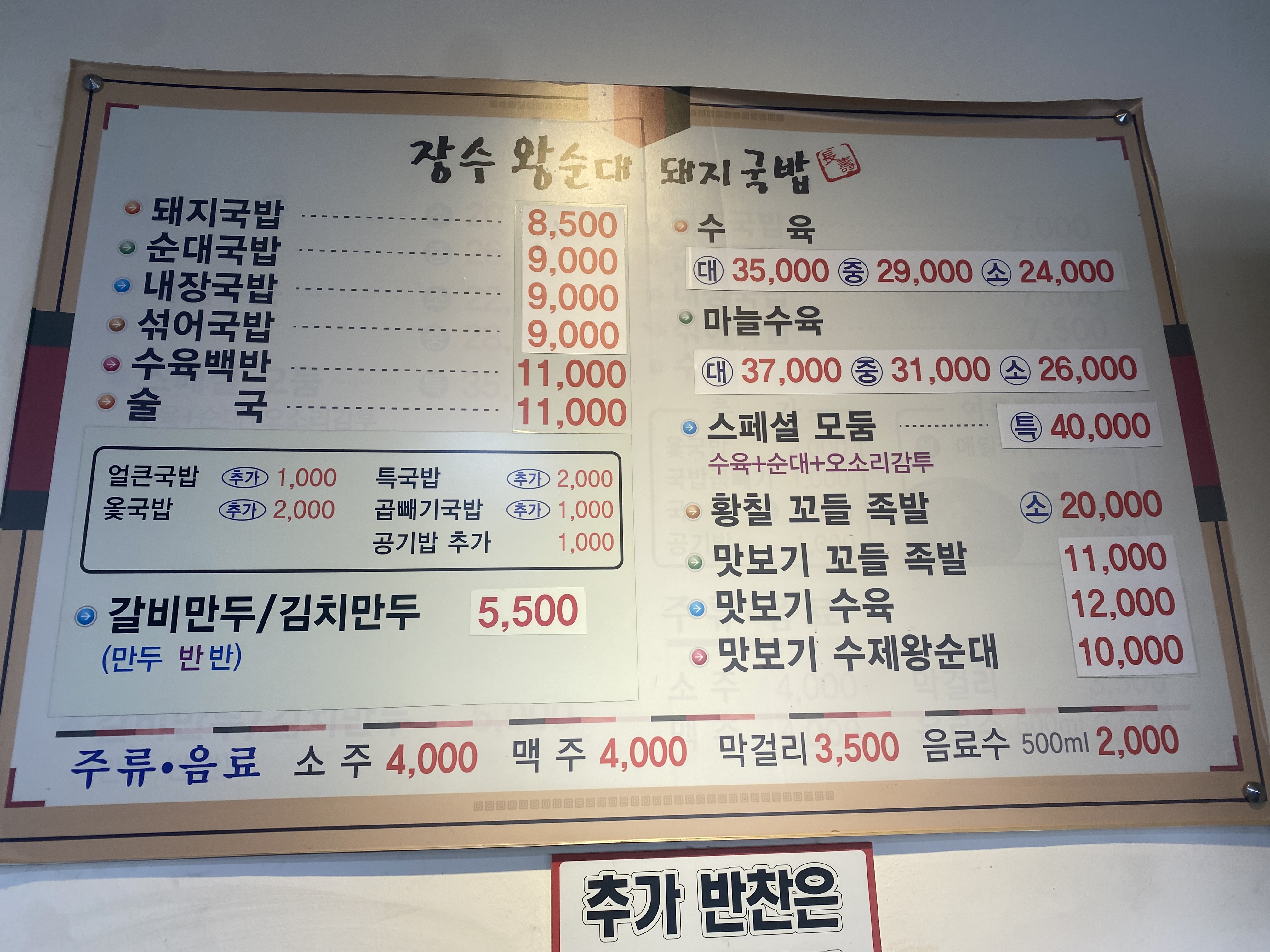 식당 내부는 조명이 좀 어둡고 인테리어도 좀 오래된 듯한 느낌이 나서 쨍한 그런 기분은 안 나는 식당입니다. 메뉴판 가격을 보니 물가가 많이 올라 밥 한 끼 식삿값도 만만찮게 드네요ㅠㅠ 포장으로 두 번을 먹었는데 맛보기 수육이랑 맛보기 수제 왕순대를 먹었습니다. 혼자서 야식으로, 혼술 안주로 초강추 합니다!!!