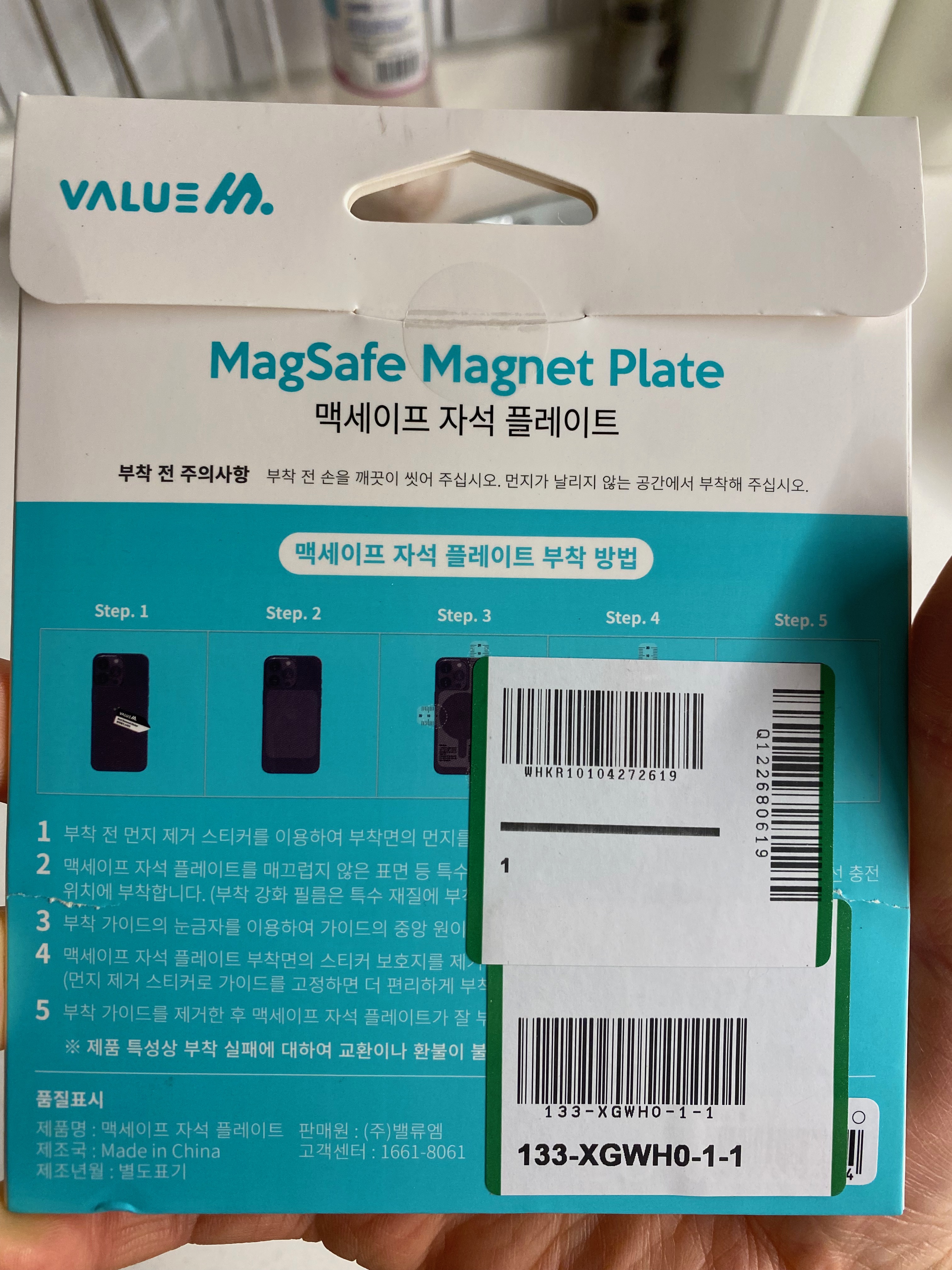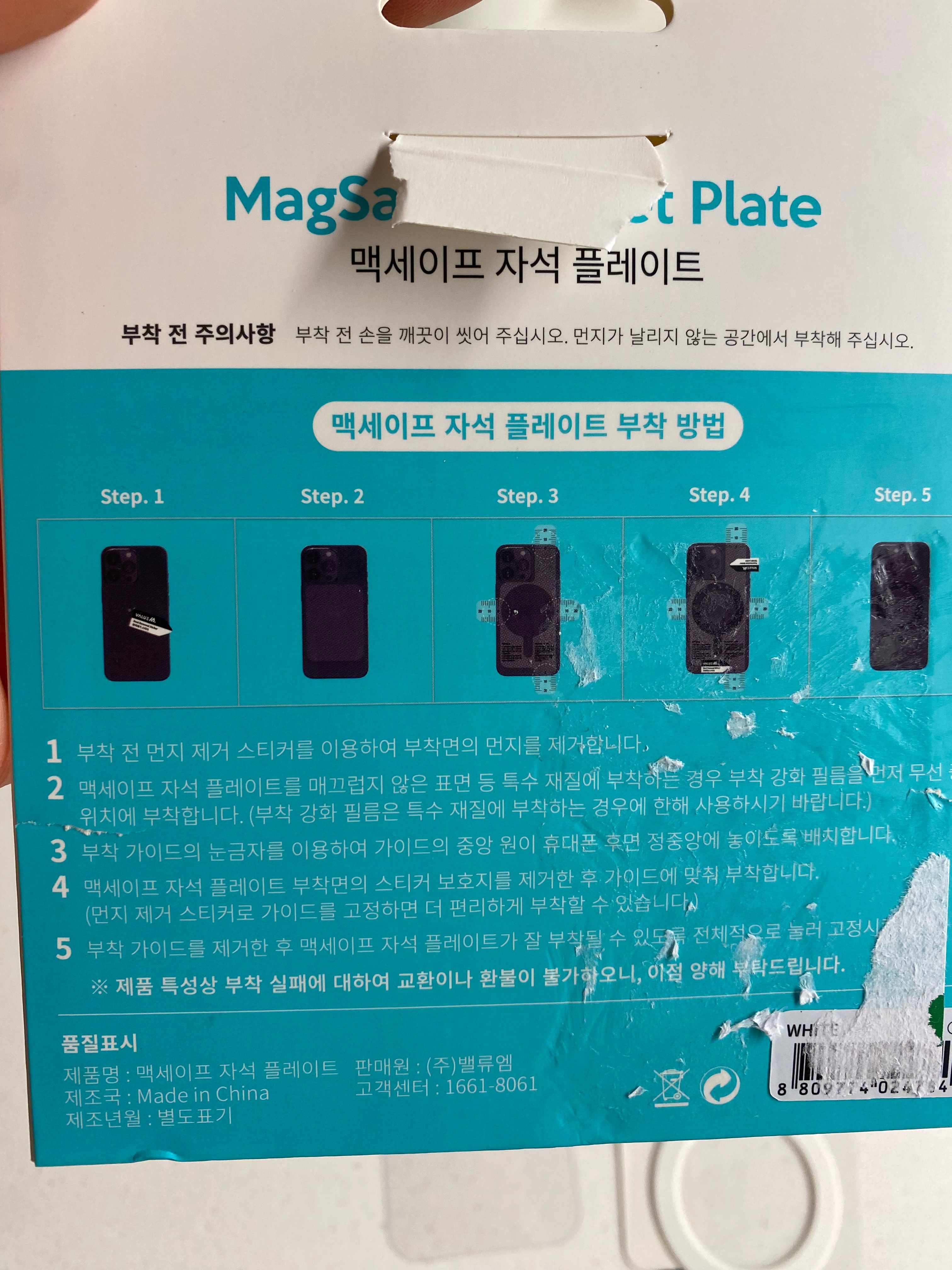 그런데 말입니다. 암만 봐도 설명서가 없지 뭡니까? 상자를 버리려다 다시 찬찬히 살펴보니 뒷면에 설치 방법이 나와 있는데 이런 줸장할~~!! 바코드 상품 스티커가 절반을 가리고 있어서 그거 때 낸다고 식겁했습니다. 힘들게 때 내고 부착 방법에 대해 글을 읽어보고 나름 힘들게 핸드폰 케이스에 부착을 시켰습니다.