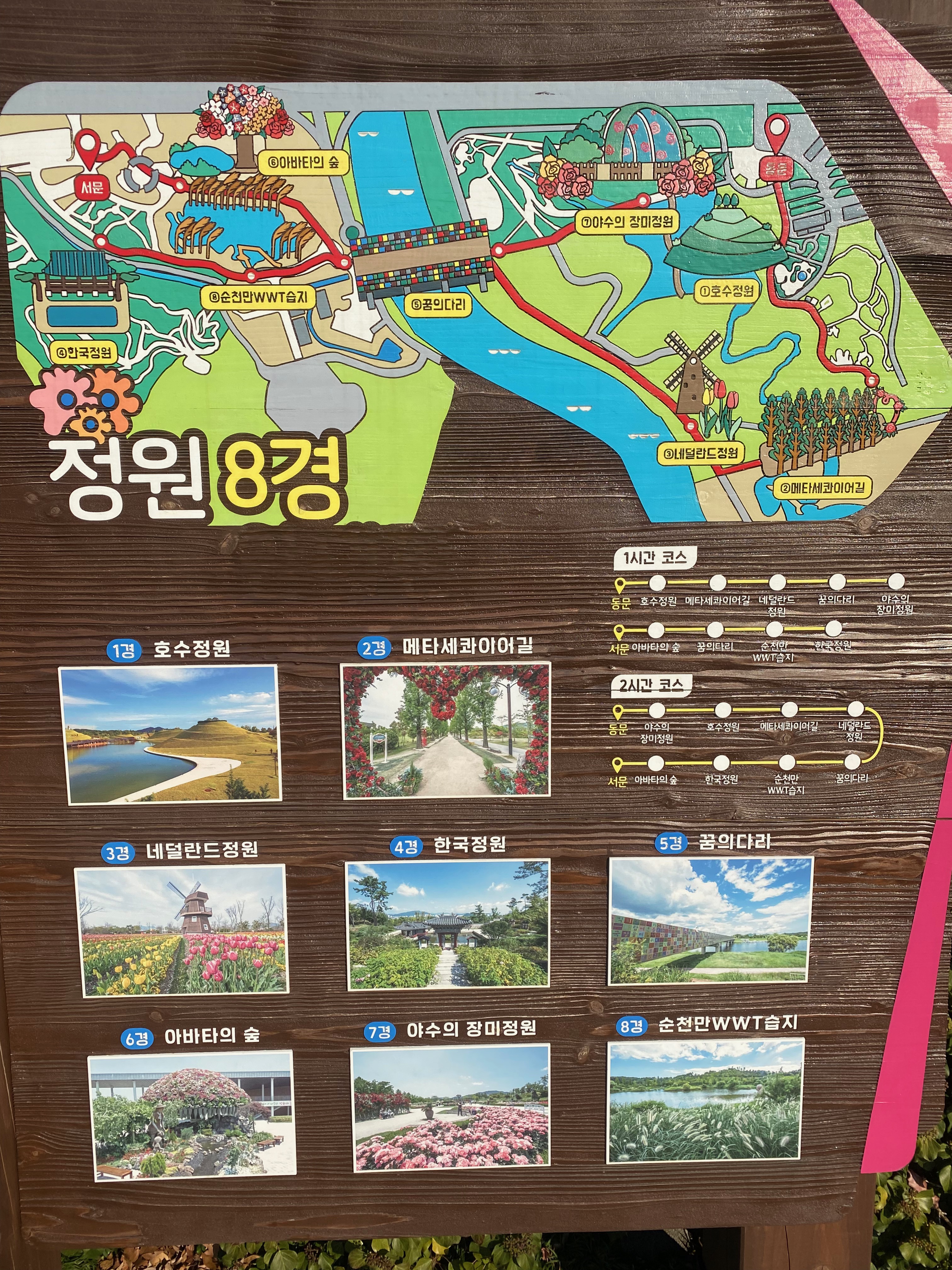 요 표지만도 그냥 있으니께 찍어놨던 건데 다녀와서 사진 정리하면서 보니 요긴한 정보입니다. 위에 나와있는 아기자기한 그림들이 순천만 국가 정원 전체 모습이고 습지는 빠져있습니다. 서문 코스와 동문 코스 중간에 꿈의 다리가 동서를 연결하는 연결통로입니다. 그러니 국가정원만 보는 걸로 해도 충분히 나들이를 즐길 수가 있습니다. 정원만 따져도 엄청 넓습니다. 아이 있는 집은 절대 정원을 하루 만에 다 구경하기 힘들 겁니다. 왜냐면 여기는 탈거리가 없거든요. 무조건 뚜벅이었습니다.(겨울이라 탈거리가 없을 수도 있지만요)