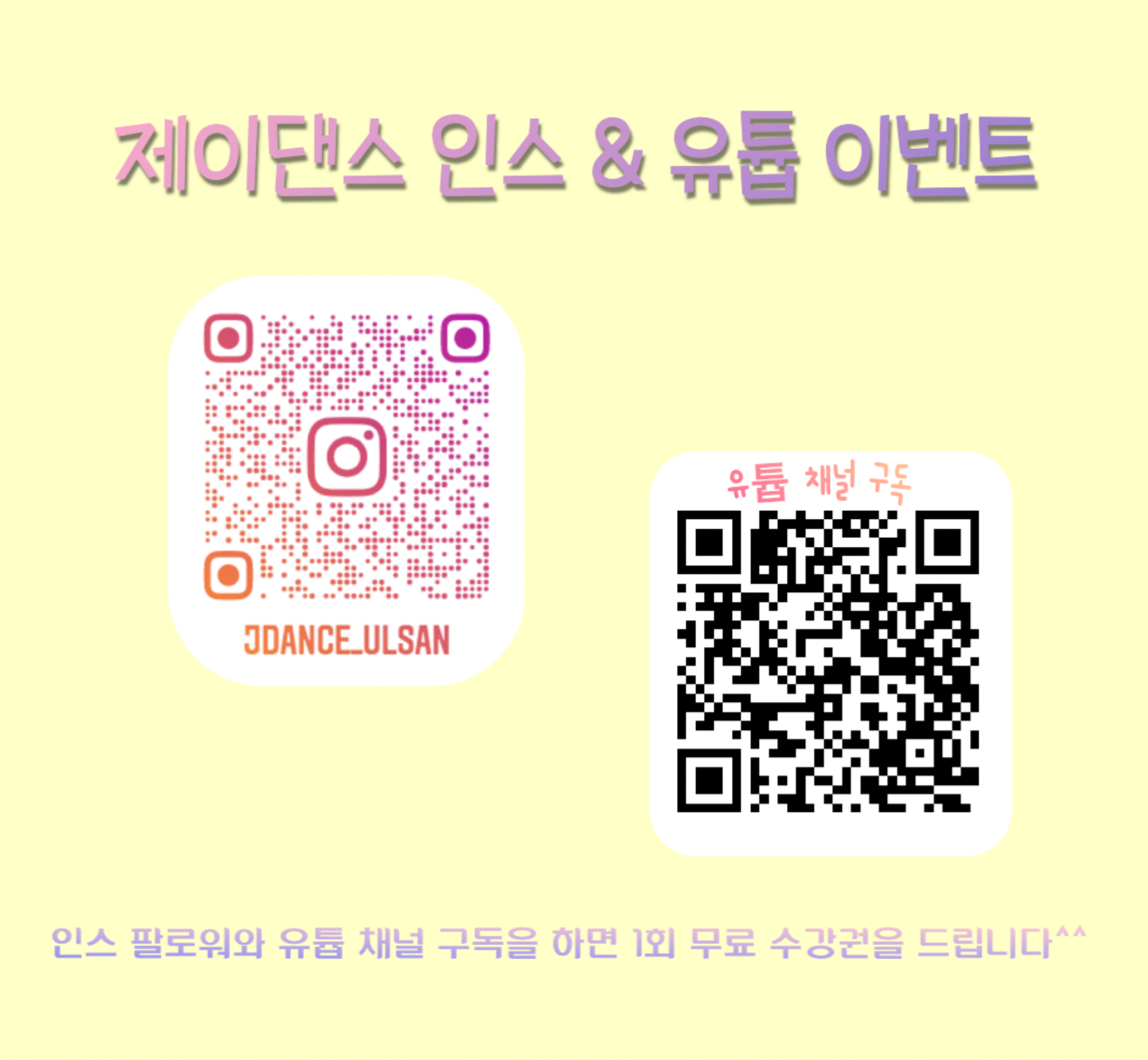 제이댄스 학원의 인스타 & 유튜브 팔로워와 채널 구독하기를 누르면 최신 수업 영상도 즐길 수 있고 더불어 제이댄스 학원에서 진행하는 모든 클래스 수업 중 하나를 선택해 1회 무료 수강 혜택도 누릴 수 있습니다. 지금 바로 QR코드로 간편하게 제이댄스와 친구가 되어 주세요^^